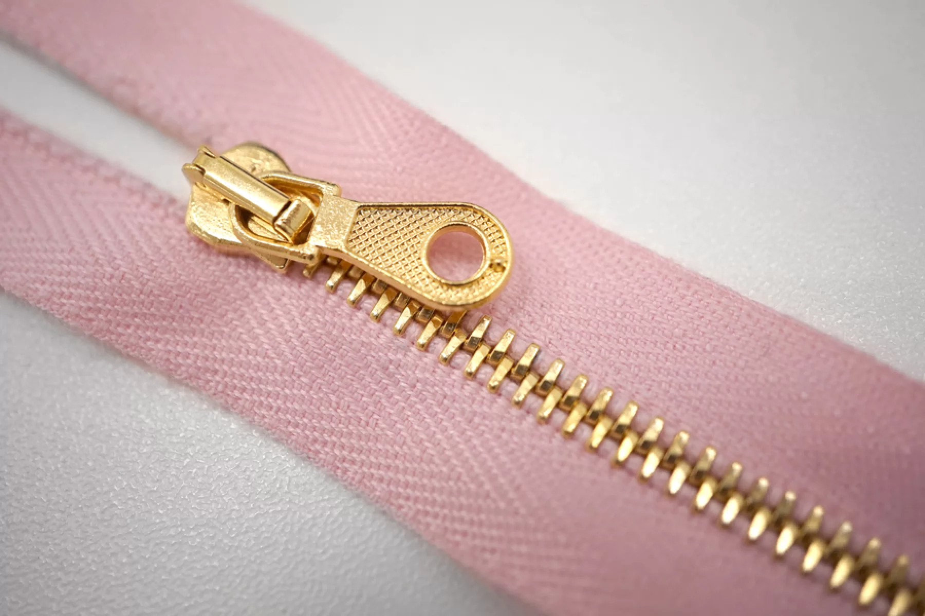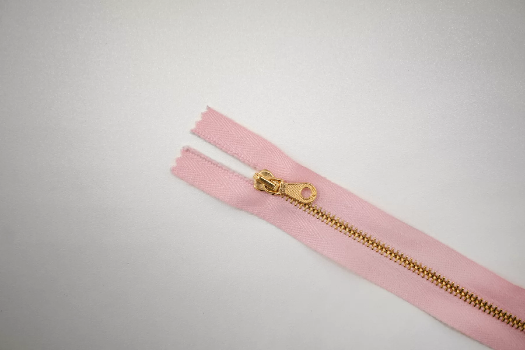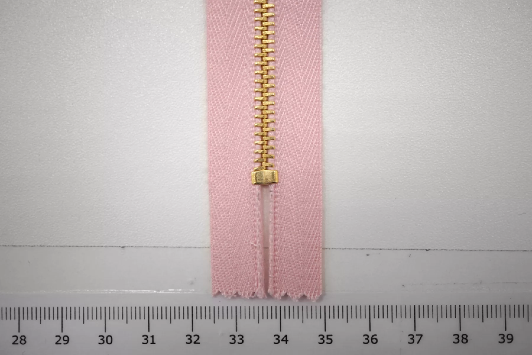 Молния от "Lampo" неразъемная, нежно-розовая, цвет зубцов желтое золото. Длина 39 см.