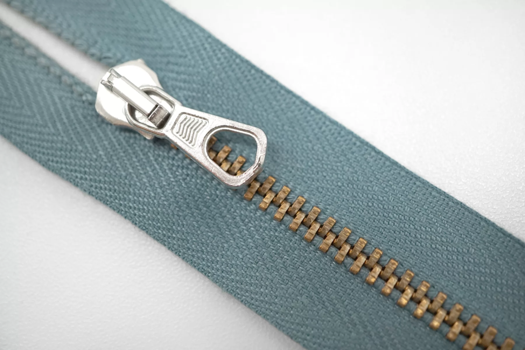 Молния металлическая от "Lampo" неразъёмная, приглушенно-голубая, цвет зубцов золотистый, пуллера и слайдера - серебристый. Длина 11 см.