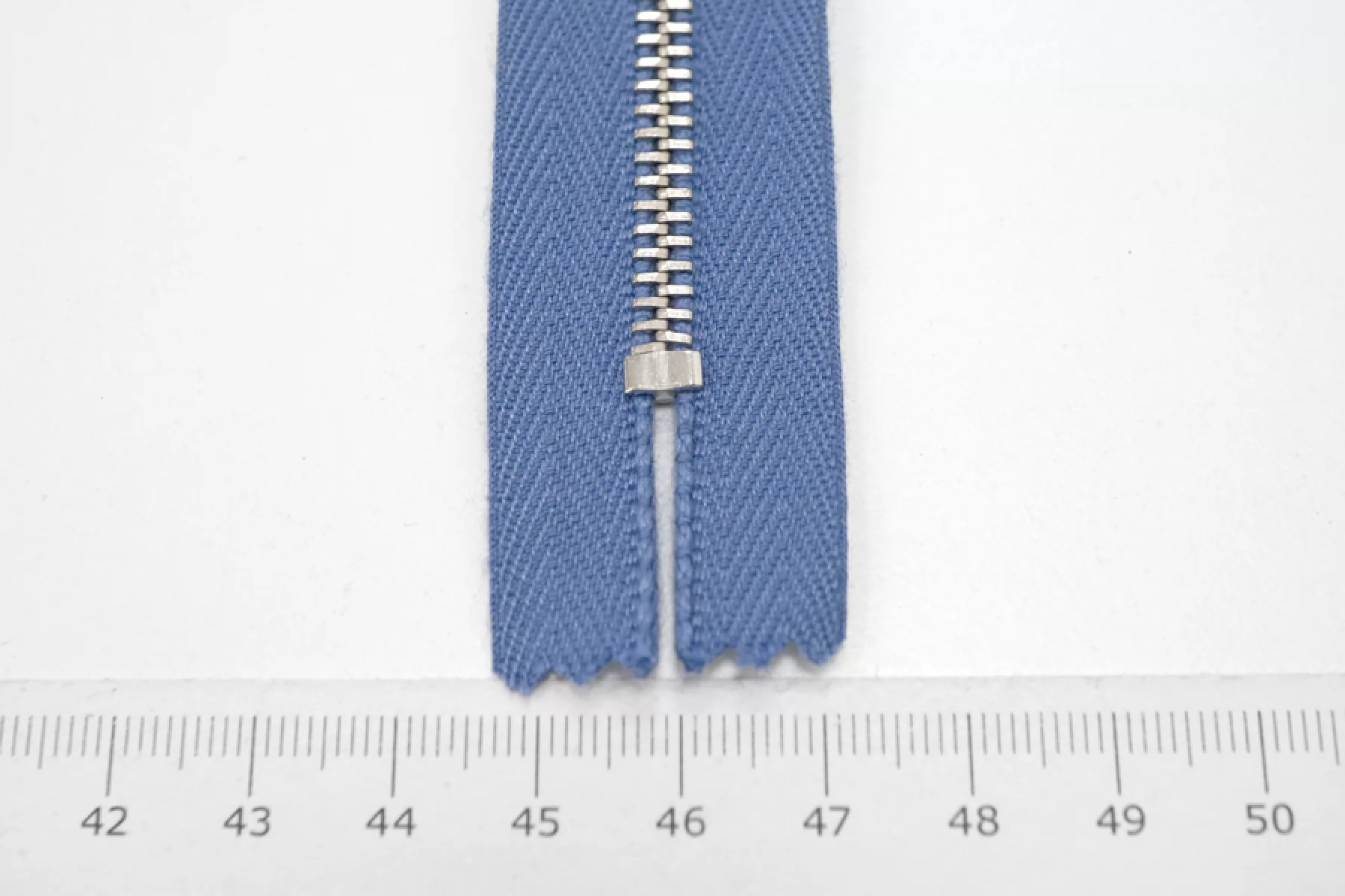 Молния от "Lampo" неразъемная, приглушенно-голубая, цвет зубцов серебристый. Длина 12 см.