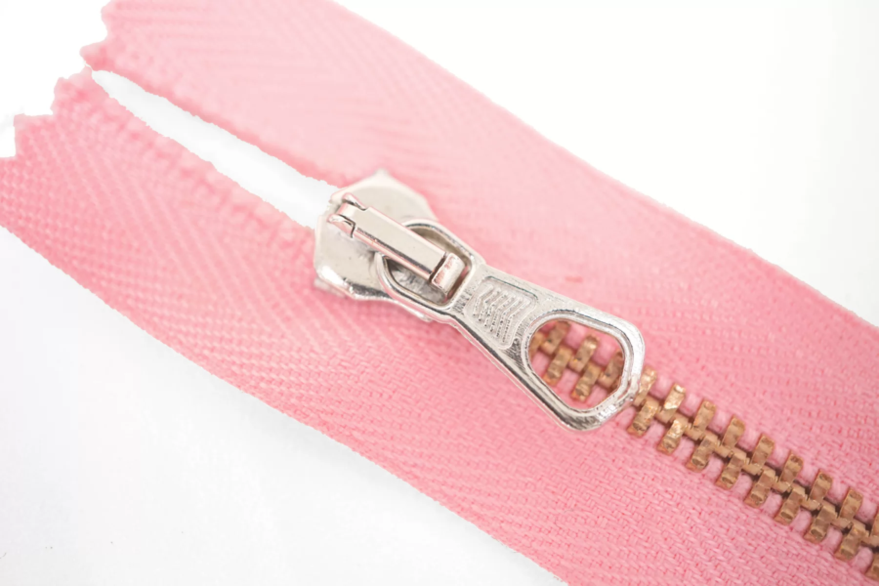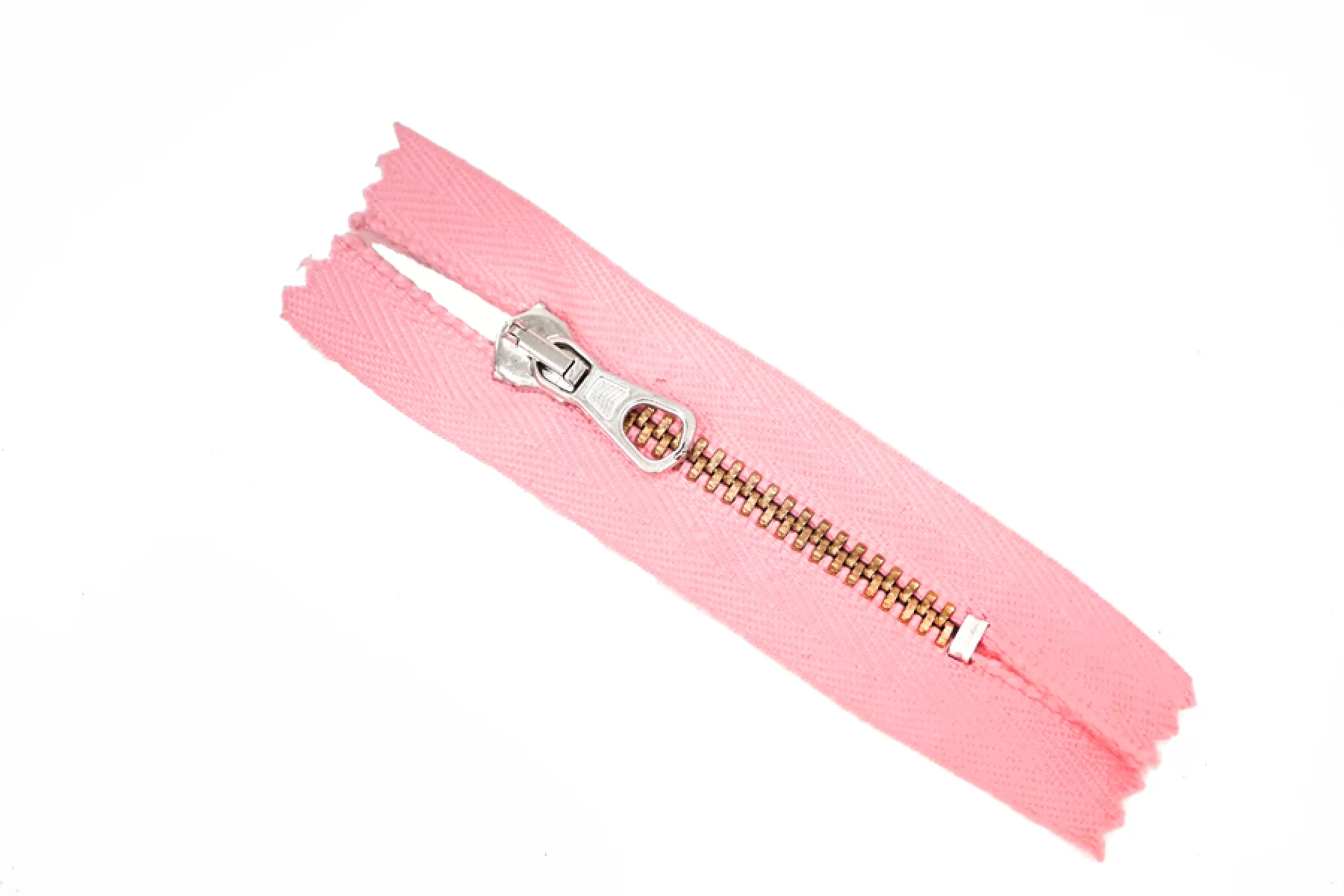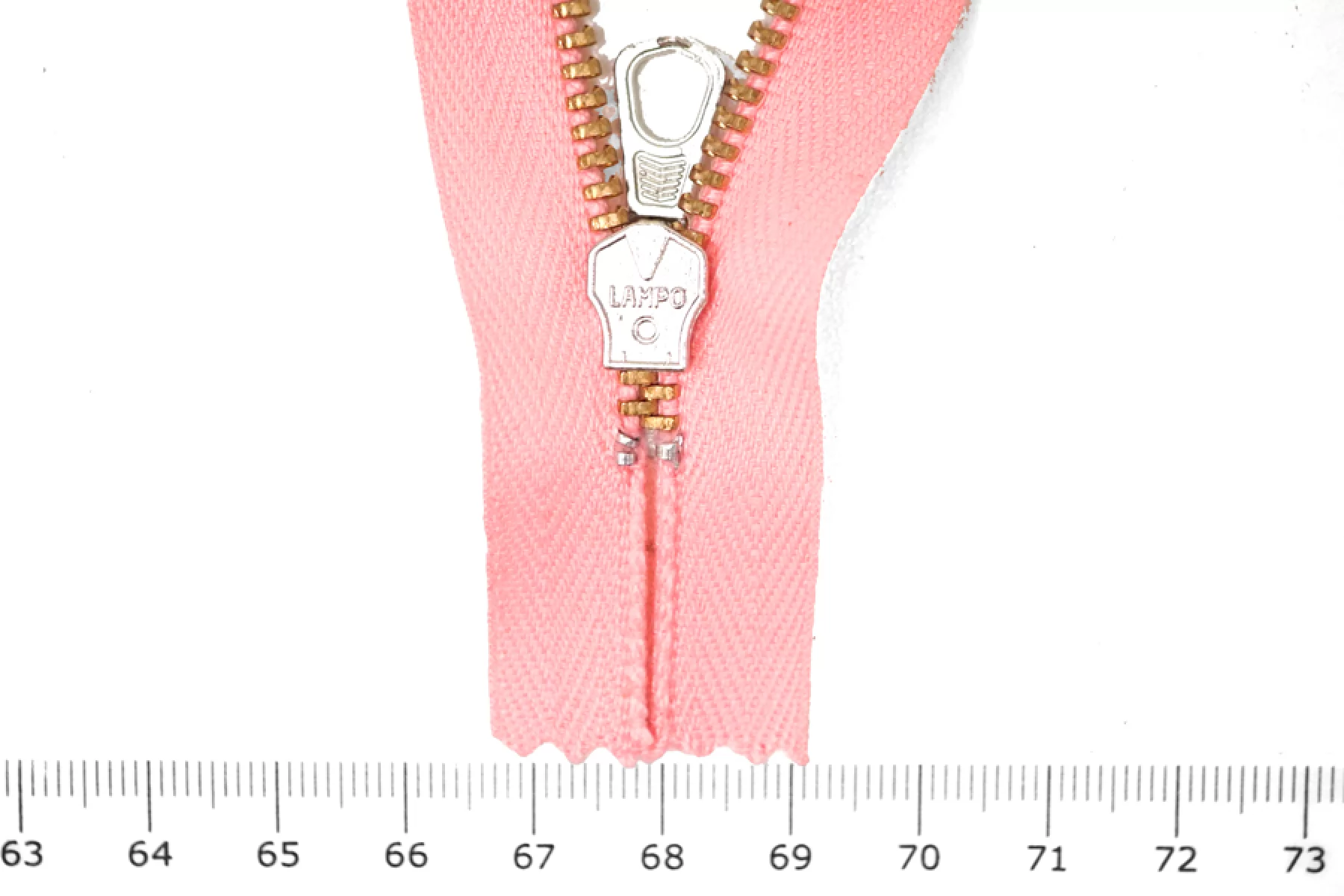 Металлическая молния "Lampo" неразъёмная, один замок, розового цвета. Цвет зубцов металлический никель, слайдер и пулер металлические серебристого цвета. Длина 6,5 см. Ширина молнии 2,6 см. Ширина зубцов 4 мм.