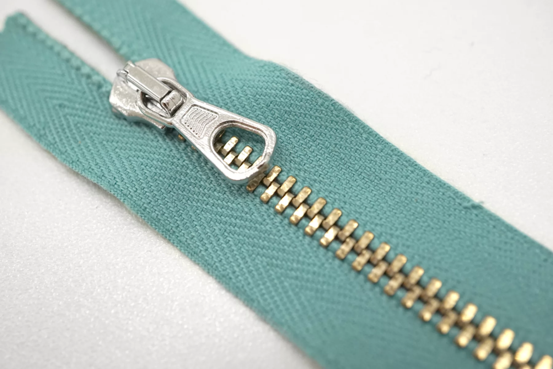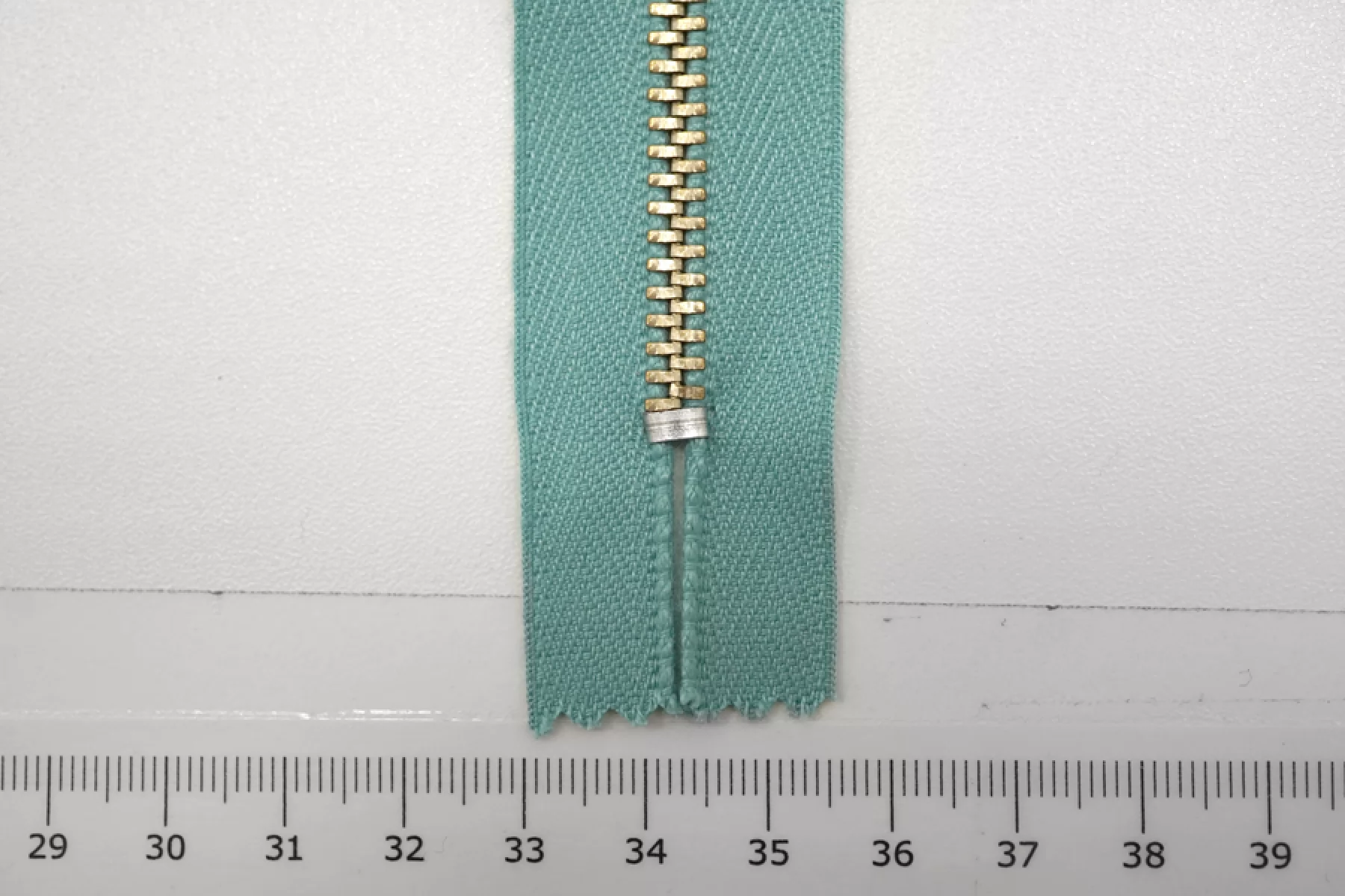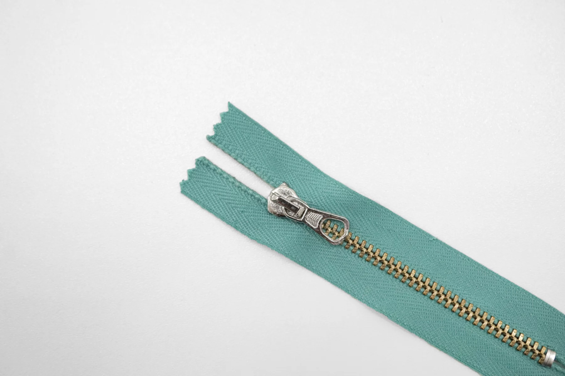 Молния от "Lampo" неразъемная, слабо-бирюзового цвета, цвет зубцов золотистый, слайдер и пуллер серебристый. Длина 9 см.