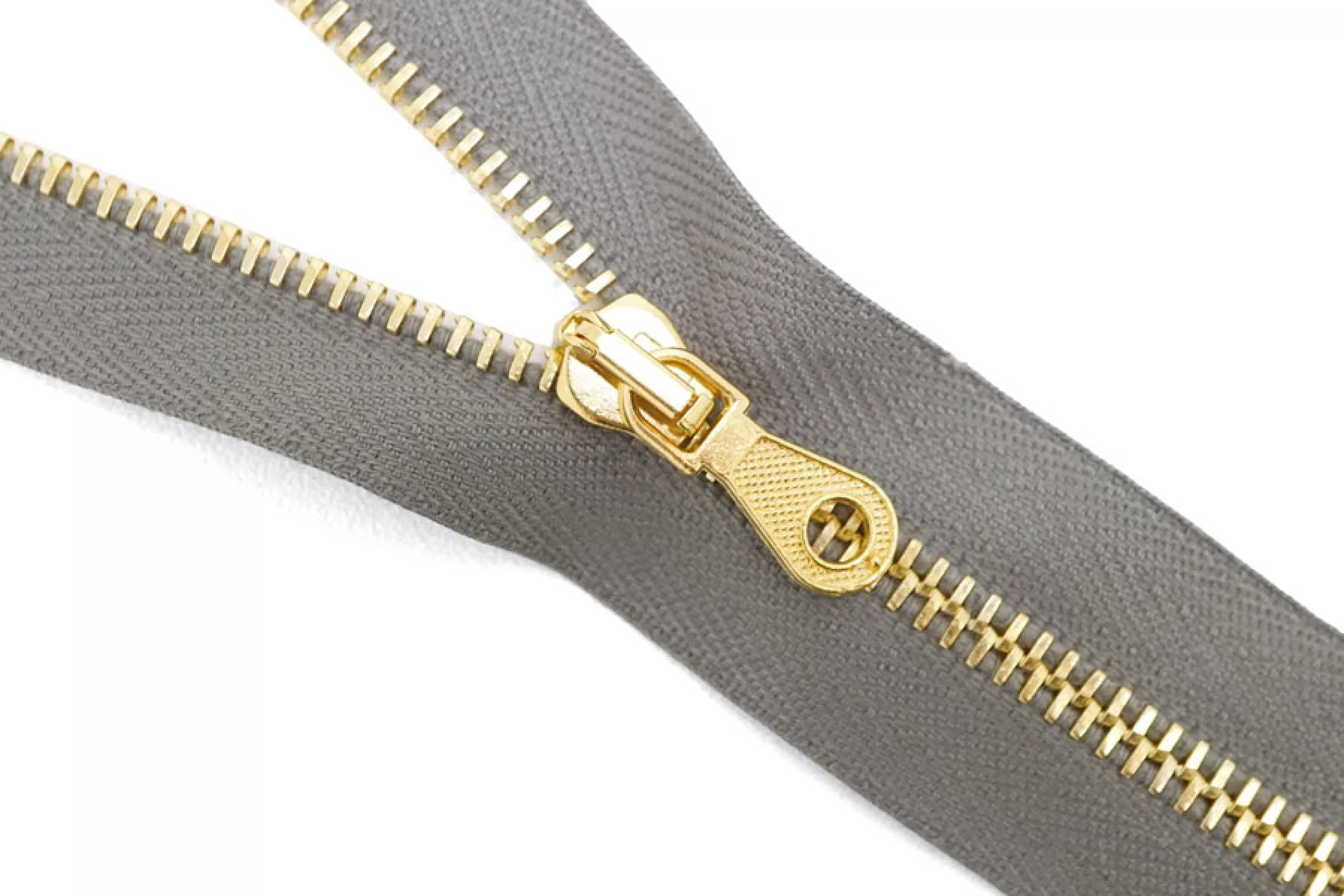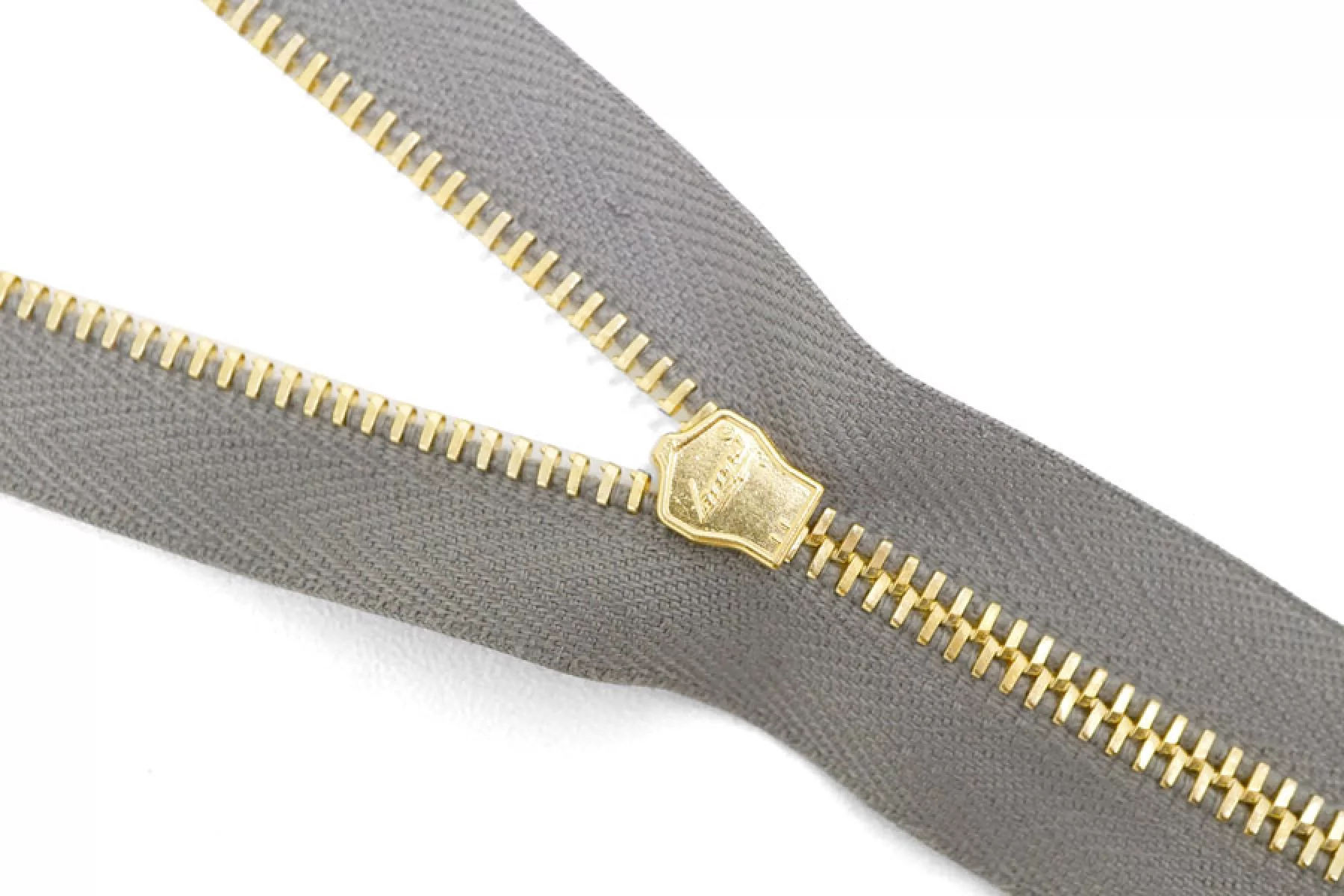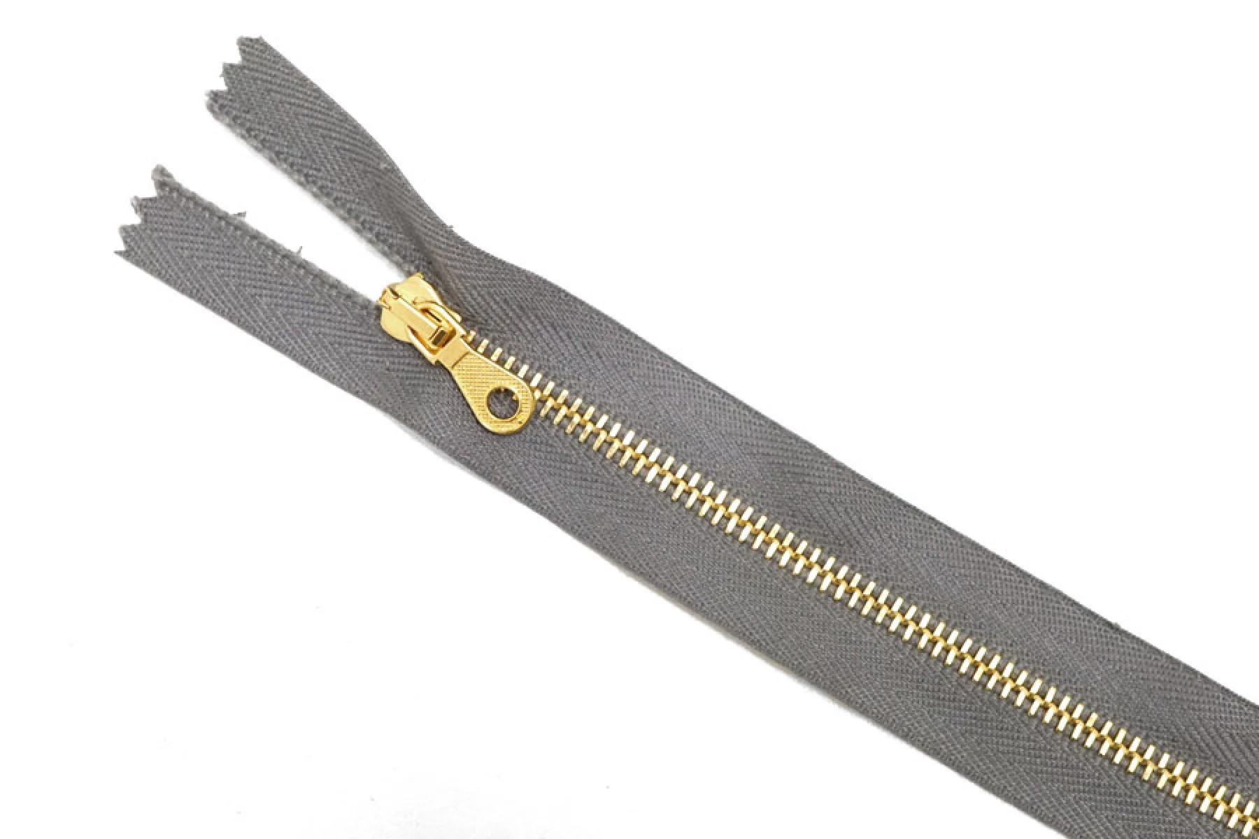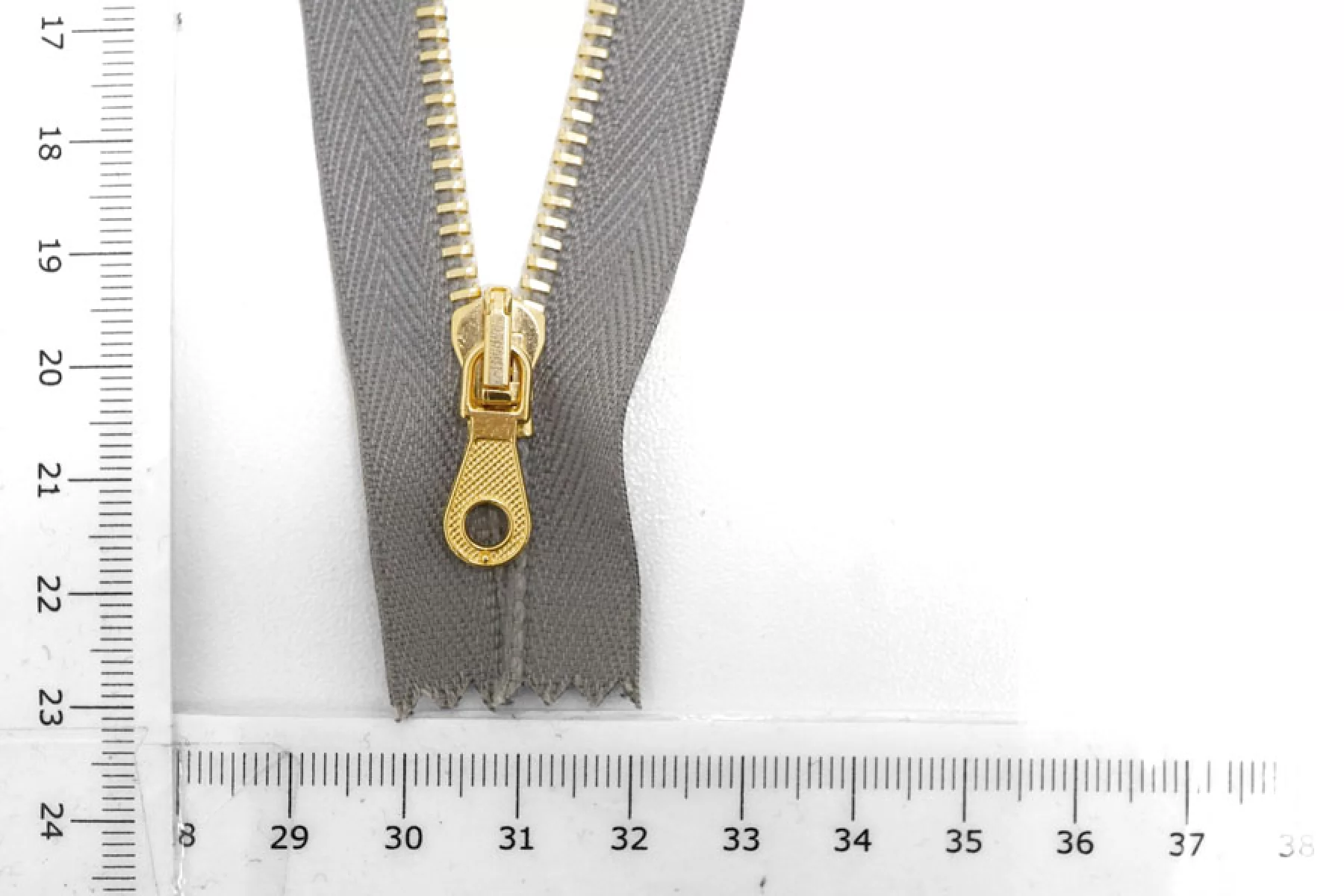 Молния от "Lampo" неразъемная, темно-серая, цвет зубцов желтое золото. Длина 16 см.