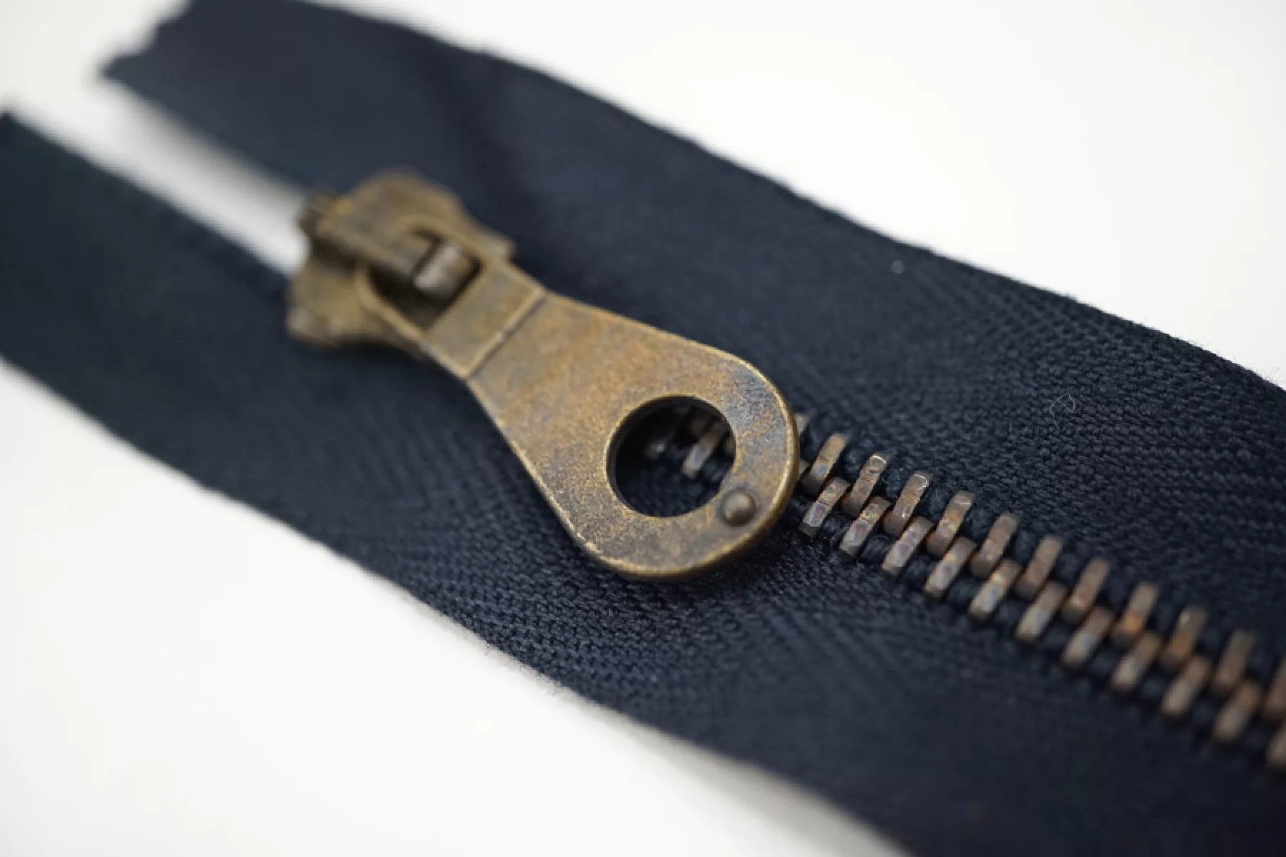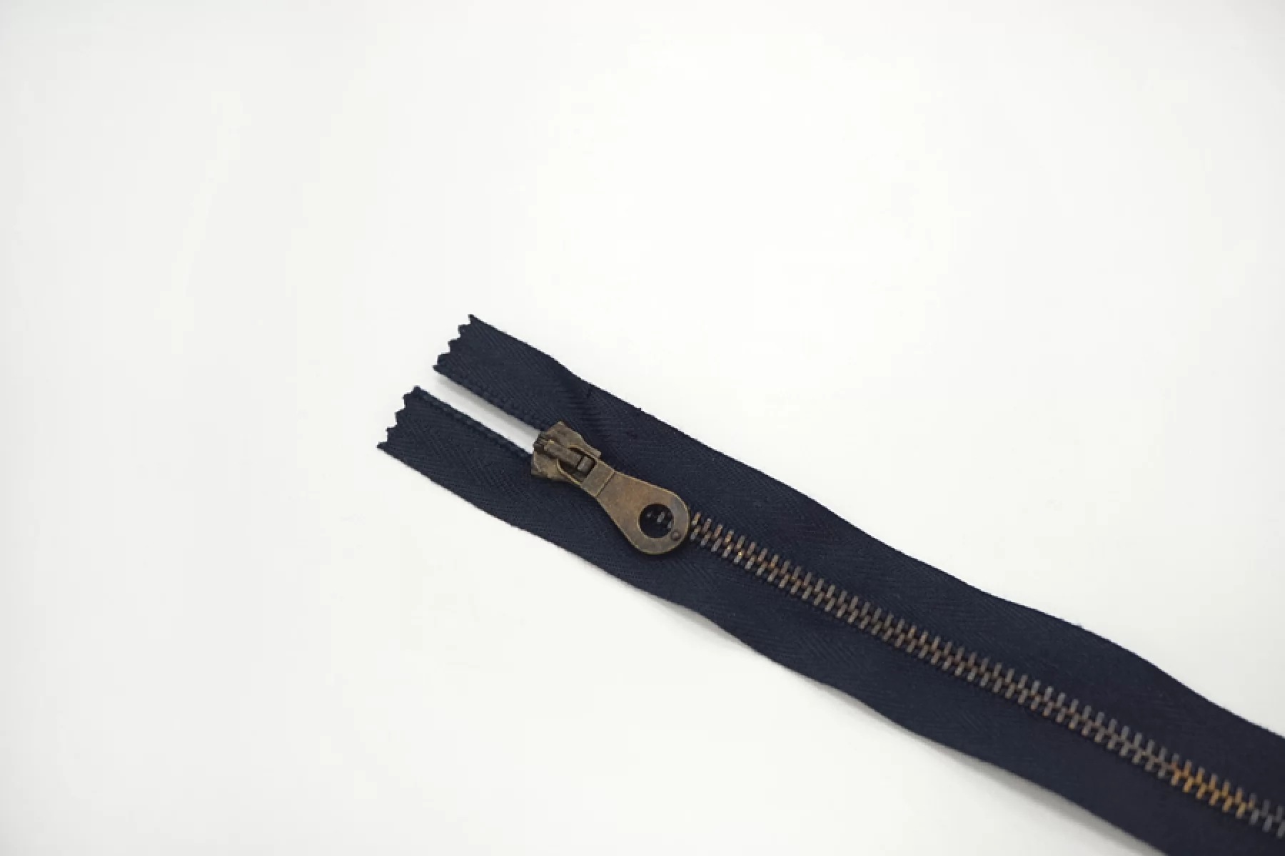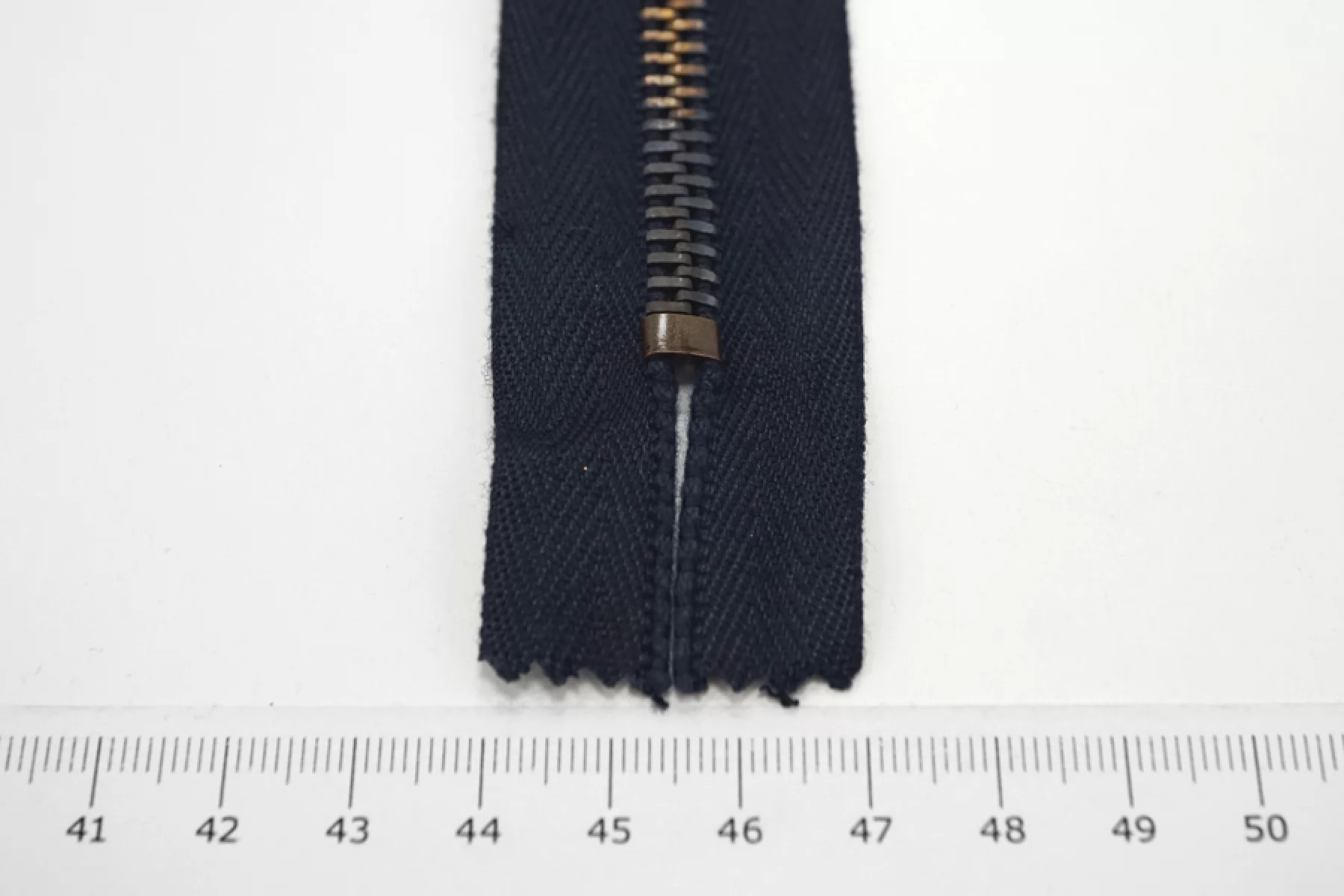 Молния от "Lampo" неразъемная, темно-синяя, цвет зубцов и крупного слайдера - бронзовый. Длина 18 см.