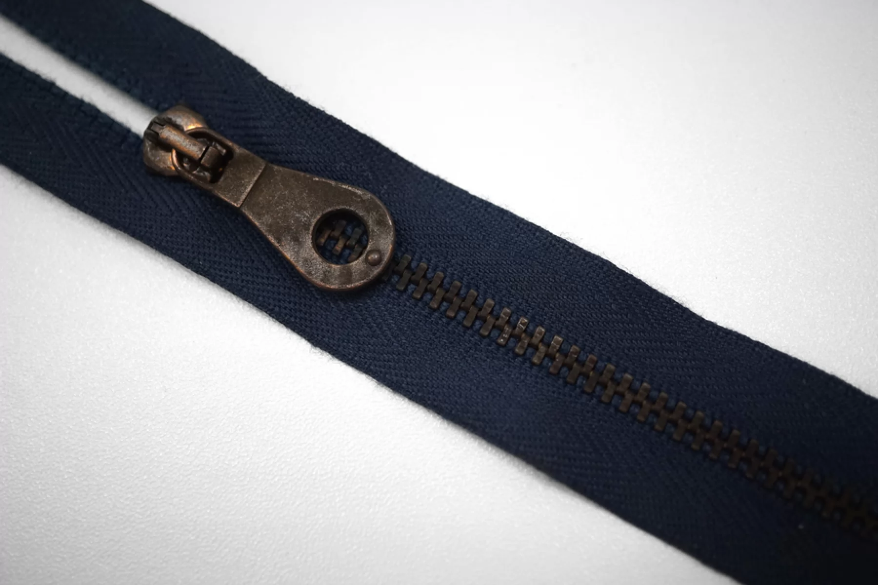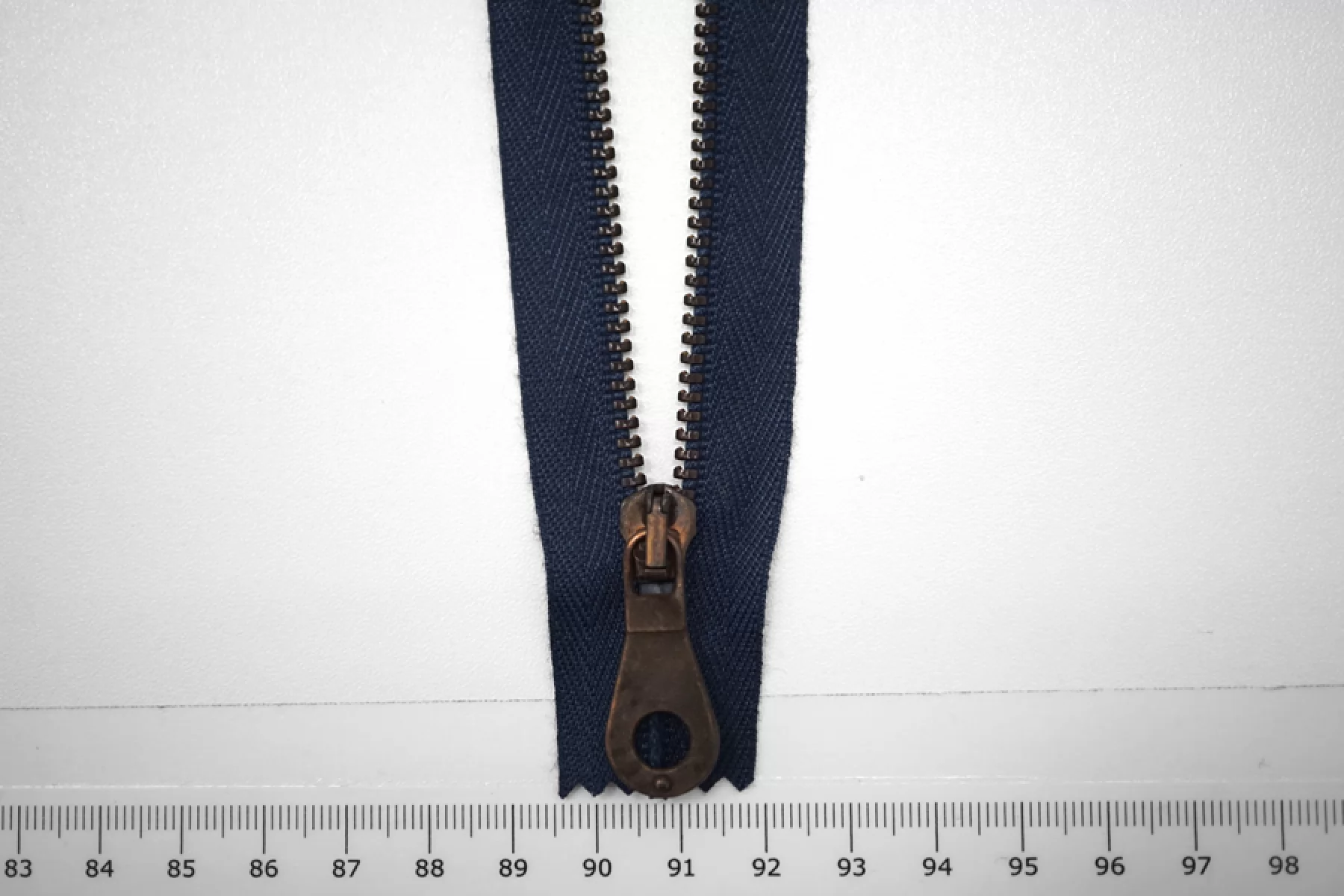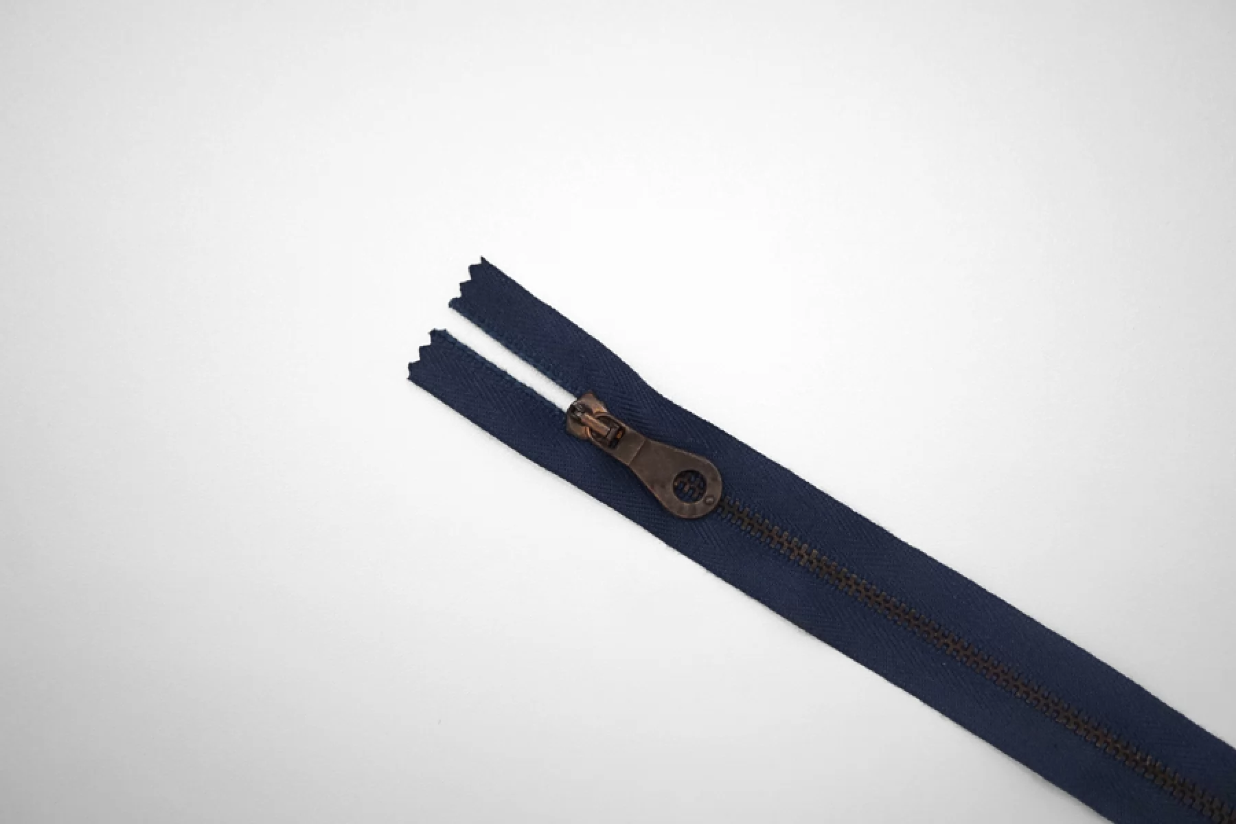 Молния от "Lampo" неразъемная, темно-синяя, цвет зубцов и крупного пуллера бронзовый. Длина 26 см.