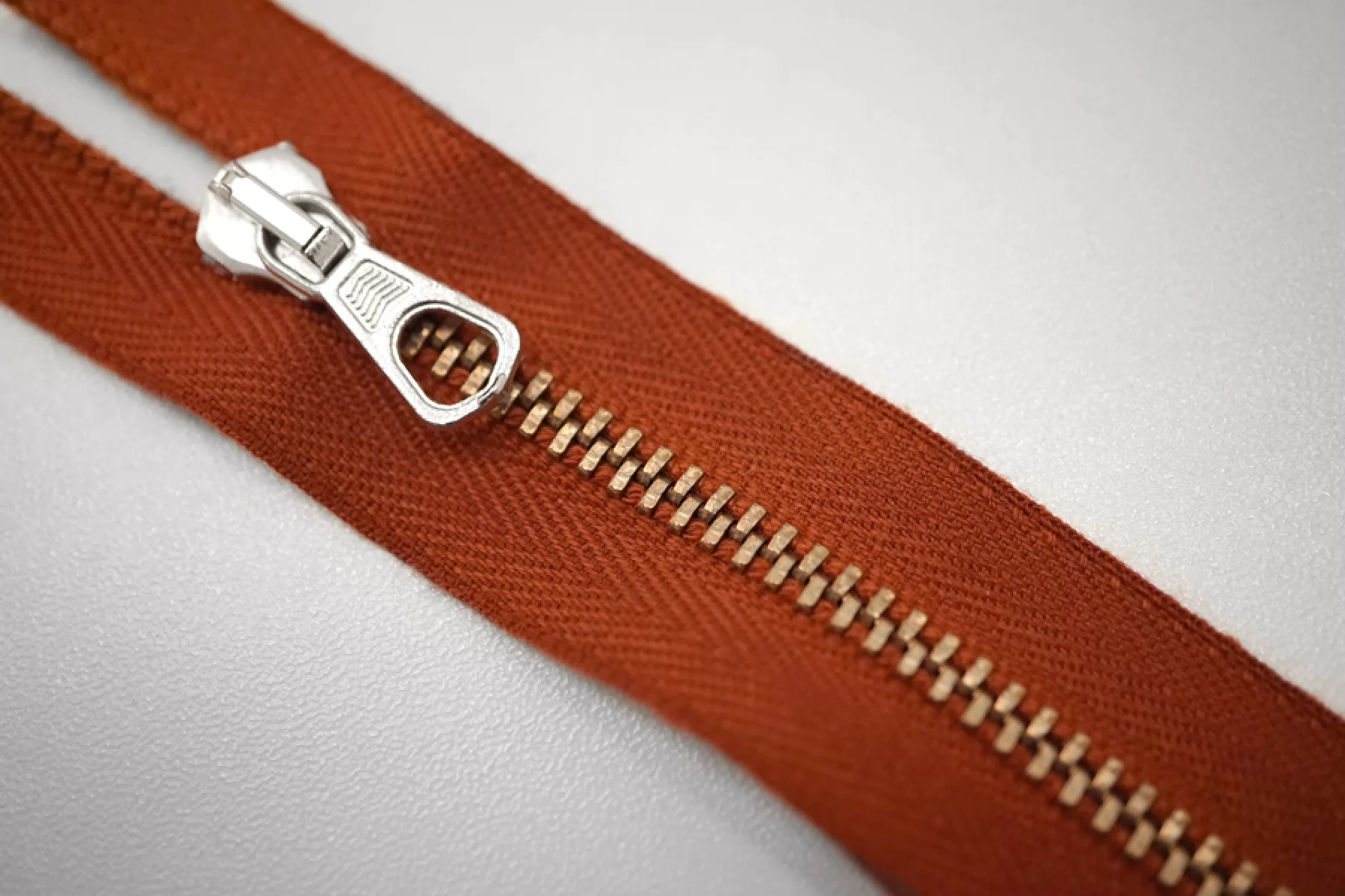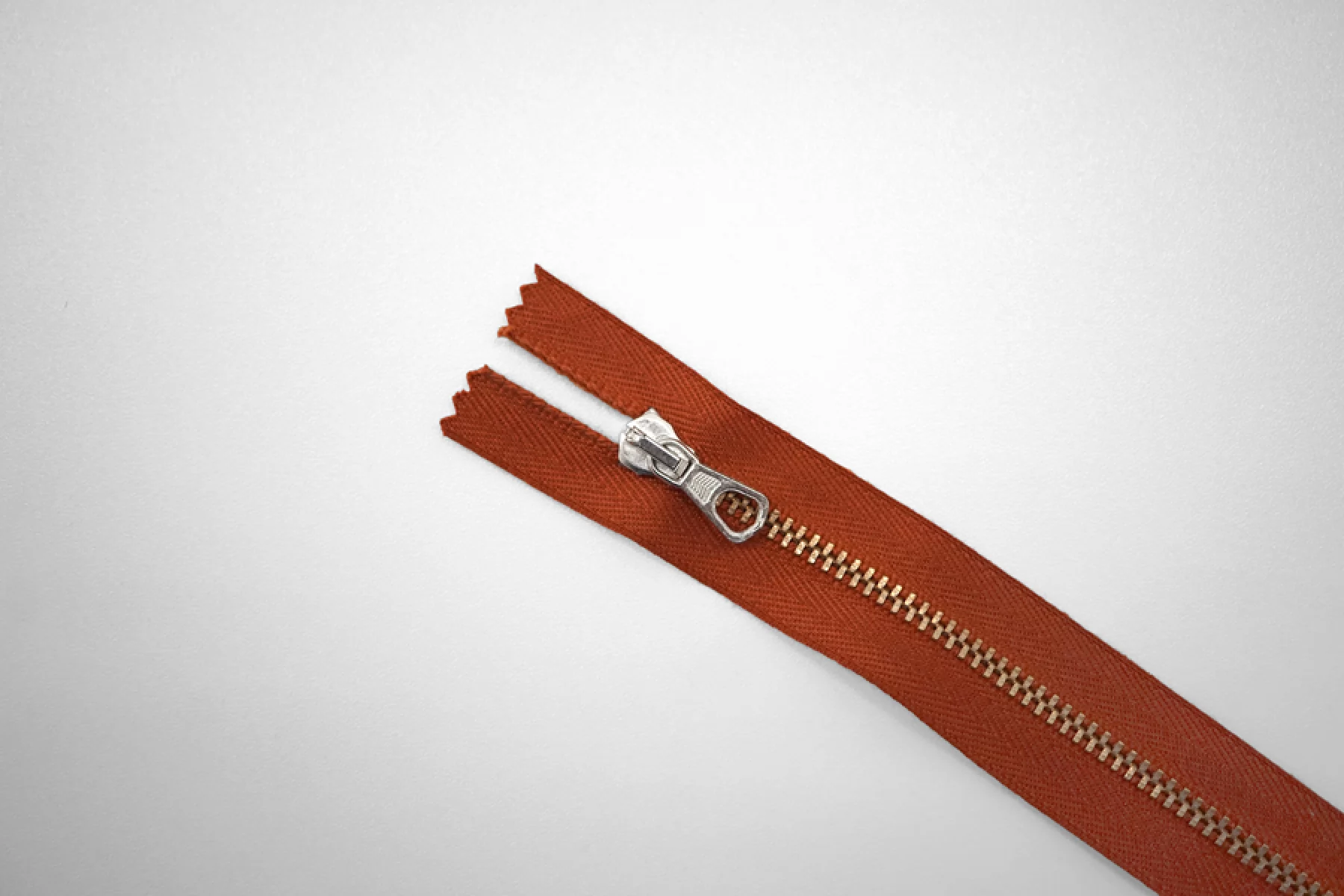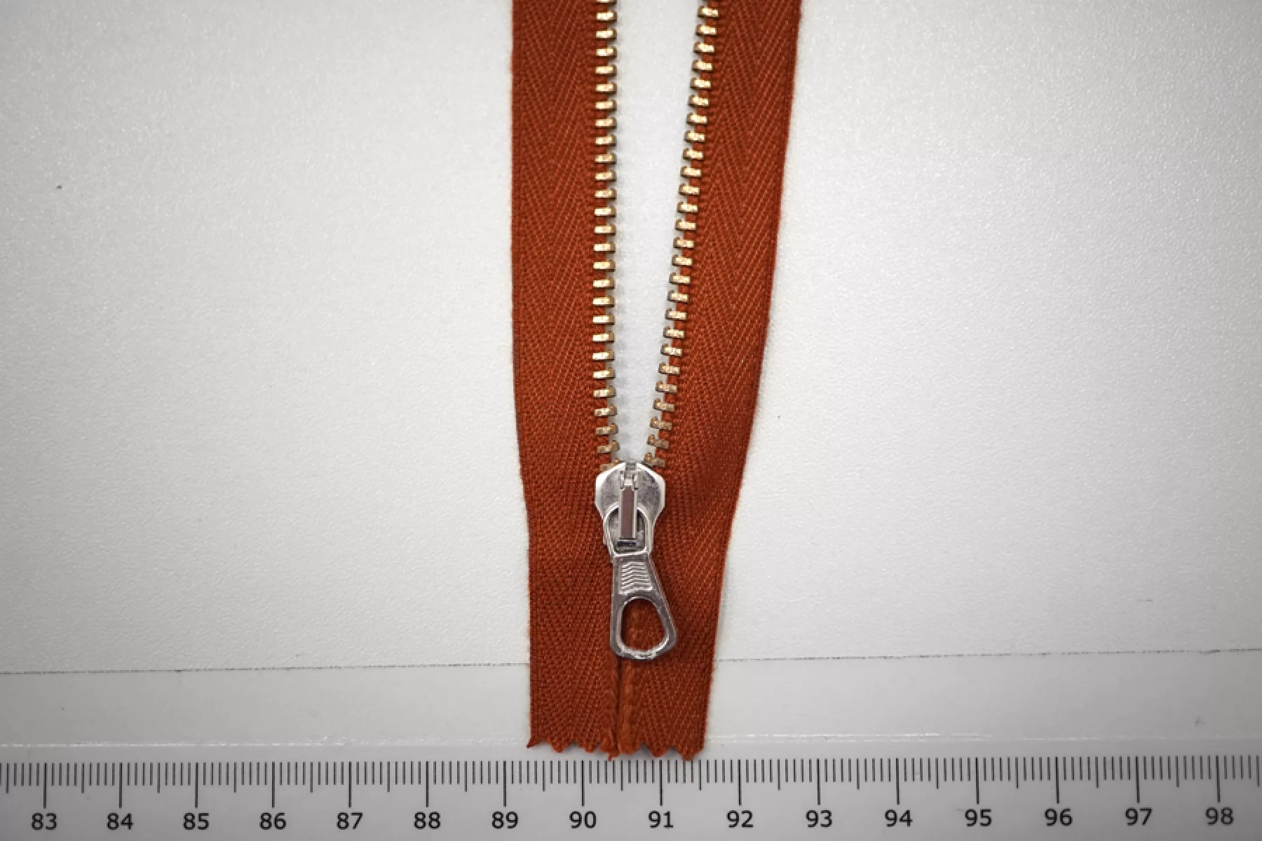 Молния металлическая от "Lampo" неразъемная, терракотовая, цвет зубцов золотистый, слайдер и пуллер серебристый. Длина 14 см.