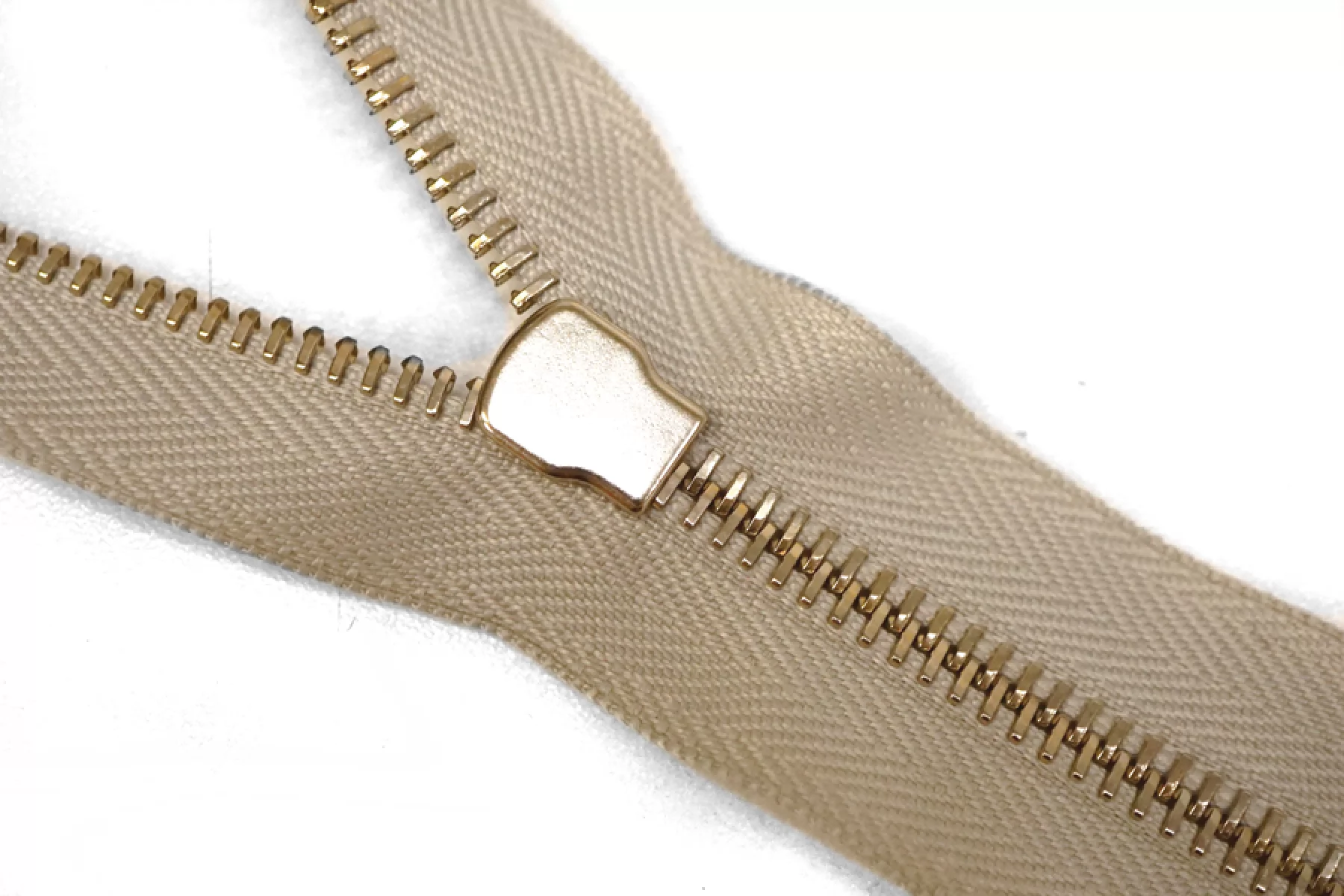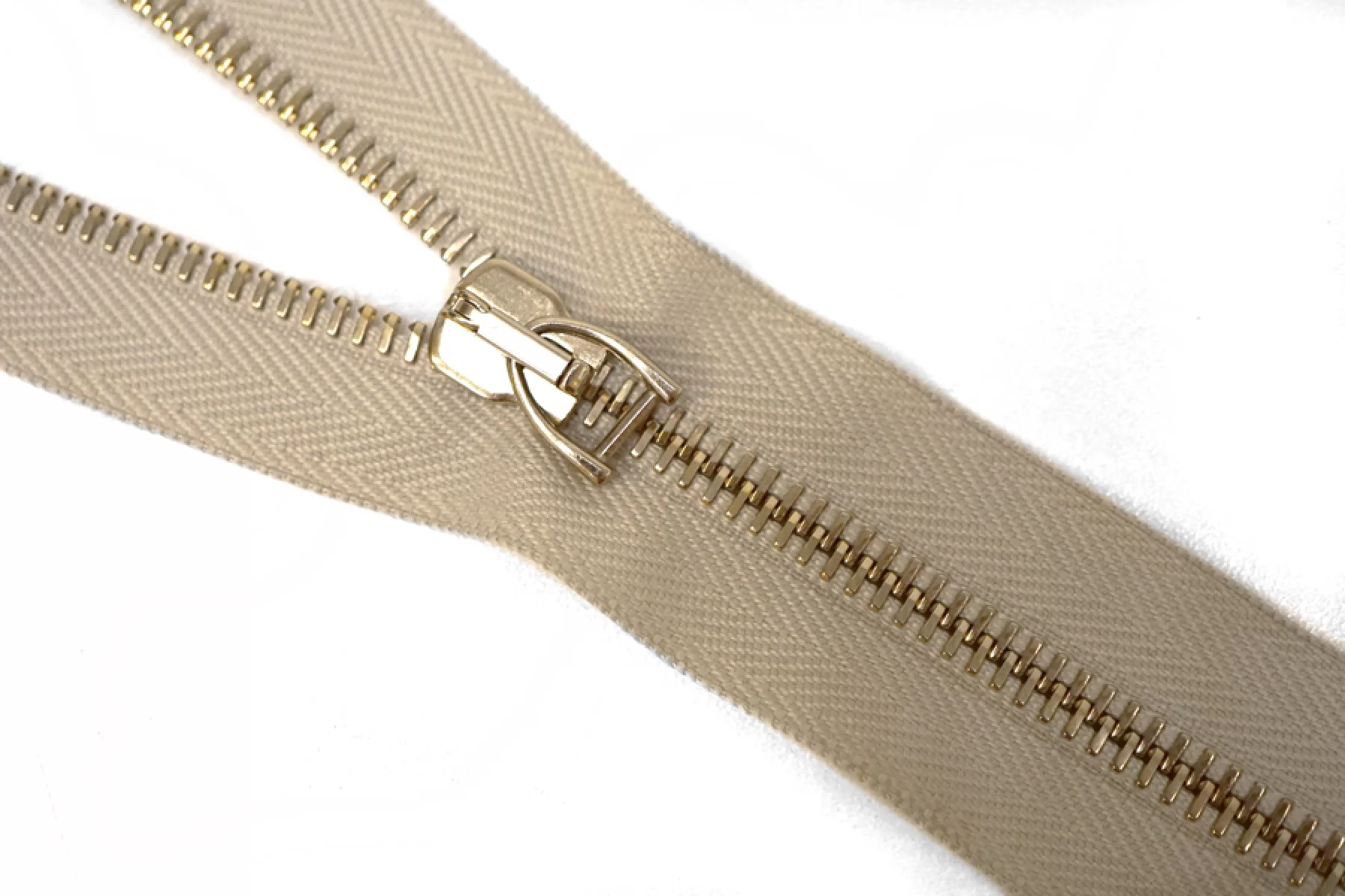 Молния металлическая от Max Mara разъемная двухзамковая. Цвет молнии бежево-серый, цвет зубцов, пуллера и слайдера золотой. Длина 99см. Ширина молнии 3см, ширина зубцов 6мм.