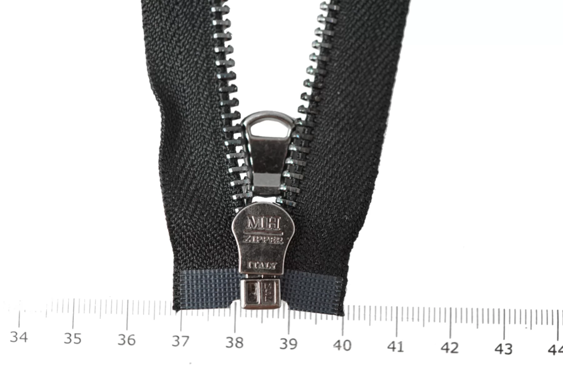Молния металлическая от MH Zipper ITALY, спиральная, разъемная, один замок. Цвет молнии черный, цвет зубцов, пуллера и слайдера черный металл. Длина 55см. Ширина молнии 3 см, ширина зубцов 6 мм.
