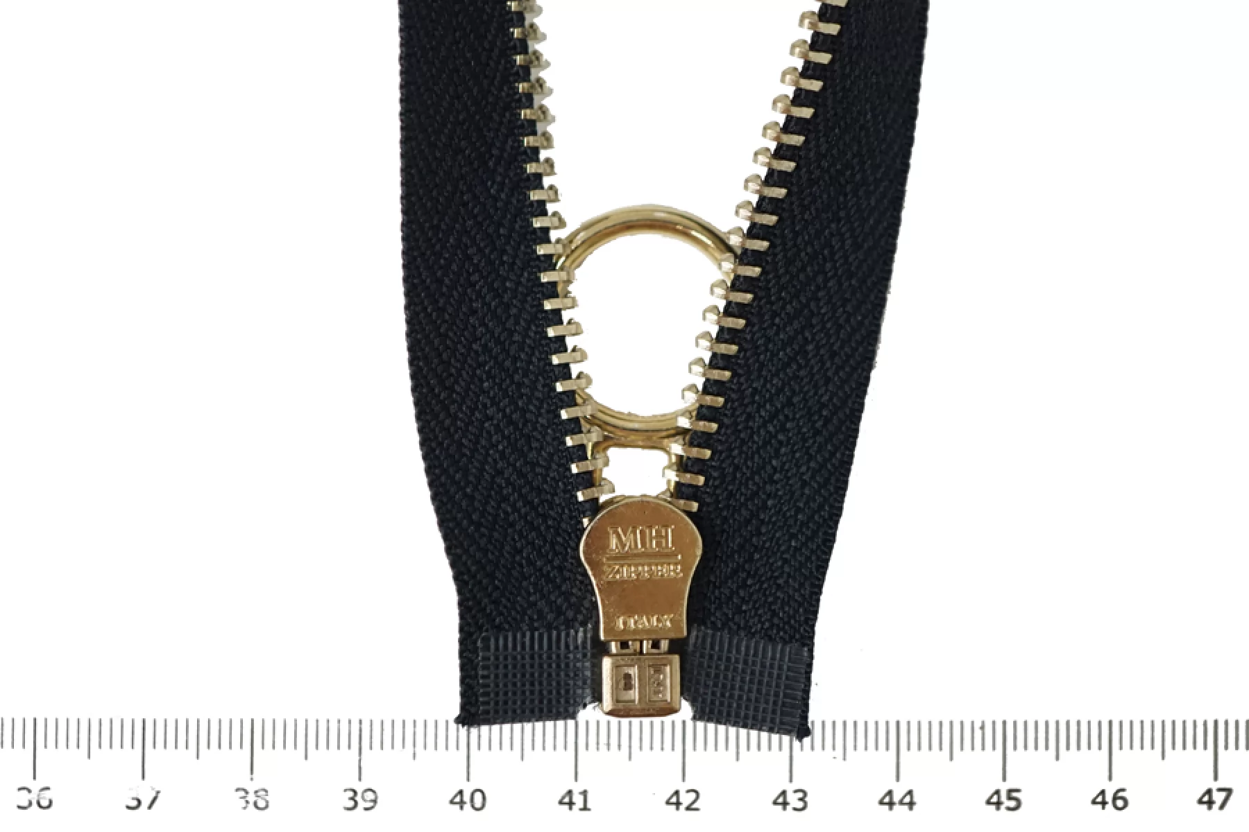 Молния металлическая от MH Zipper ITALY разъемная, один замок. Цвет молнии черный, цвет зубцов, пуллера и слайдера золото. Длина 94см. Ширина молнии 3см, ширина зубцов 6мм.