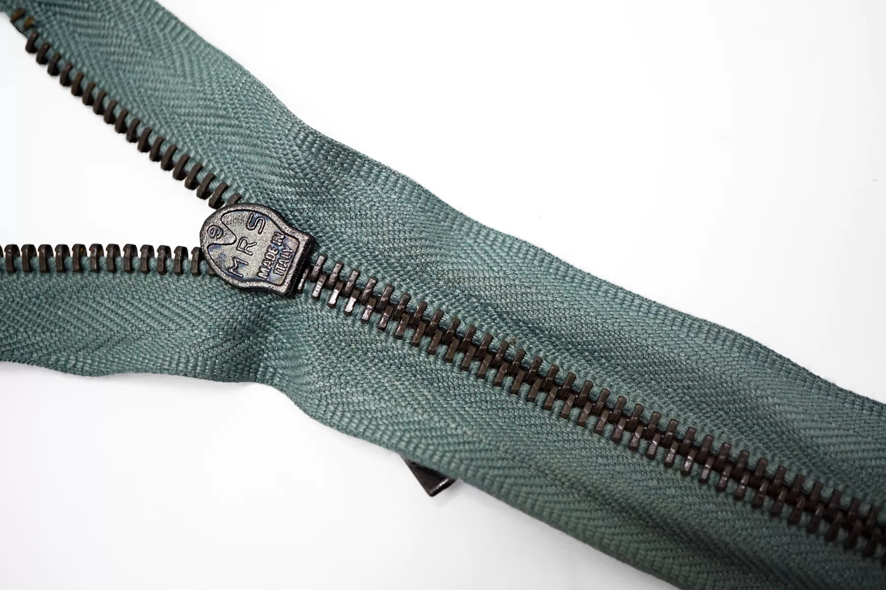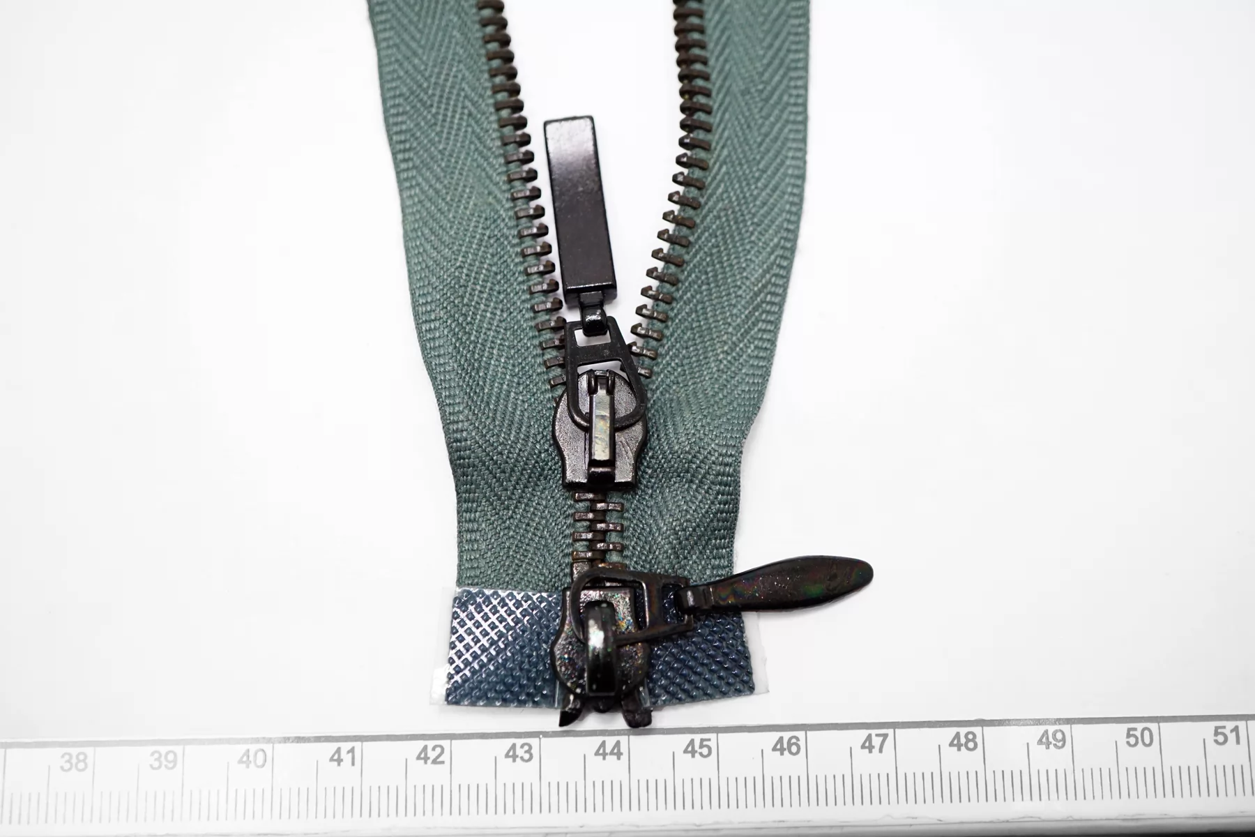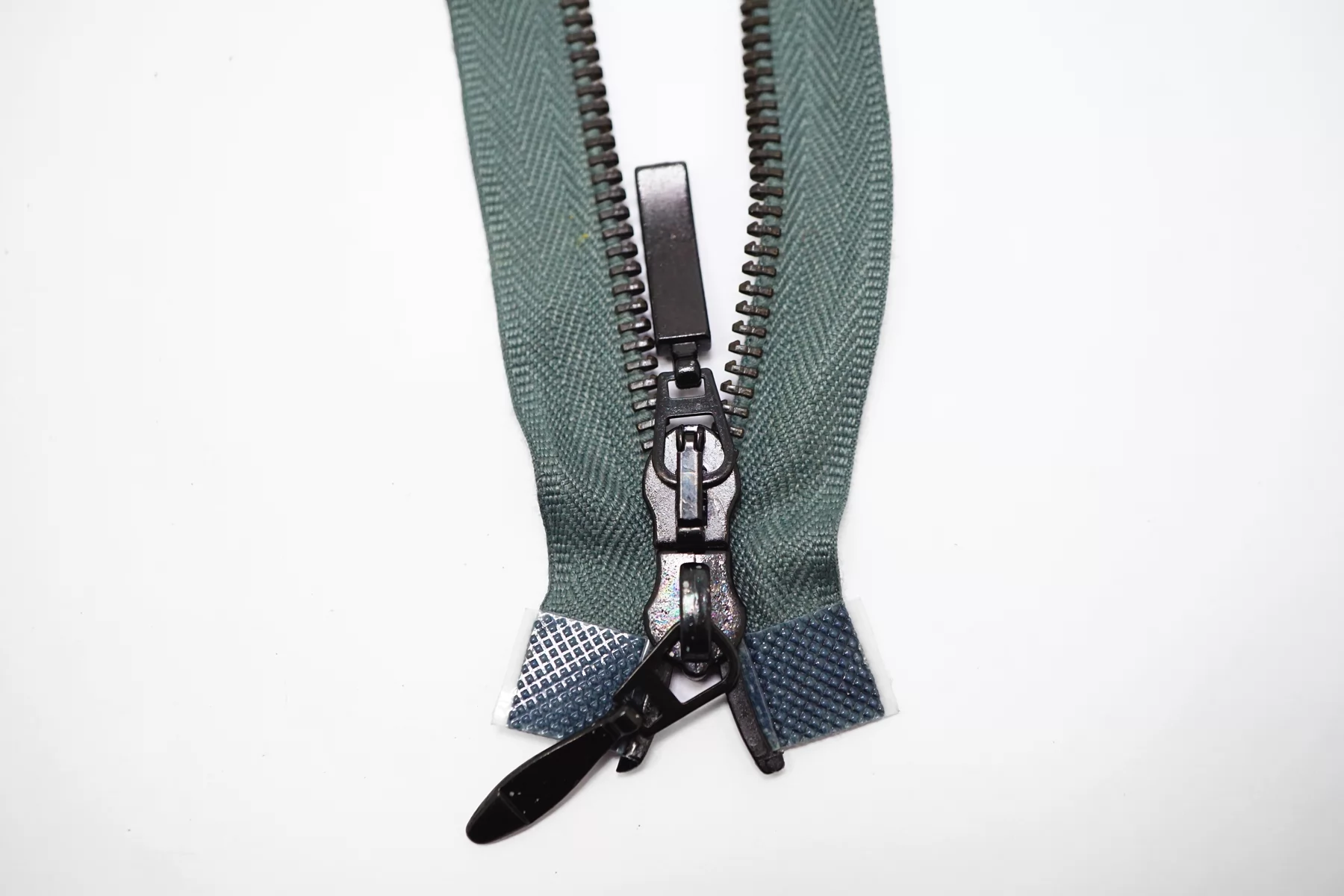 !Внимания, звенья немного пачкаются при трении, плюс на нижнем слайдере немного облуплена краска (видно на фото)! Молния металлическая MRS двухзамковая, разъёмная, оттенок зелёного шалфея, цвет зубцов чёрный никель, пуллеров-чёрный. Длина 69 см.
