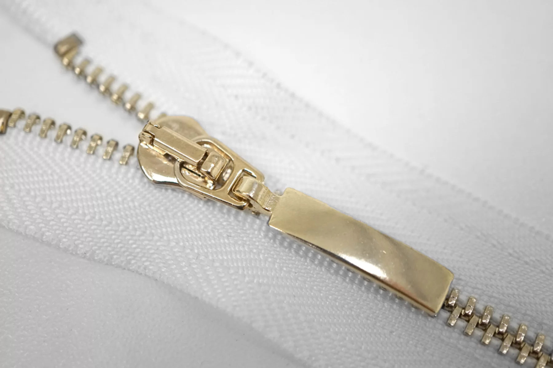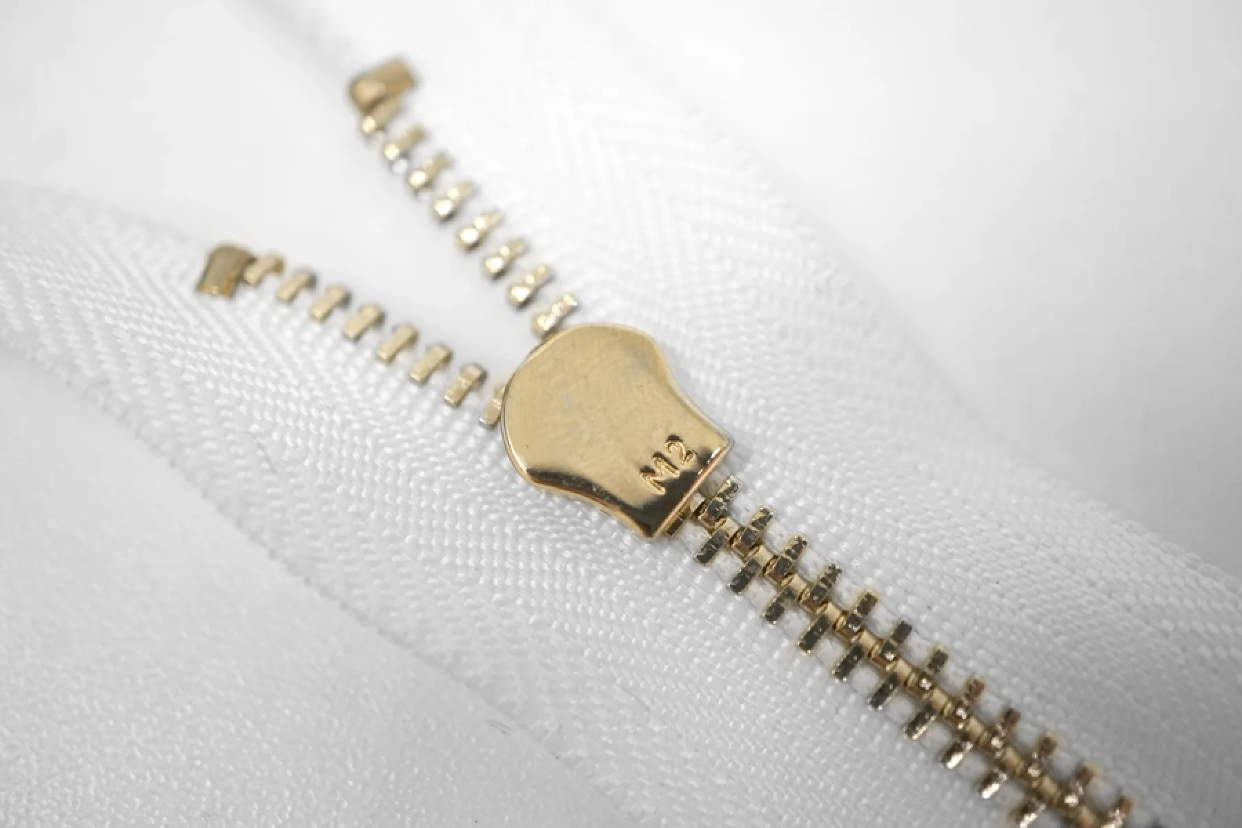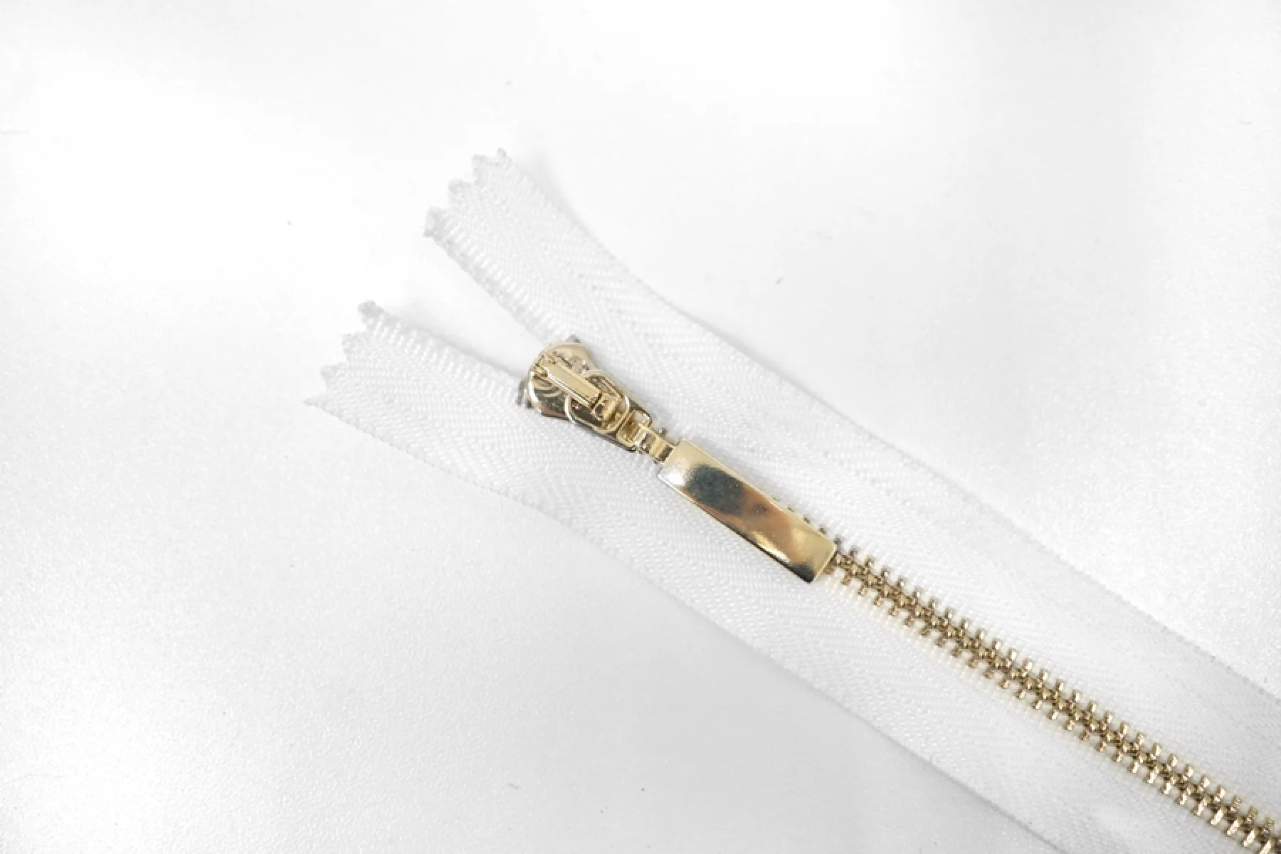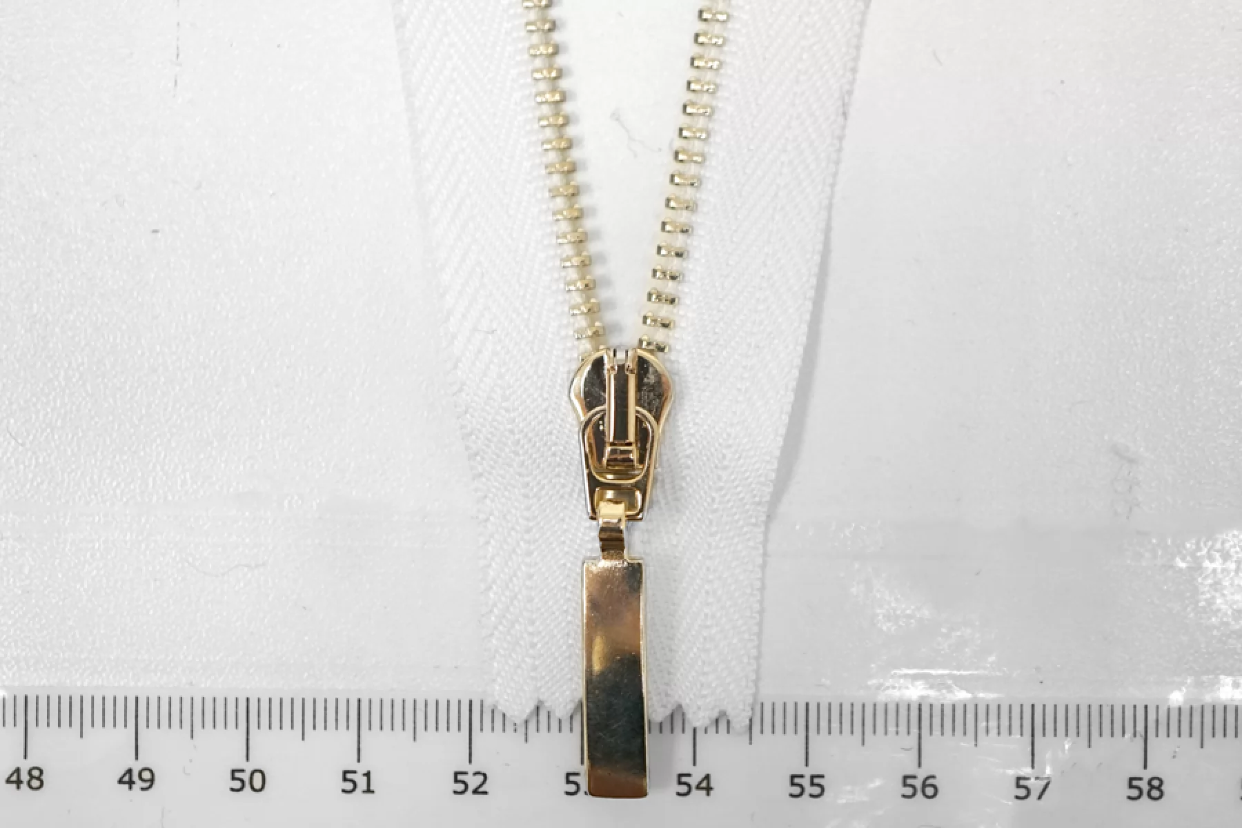 Итальянская молния неразъёмная, однозамочная, белого цвета. Материал зубцов, слайдера и пулера - металл, цвет - золотистый. Длина 18 см. Ширина молнии 2,8 см. Ширина зубцов 4 мм.