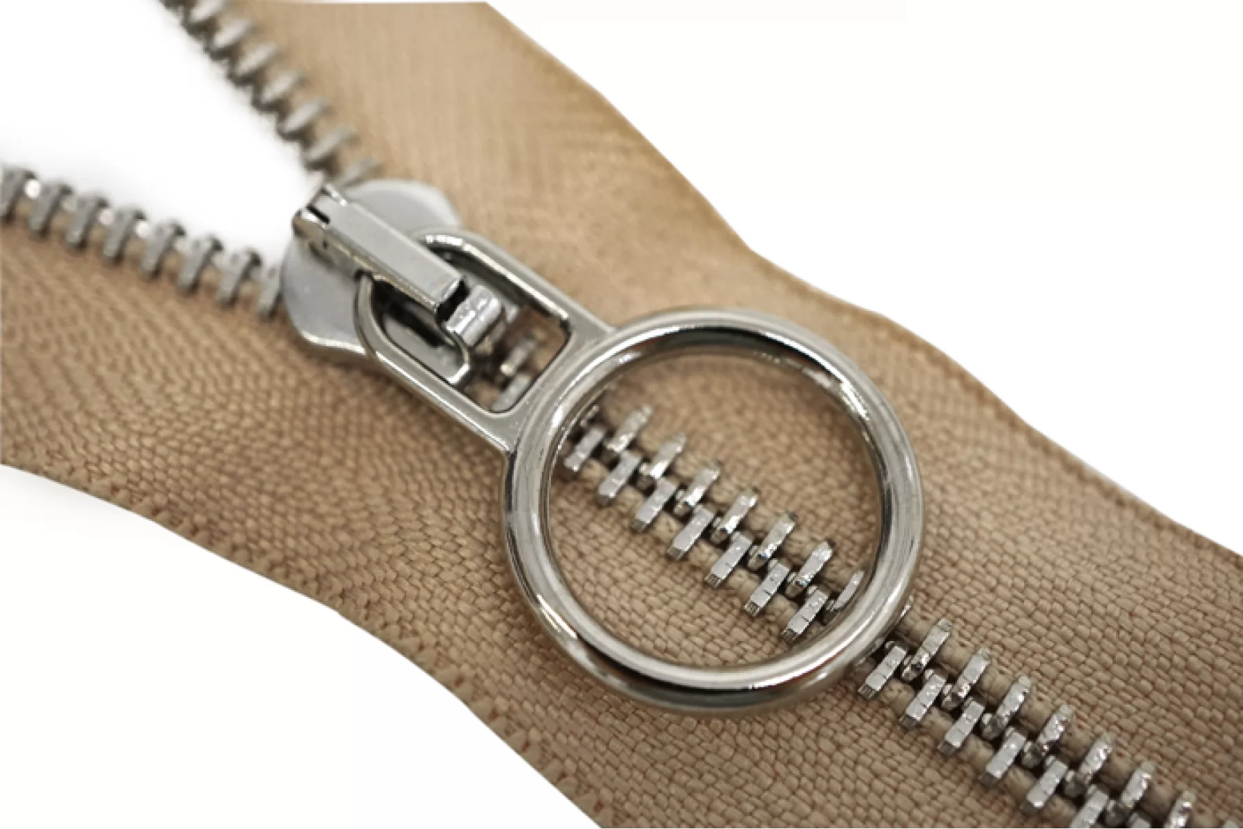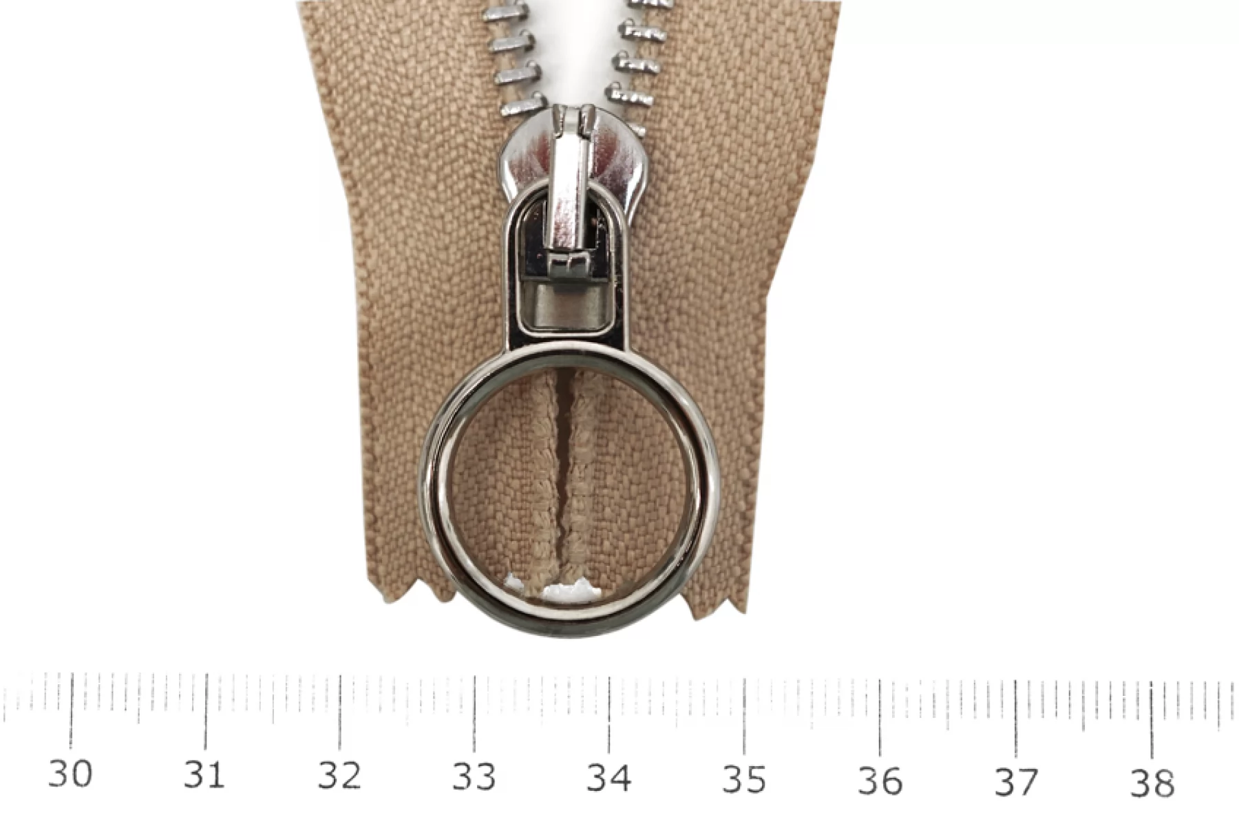 Молния неразъемная, однозамковая, бежевого цвета с оливковым подтоном, цвет зубцов серебро, цвет пуллера и слайдера также серебряного цвета . Длина 18 см. Ширина молнии 3,2 см, ширина зубцов 5 мм.