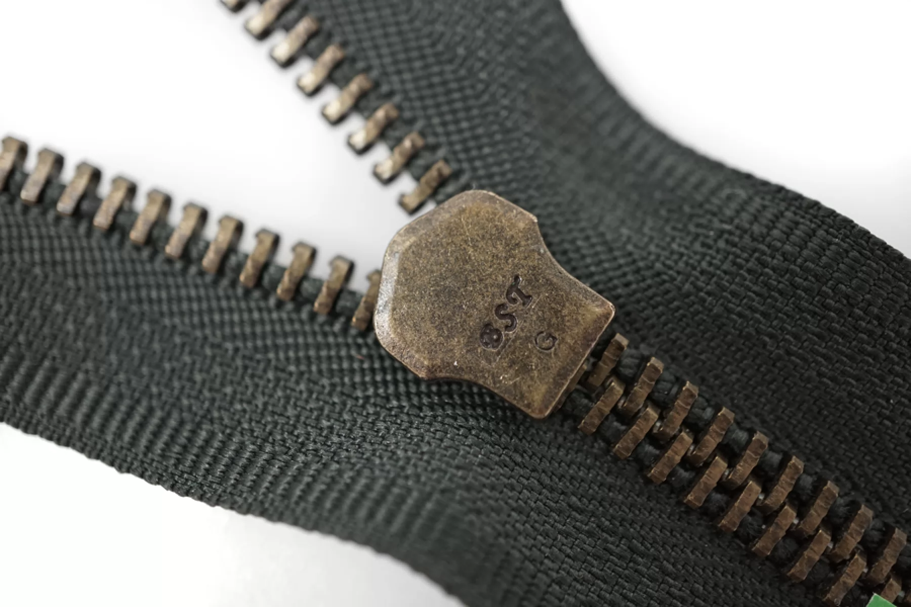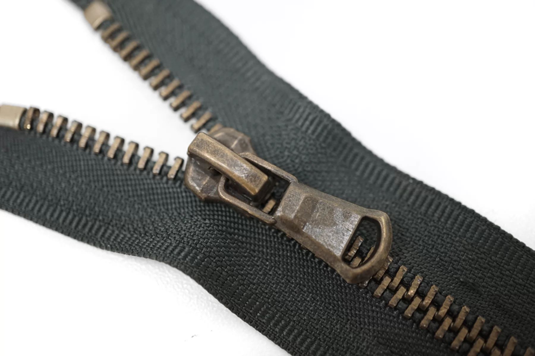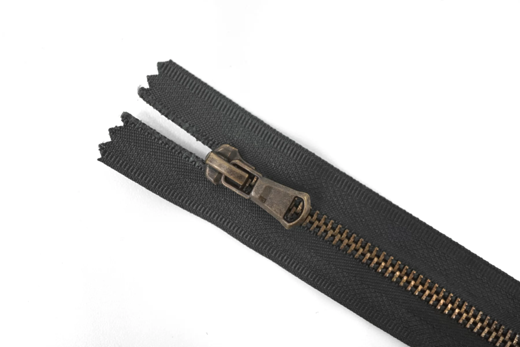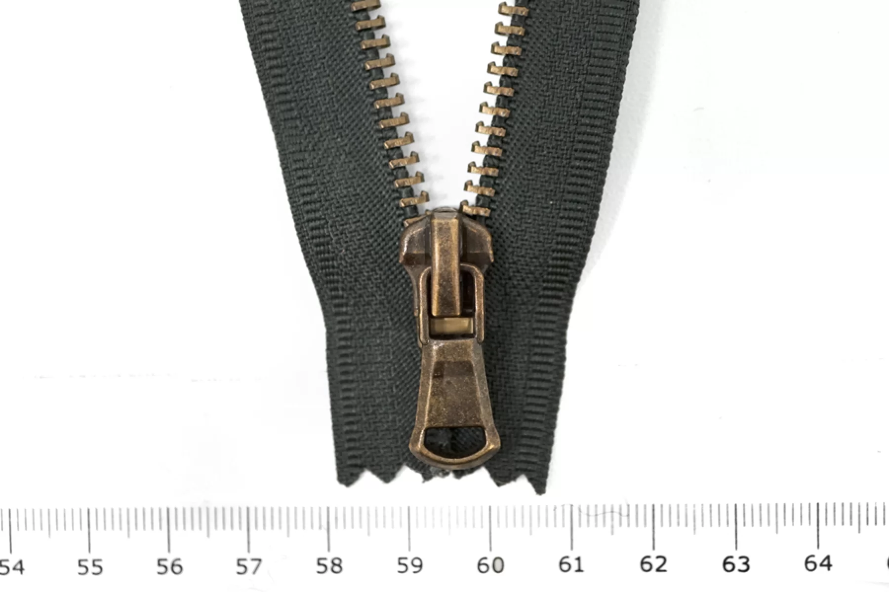 Итальянская молния неразъёмная YKK, однозамковая, серо-зеленого оттенка. Материал зубцов, слайдера и пулера - металл, оттенки - античная бронза. Длина 14,5 см. Ширина молнии 3 см. Ширина зубцов 6 мм.