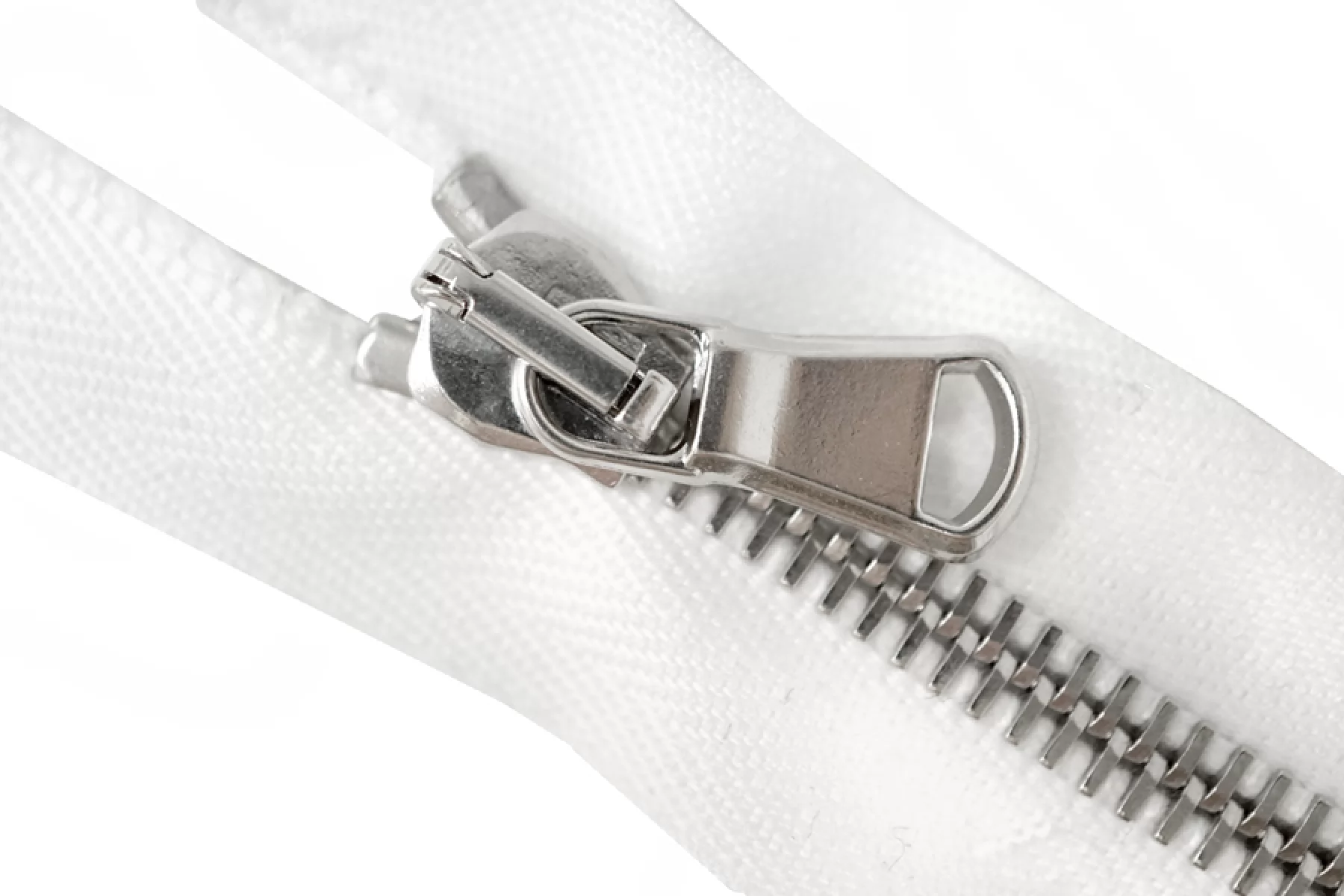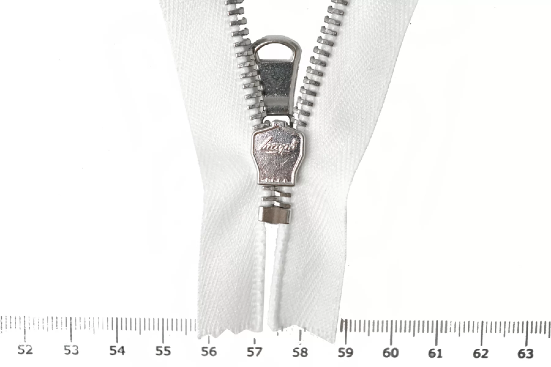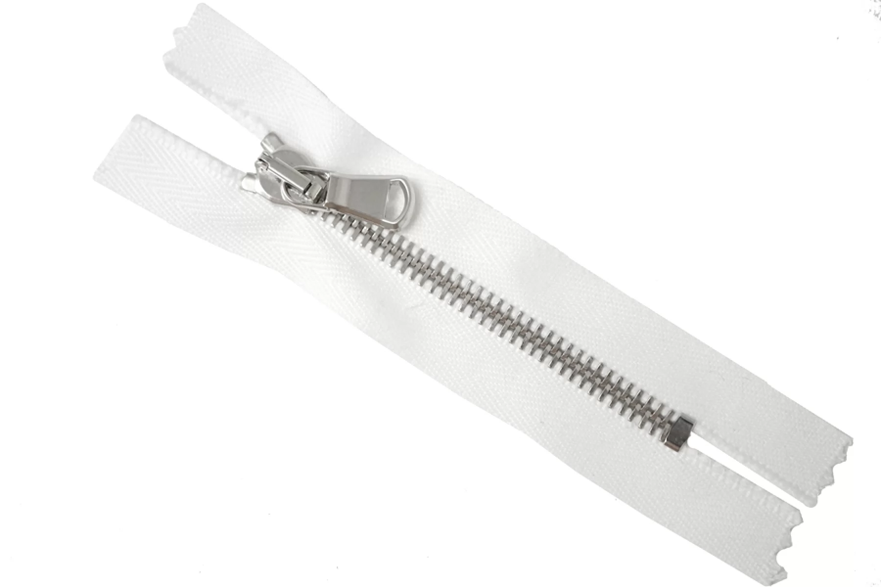 Молния от "Lampo" неразъемная, белая, цвет зубцов - металл серебристого цвета. Длина 9 см. Ширина молнии 3,2 см. Ширина зубцов 6 мм.