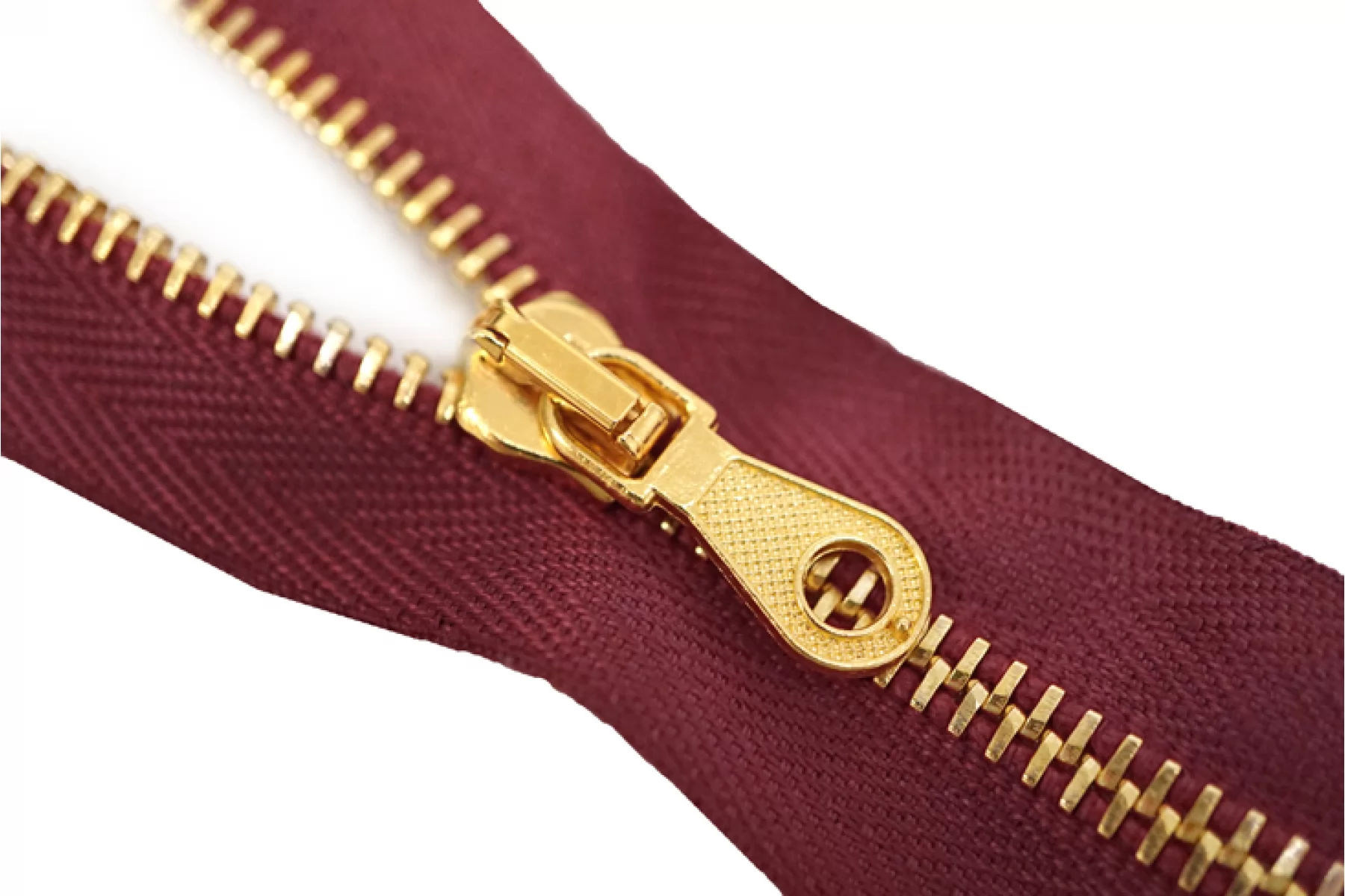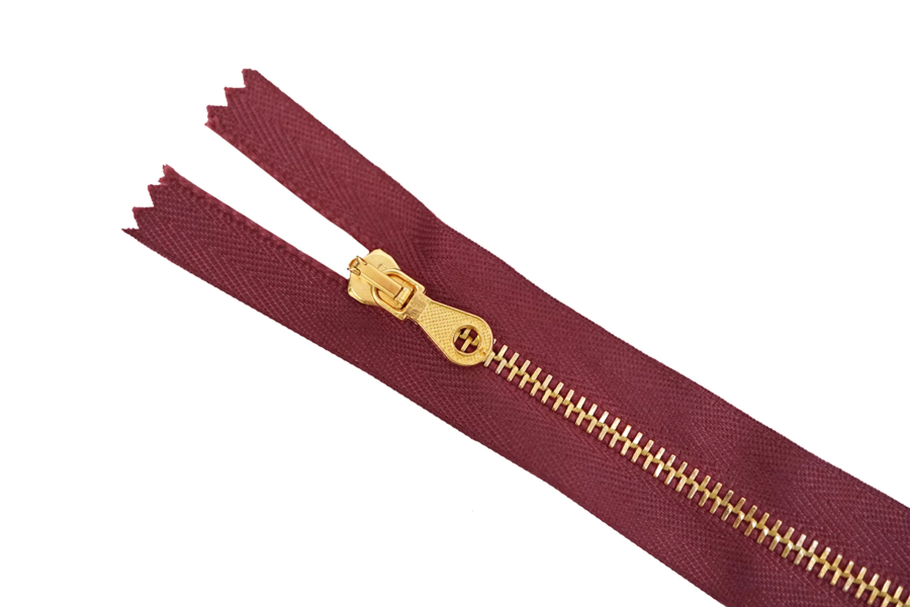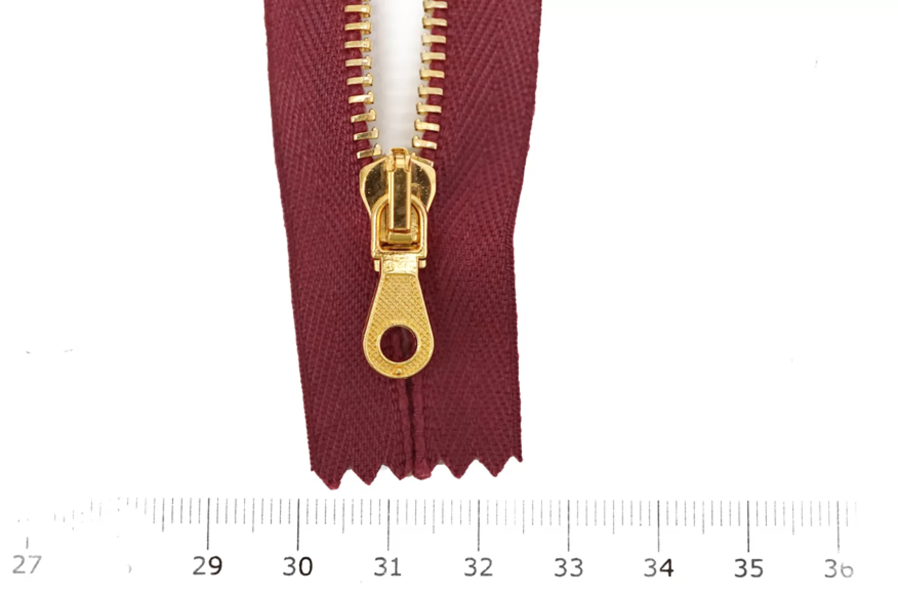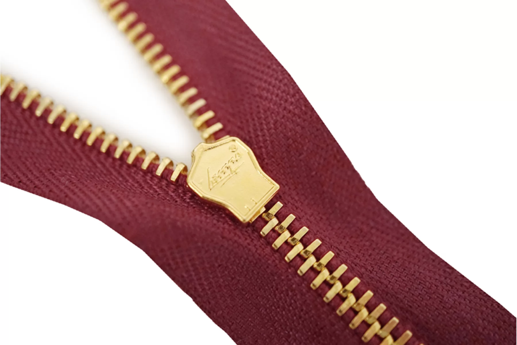 Молния от Итальянского производителя "Lampo" неразъемная, однозамковая, бордового цвета, цвет зубцов золотой, цвет пуллера и слайдера также золотые. Длина 16 см. Ширина молнии 2,6 см, ширина зубцов 4 мм.