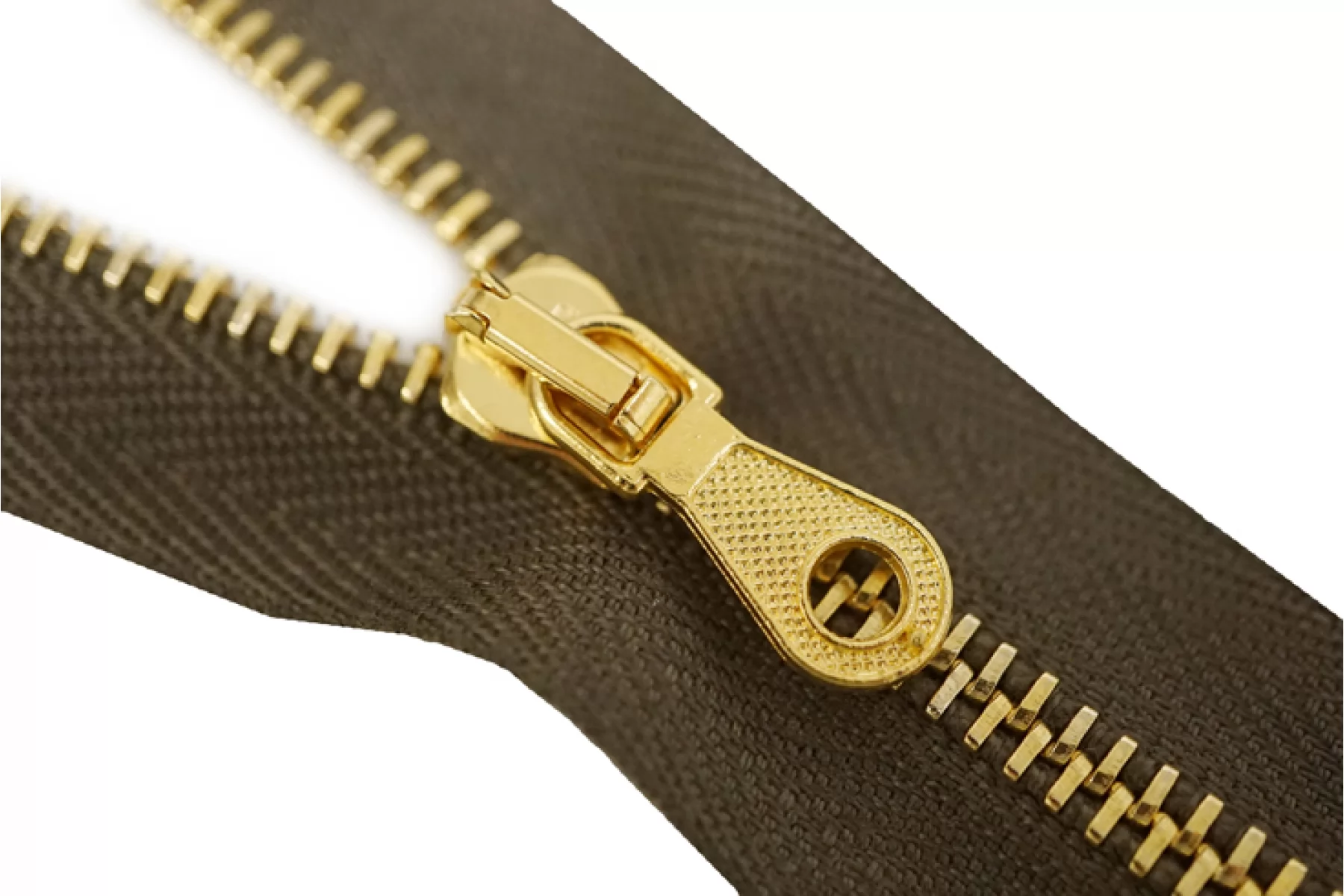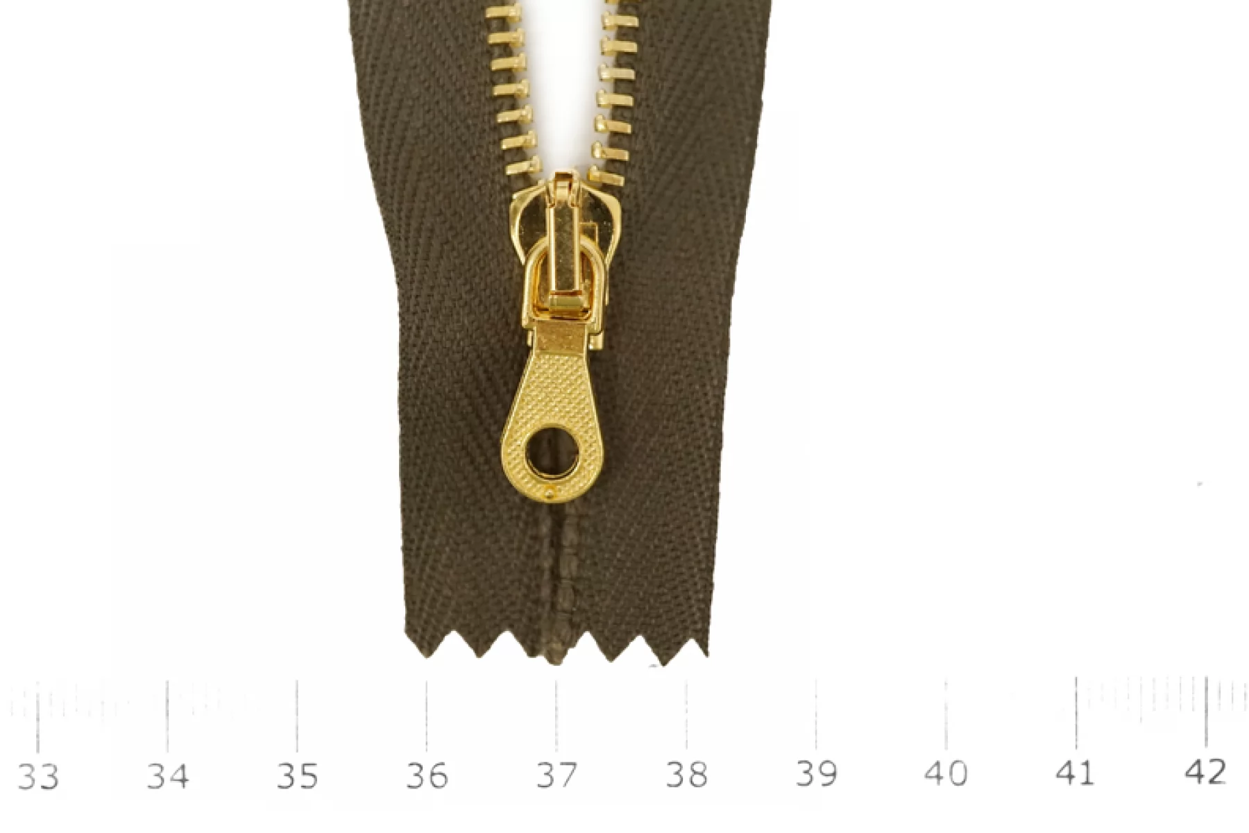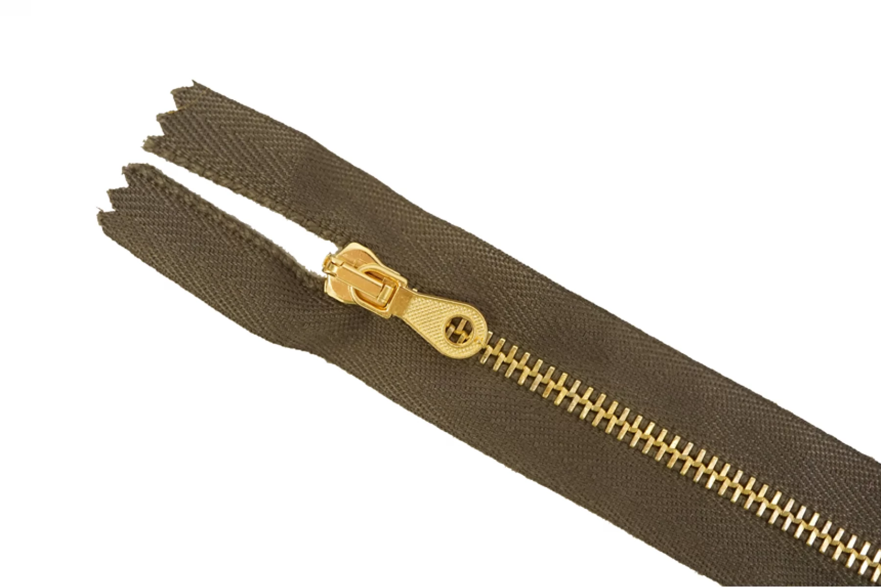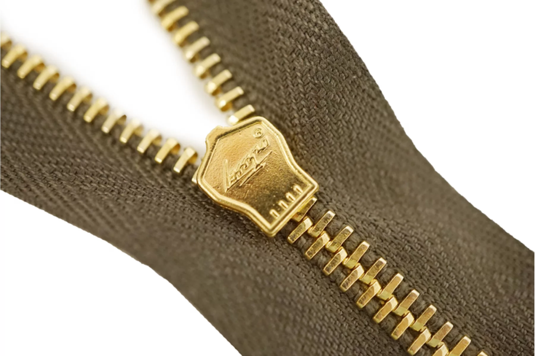 Молния от Итальянского производителя "Lampo" неразъемная, однозамковая, коричнево-зеленого цвета, цвет зубцов золотой, цвет пуллера и слайдера также золотые. Длина 16 см. Ширина молнии 2,6 см, ширина зубцов 4 мм.