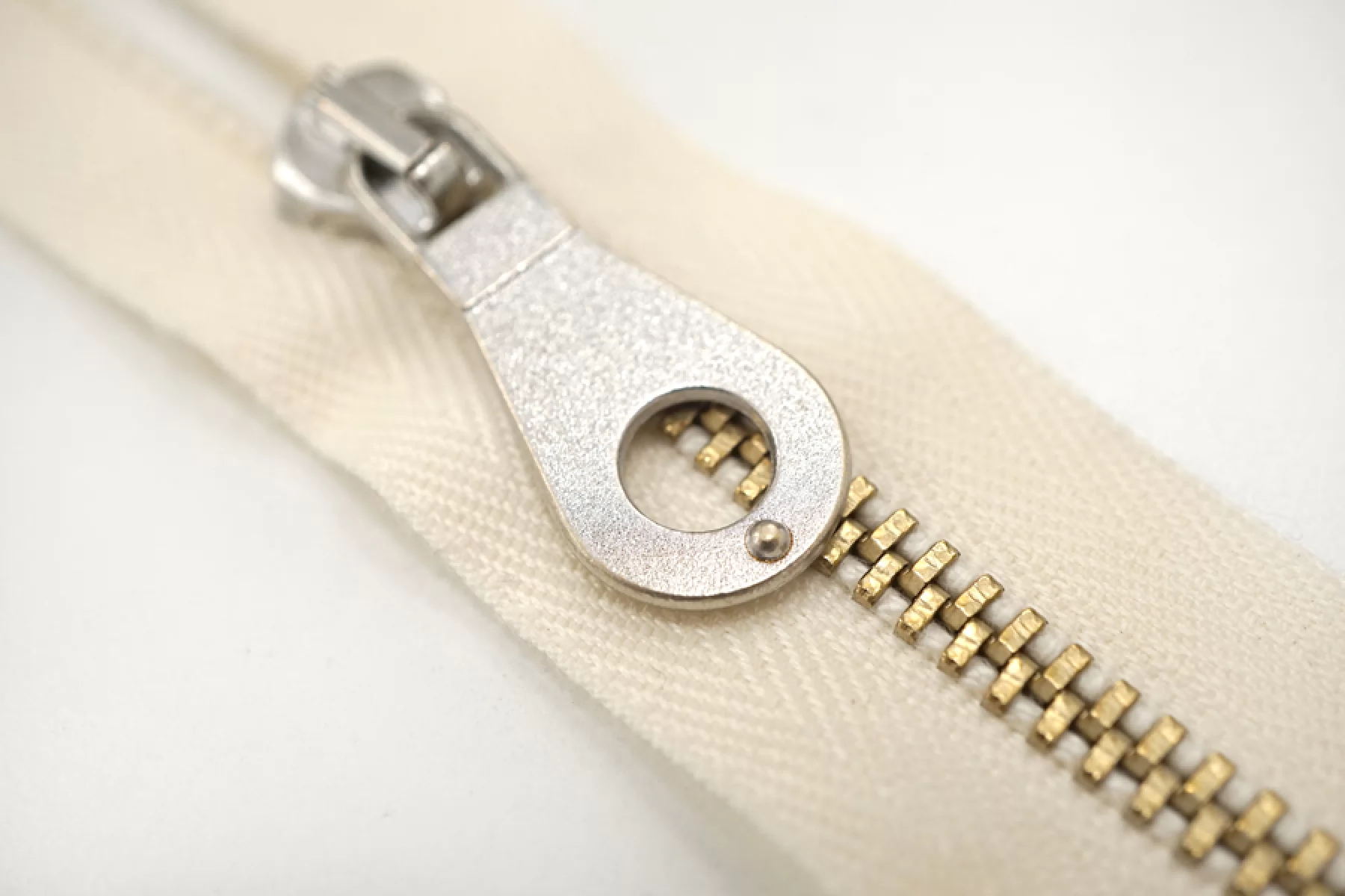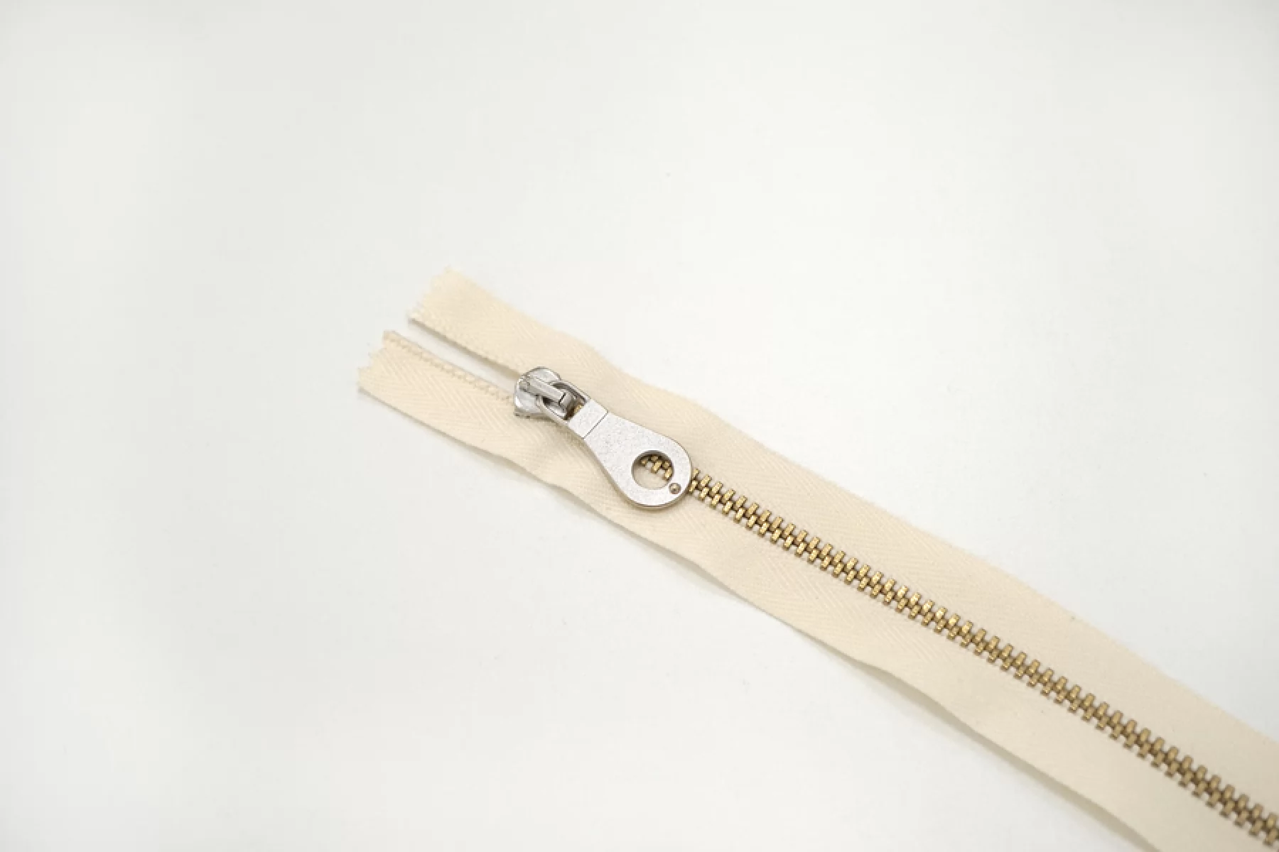 Молния от "Lampo" неразъемная, молочная, цвет зубцов золотистый, слайдера и крупного пуллера серебристый. Длина 13 см.