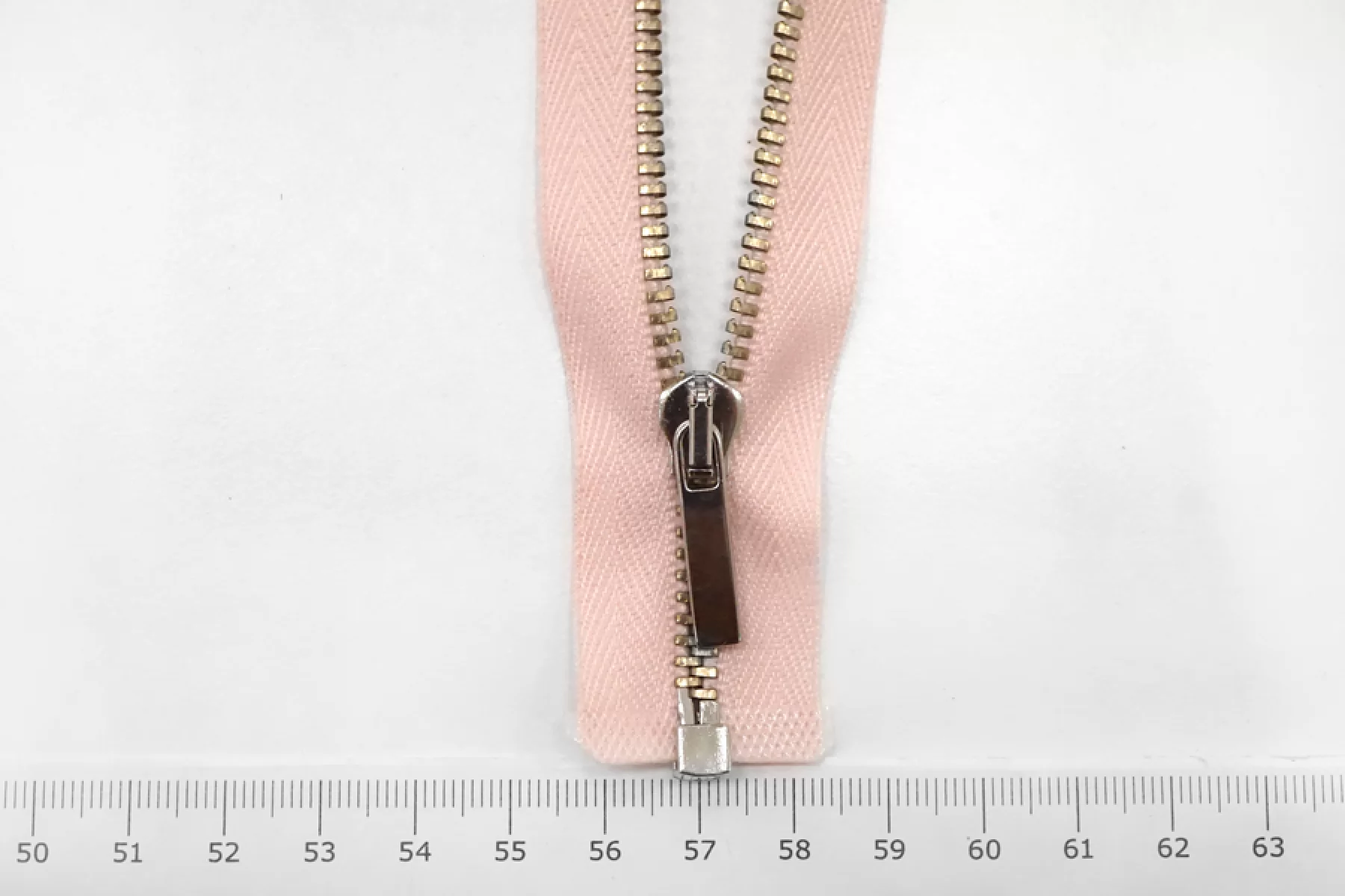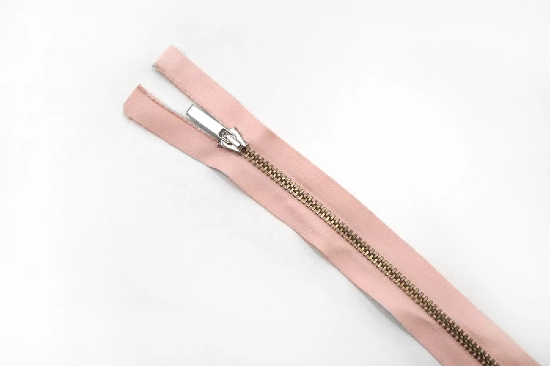 Молния металлическая от "Lampo" неразъемная, нежно-розового цвета, цвет слайдера и пуллера серебристый, цвет зубцов золотистый. Длина 37 см.