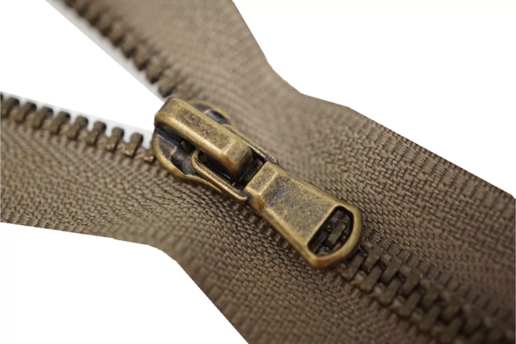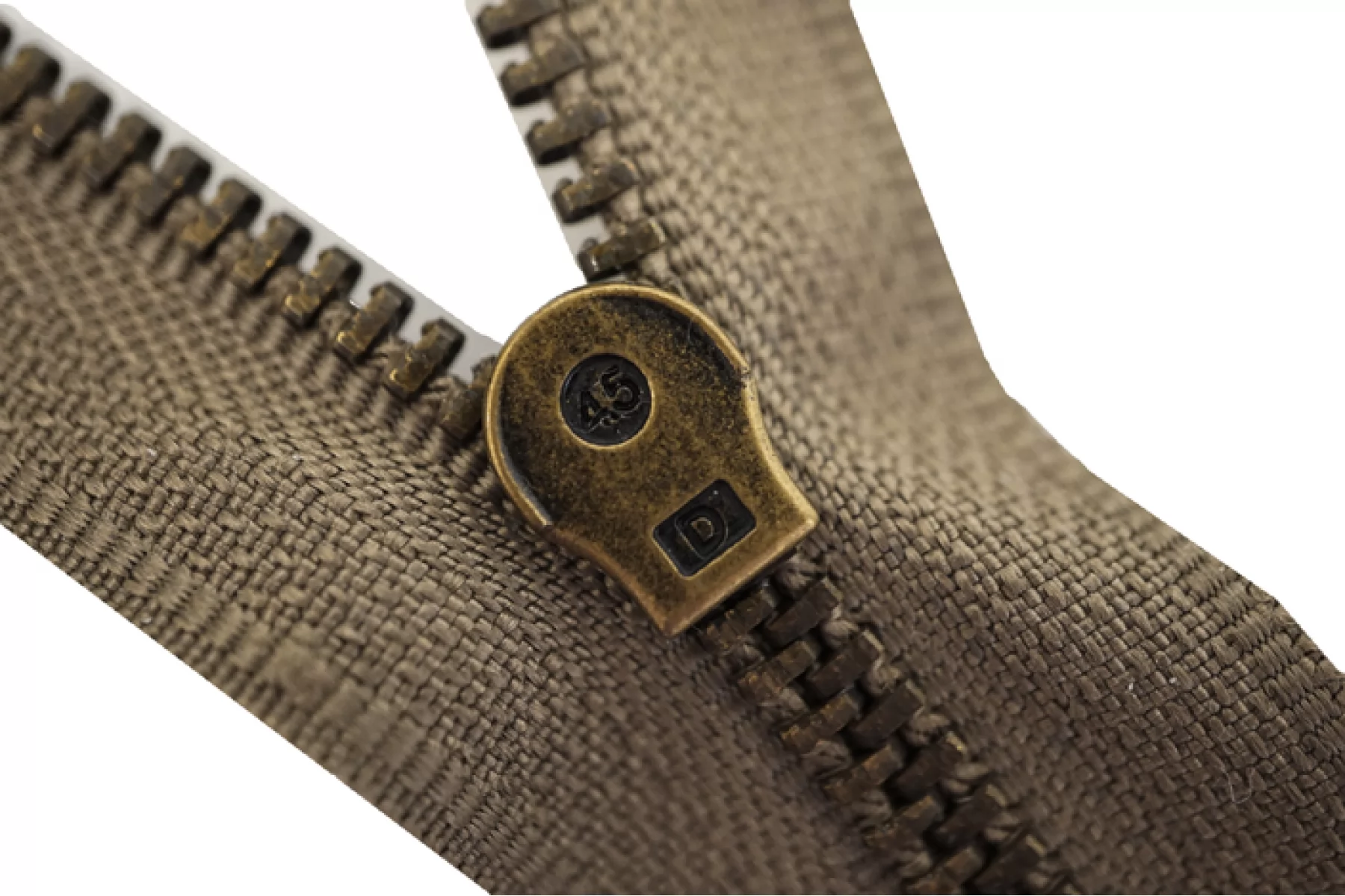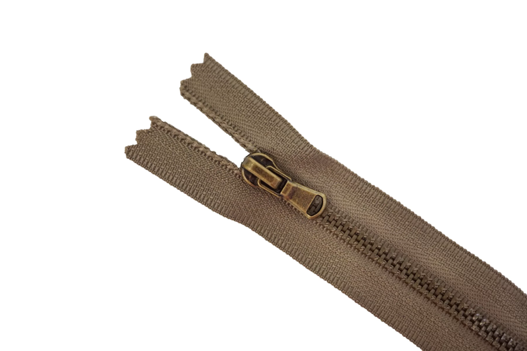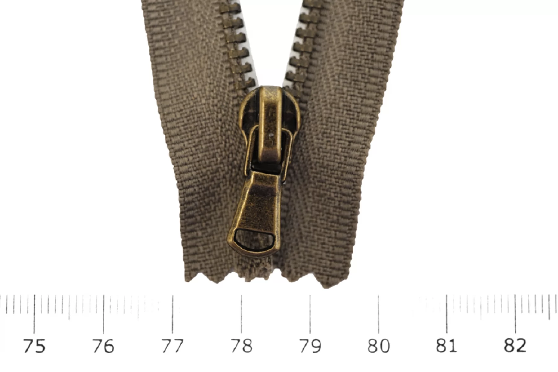 Молния от Итальянского производителя "Lampo" неразъемная, однозамковая, серо-коричневого цвета, цвет зубцов латунь, цвет пуллера и слайдера также латунь. Длина 14 см. Ширина молнии 2,7 см, ширина зубцов 5 мм.