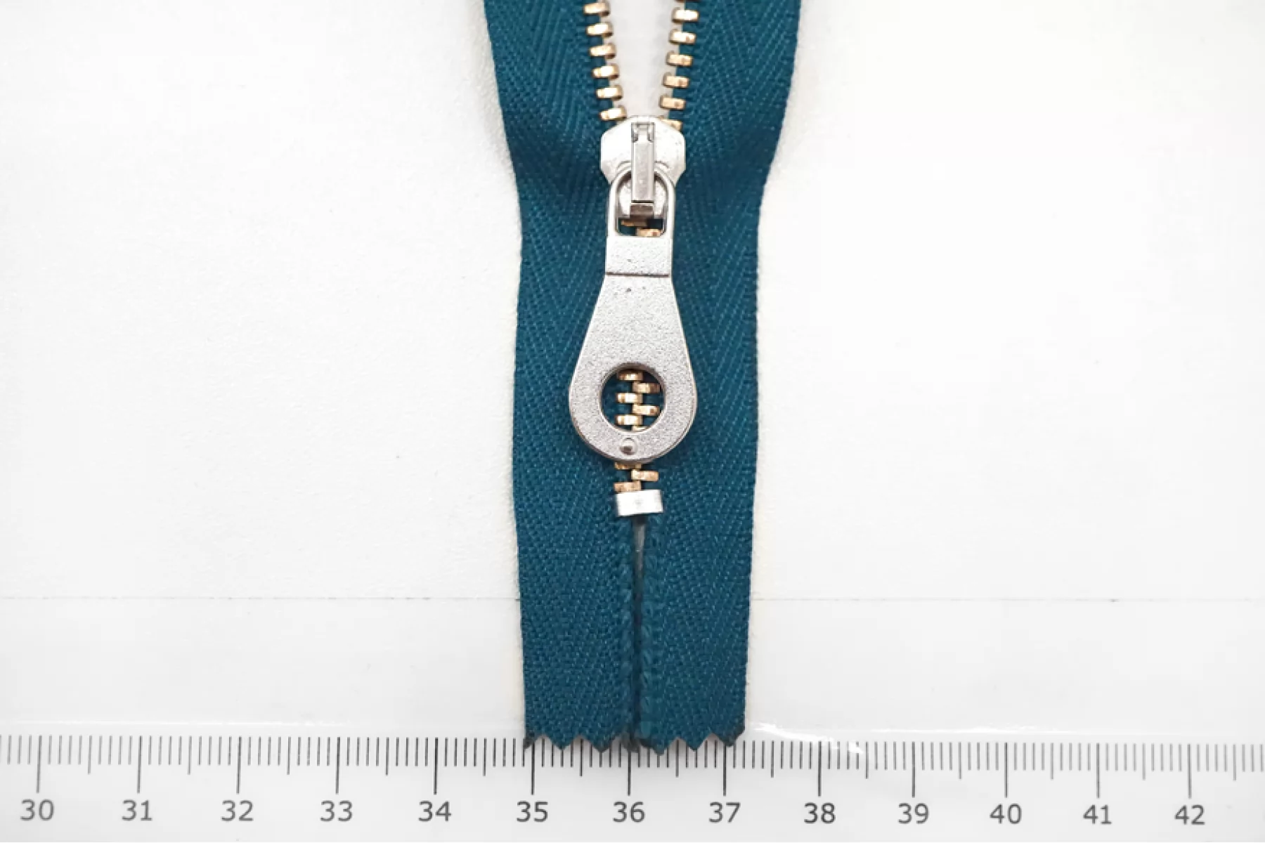 Молния металлическая от "Lampo" неразъемная, тёмно-бирюзового цвета, цвет слайдера и пуллера серебристый, цвет зубцов золотистый. Длина 26 см.