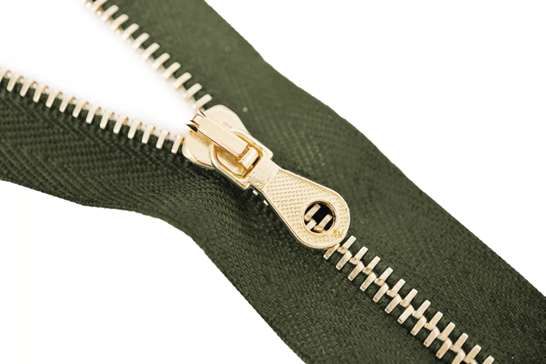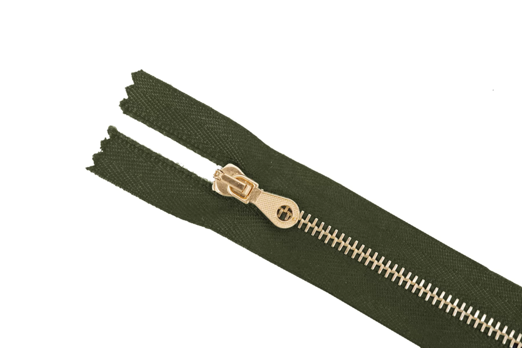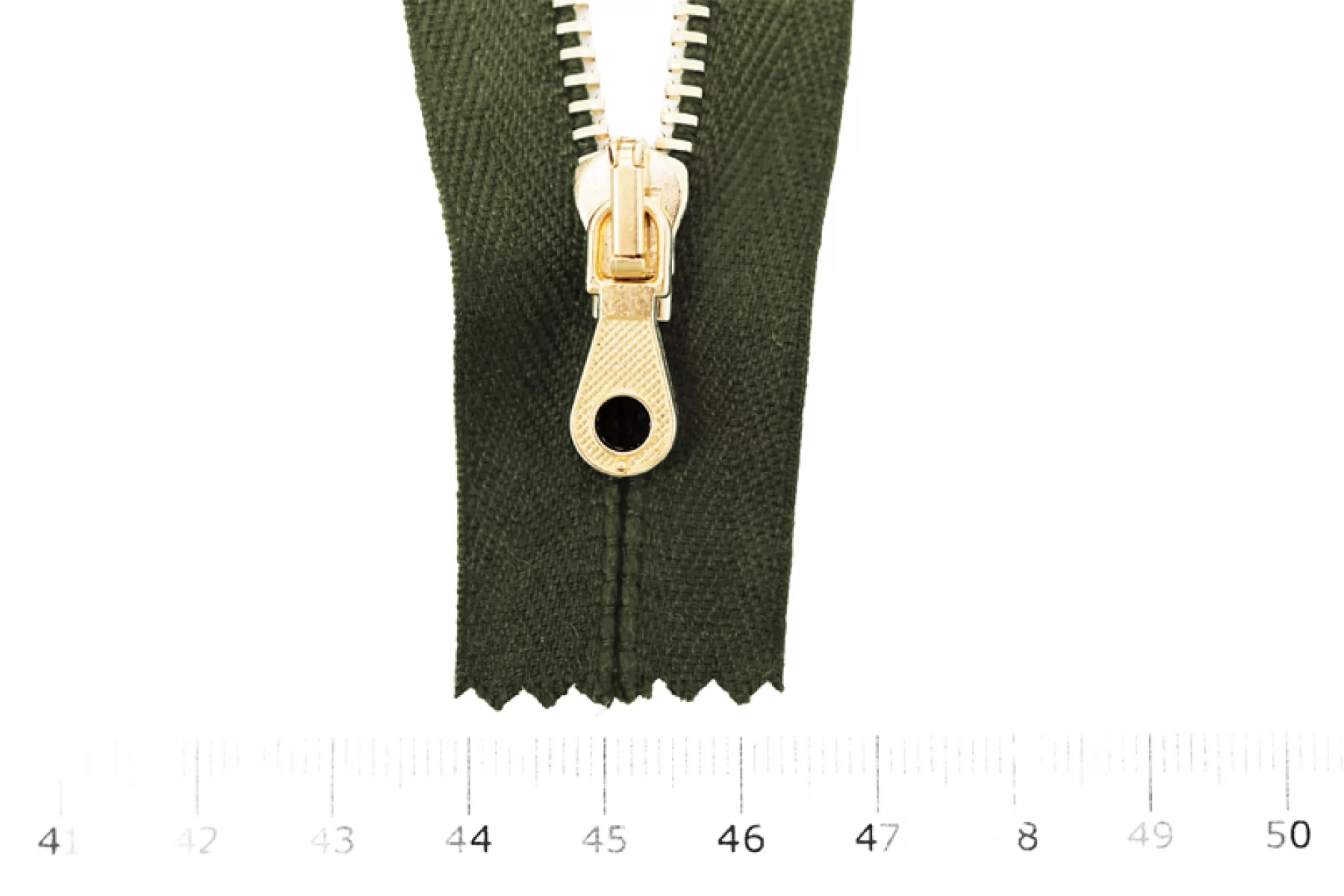 Молния от Итальянского производителя "Lampo" неразъемная, однозамковая, цвет зеленое хаки, цвет зубцов золотой, цвет пуллера и слайдера также золотые. Длина 16 см. Ширина молнии 2,7 см, ширина зубцов 4 мм.