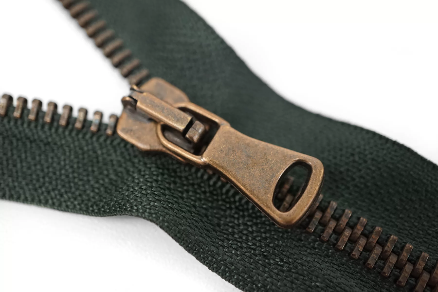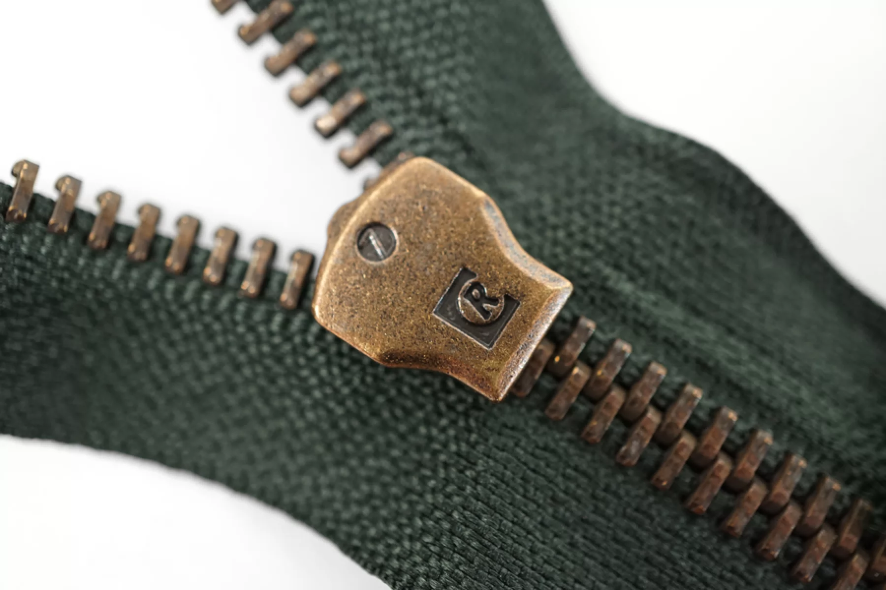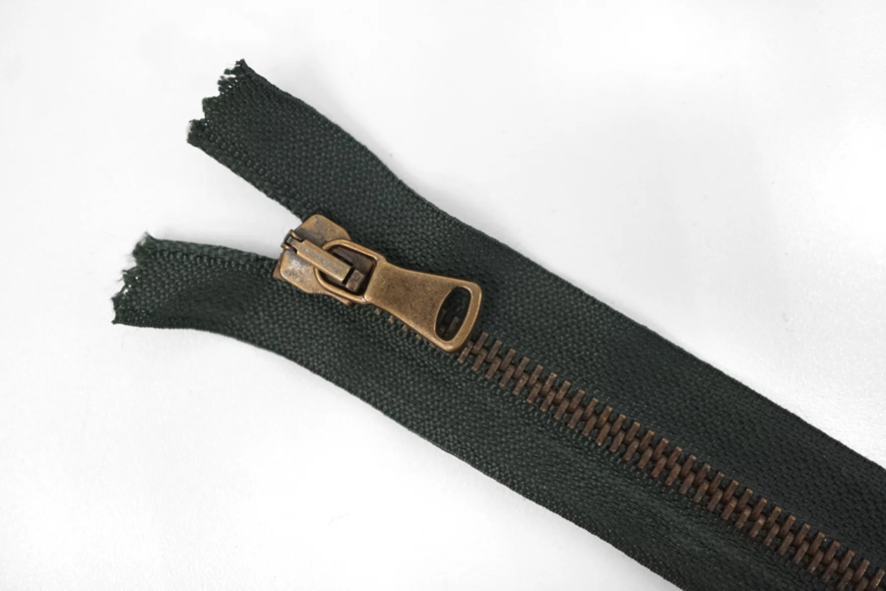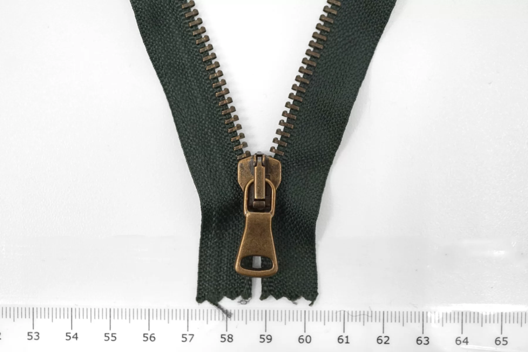 Итальянская молния LAMPO неразъёмная, однозамковая, темного оттенка зеленого хаки. Материал зубцов, слайдера и пулера - металл, оттенки - темная латунь. Длина 14 см. Ширина молнии 3 см. Ширина зубцов 6 мм.