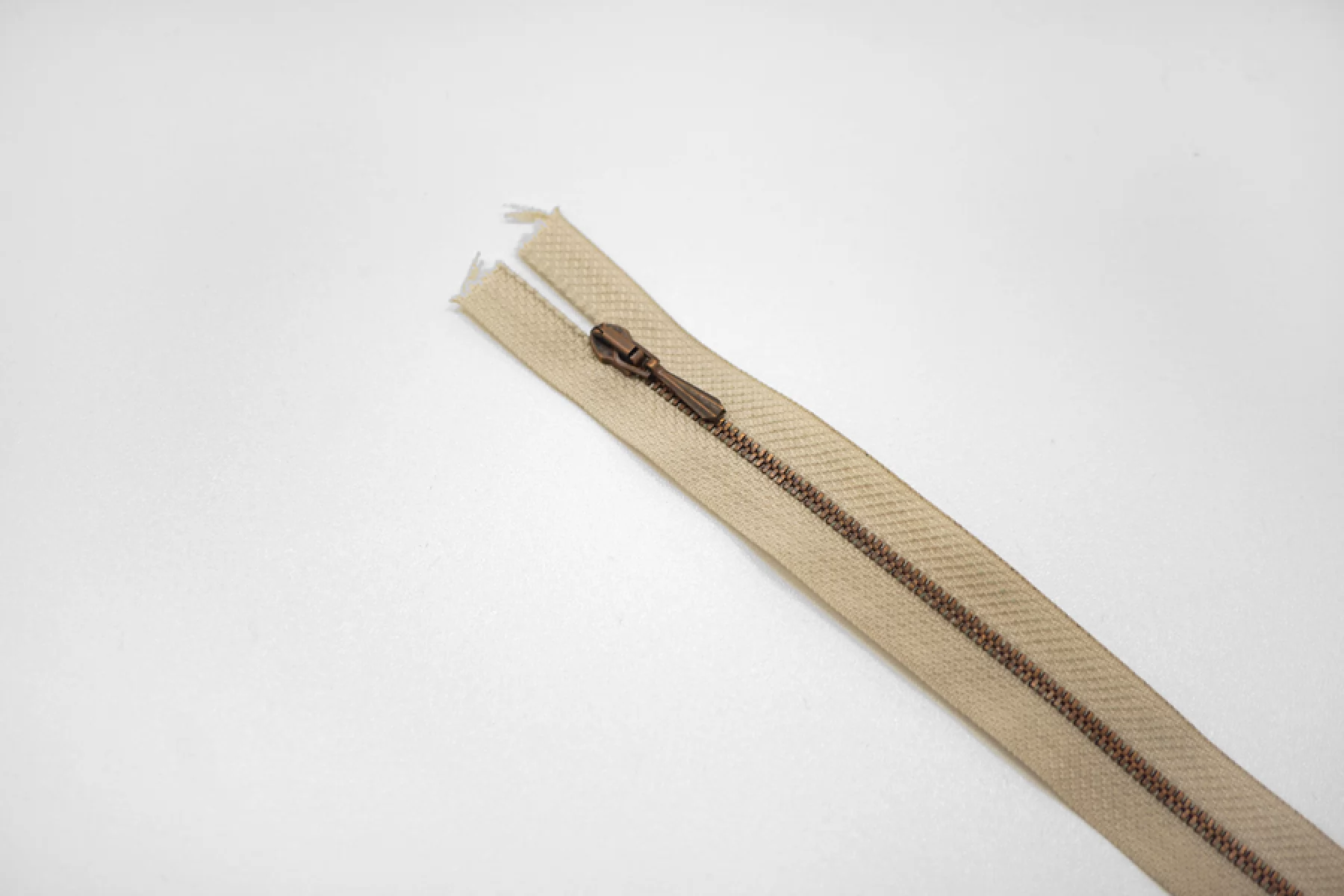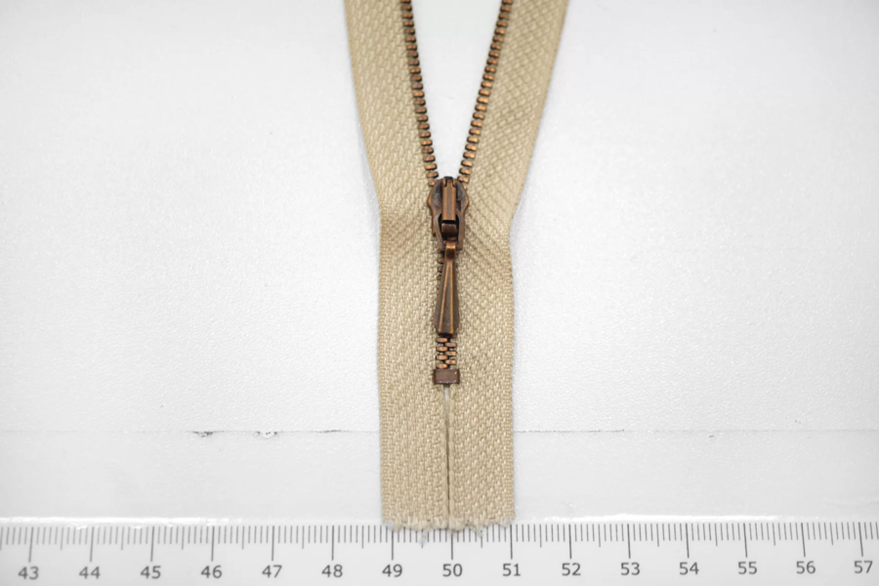 Молния от Lampo неразъемная, однозамковая, бежевого цвета, цвет зубцов бронзовый. Длина 20 см.