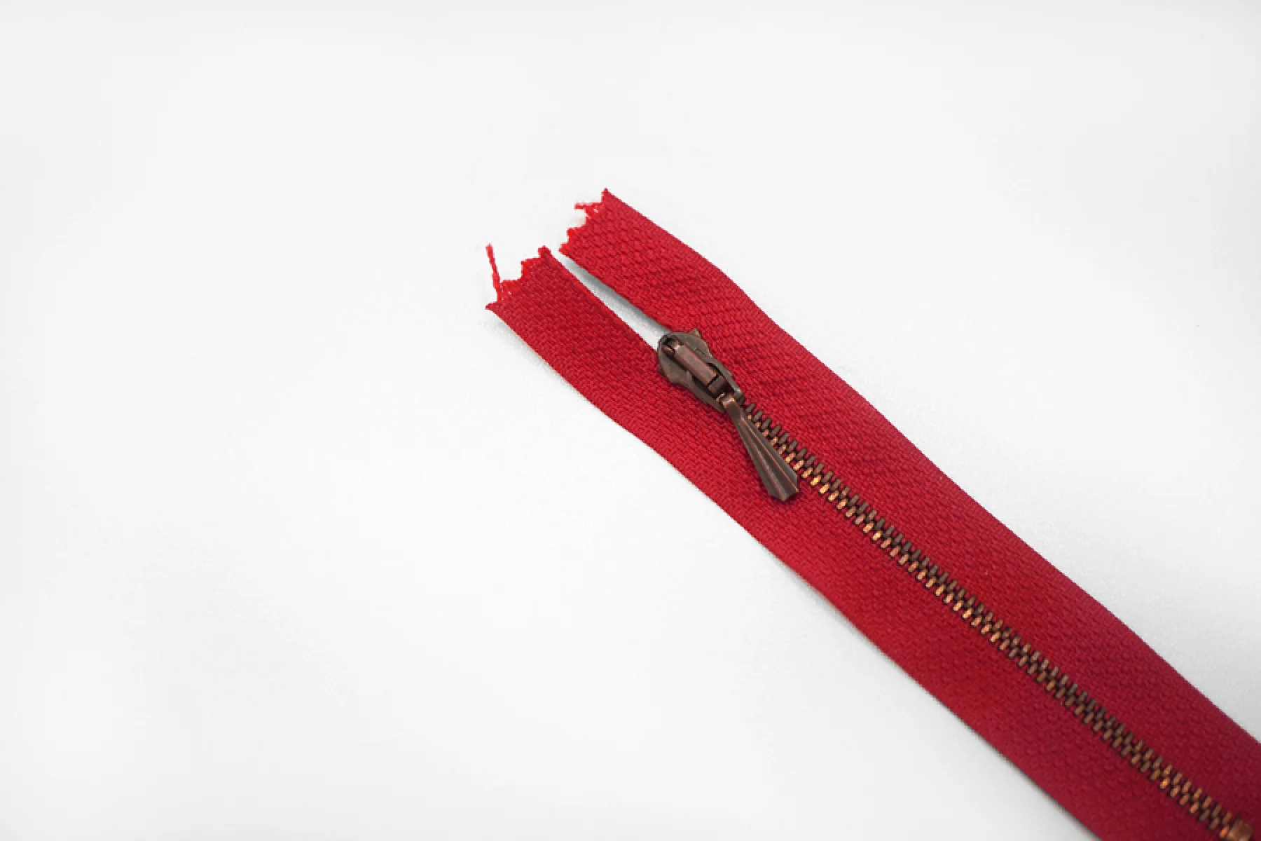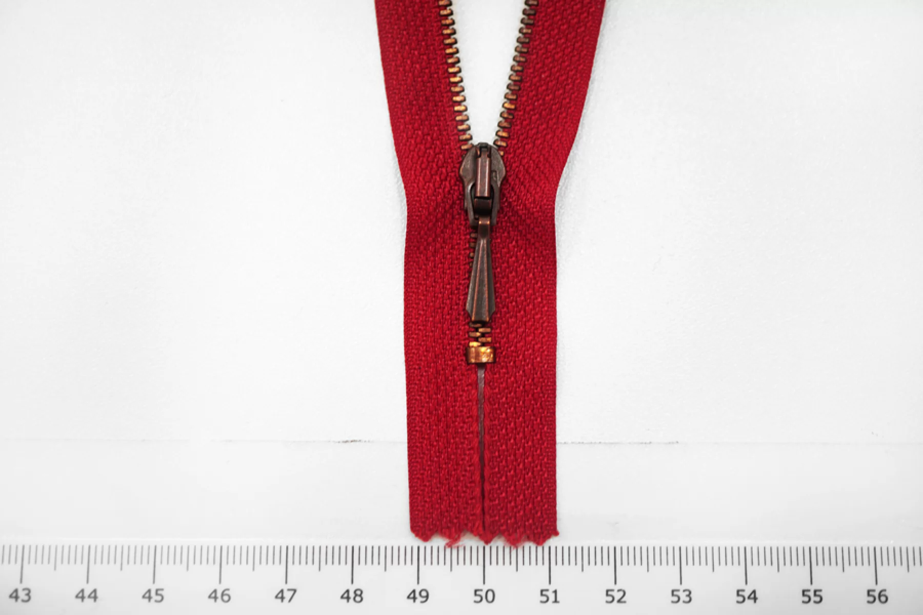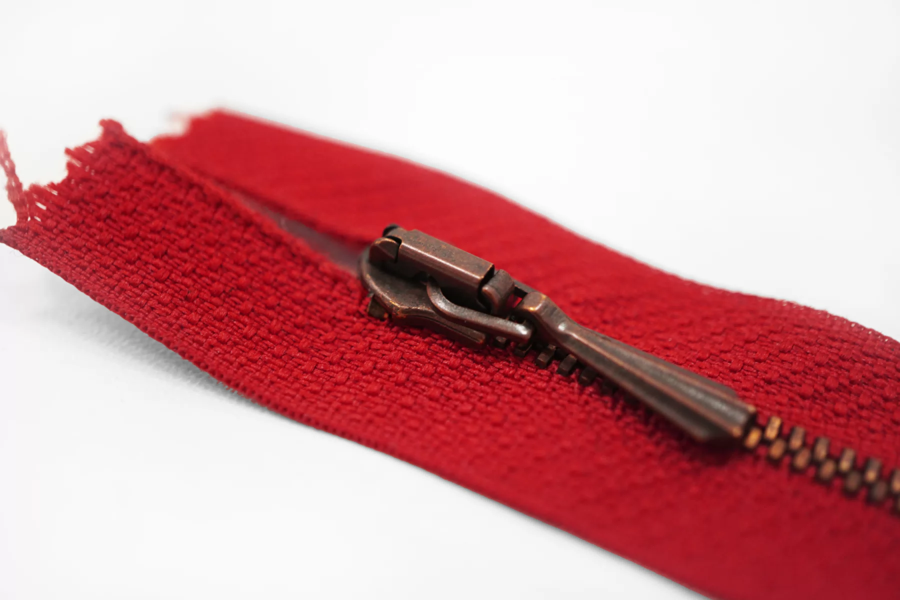 Молния от Lampo неразъемная, однозамковая, красного цвета, цвет зубцов бронза. Длина 10 см.