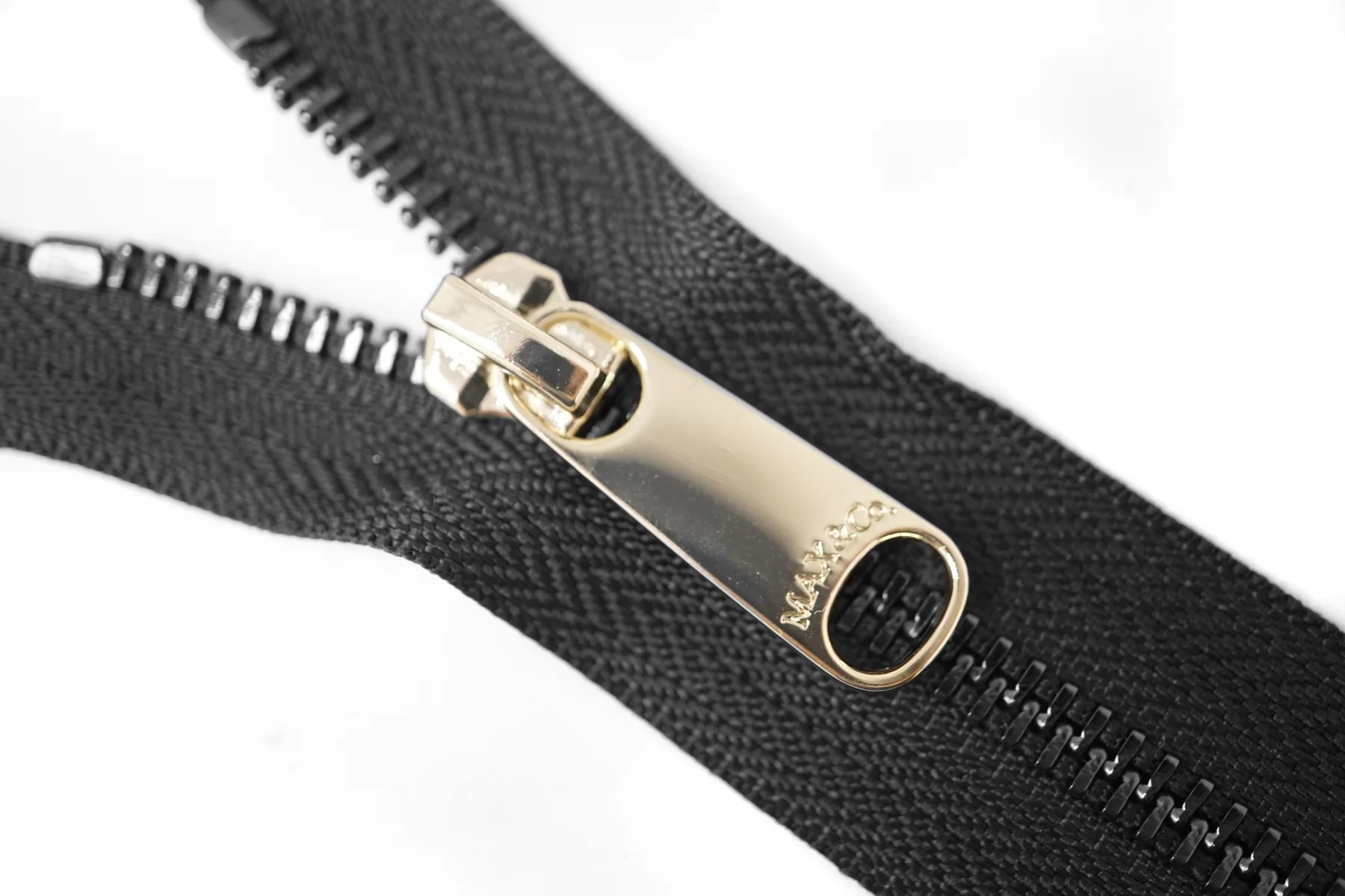 Металлическая молния от бренда MAX&CO неразъёмная, однозамковая, черного цвета. Материал зубцов, слайдера и пулера - металл, цвет пуллера - золотой, цвет зубцов - черный. Длина 20 см. Ширина молнии 6 см. Ширина зубцов 2,8 мм.