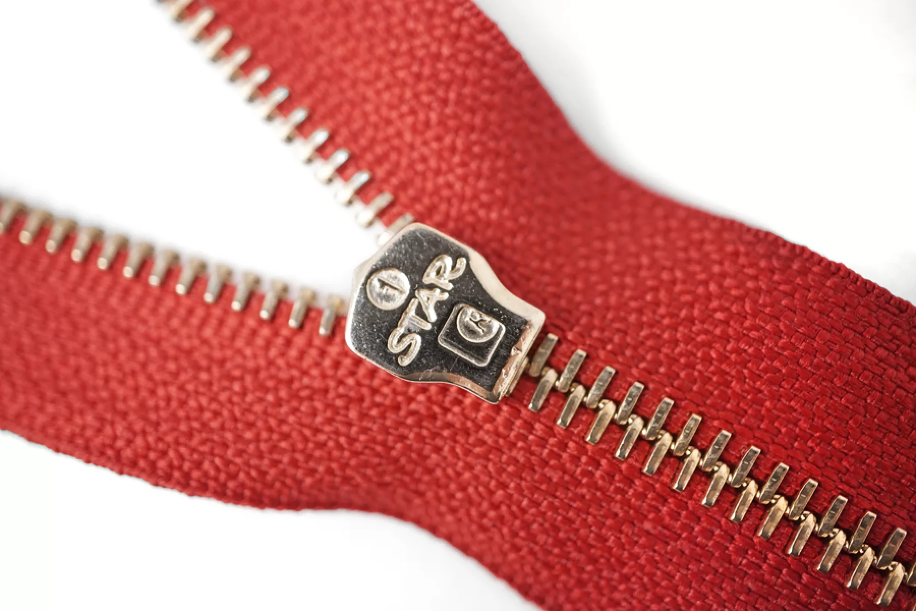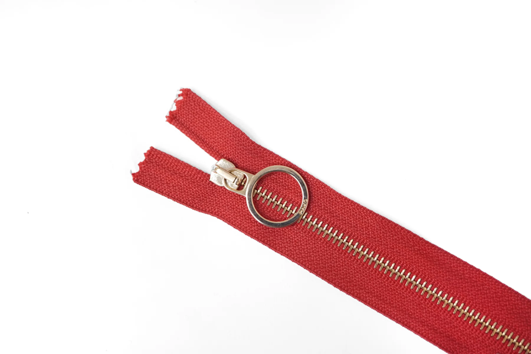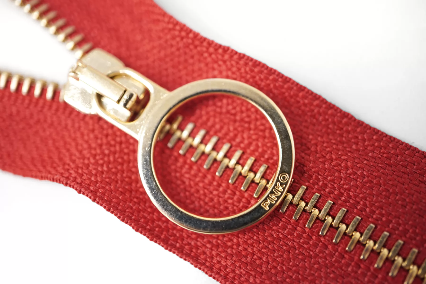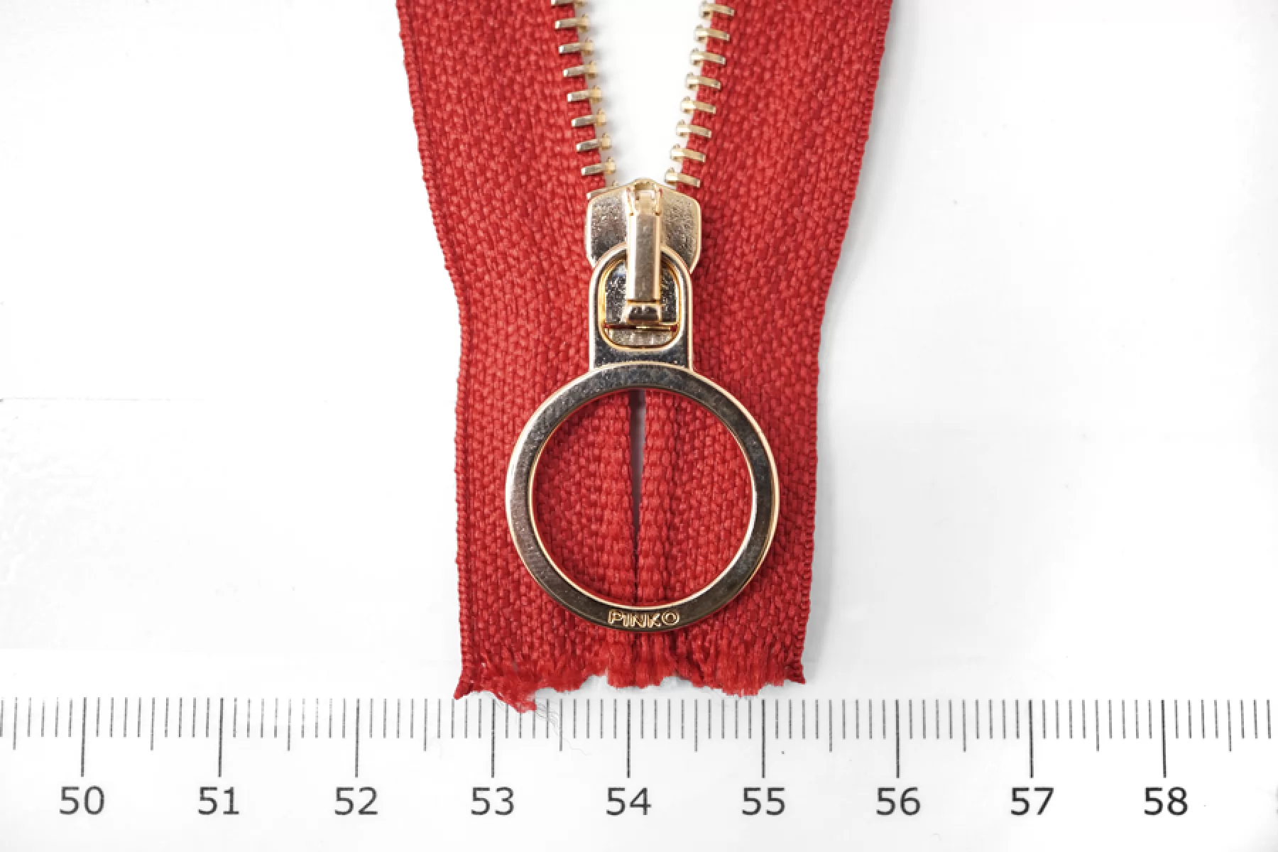 Металлическая молния от бренда PINKO неразъёмная, однозамковая, ягодно-красного цвета. Материал зубцов, слайдера и пулера - металл, цвет - золотой. Длина 22 см. Ширина молнии 4 см. Ширина зубцов 2,7 мм.