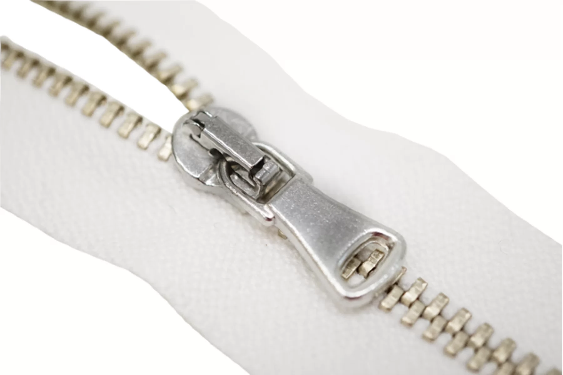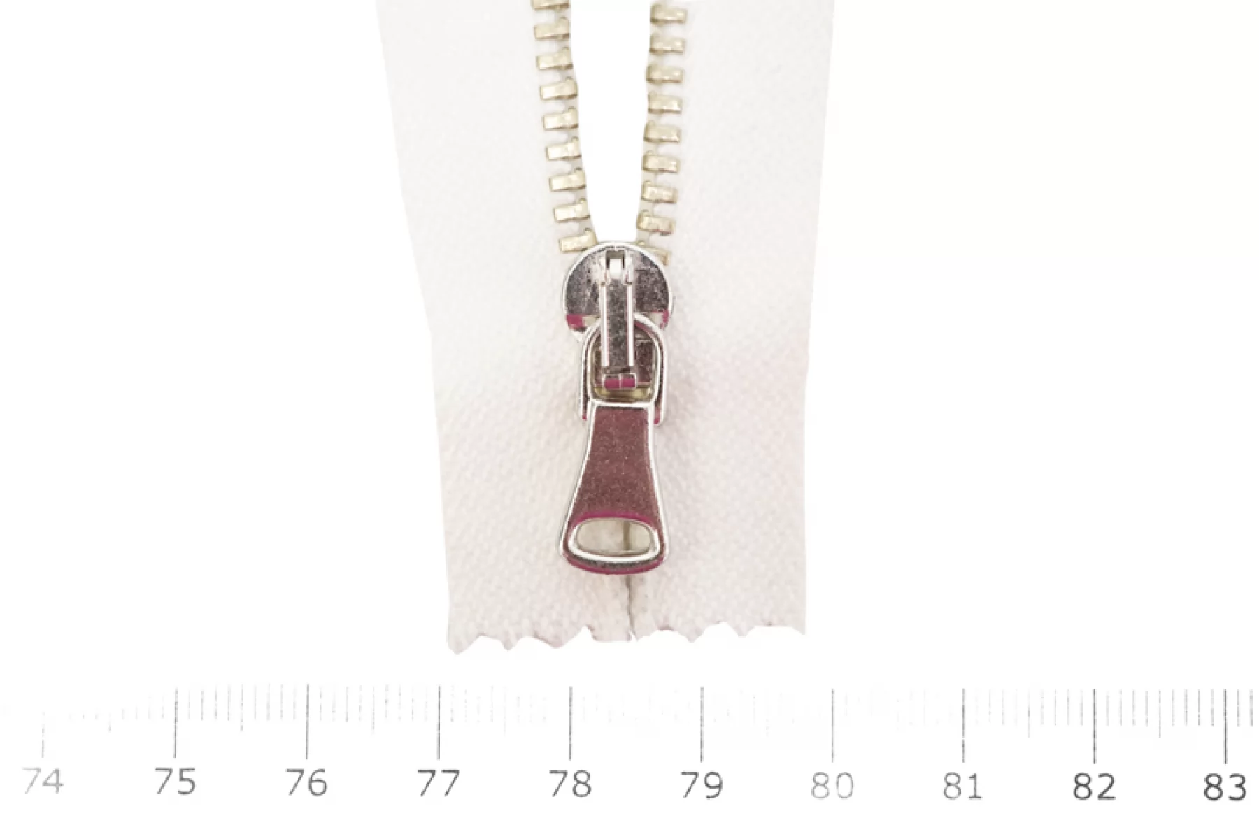 Молния "Rizip" неразъемная, однозамковая, белого цвета, цвет зубцов серебряный, цвет пуллера и слайдера также серебряные. Длина 16 см. Ширина молнии 2,8 см, ширина зубцов 5 мм.