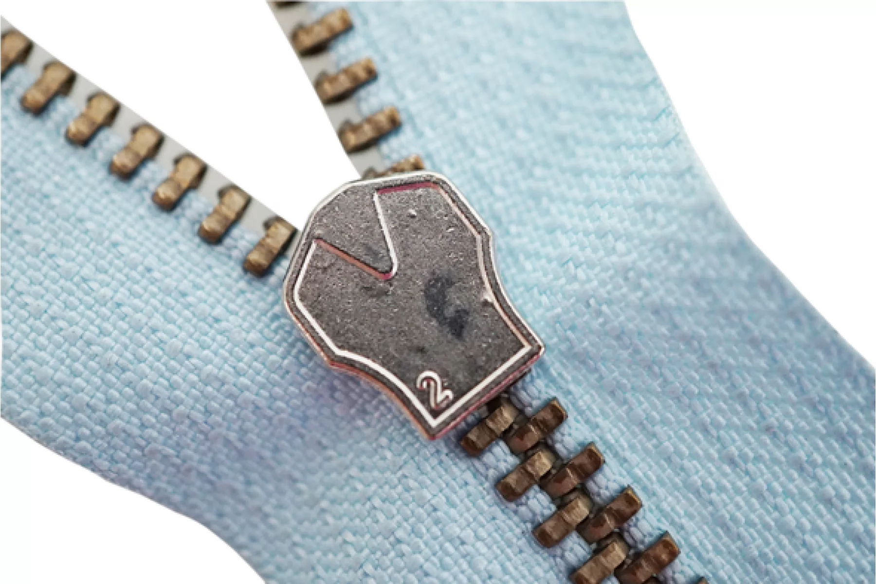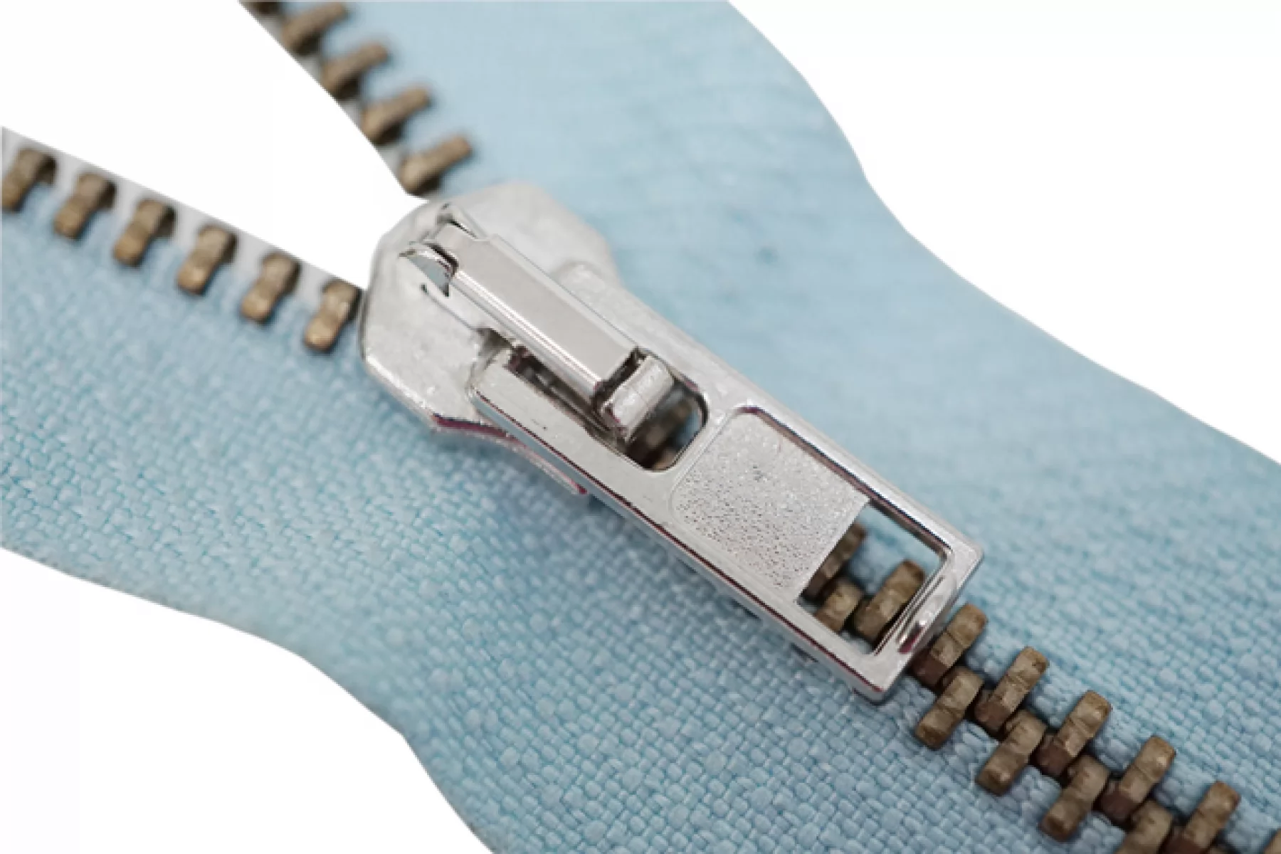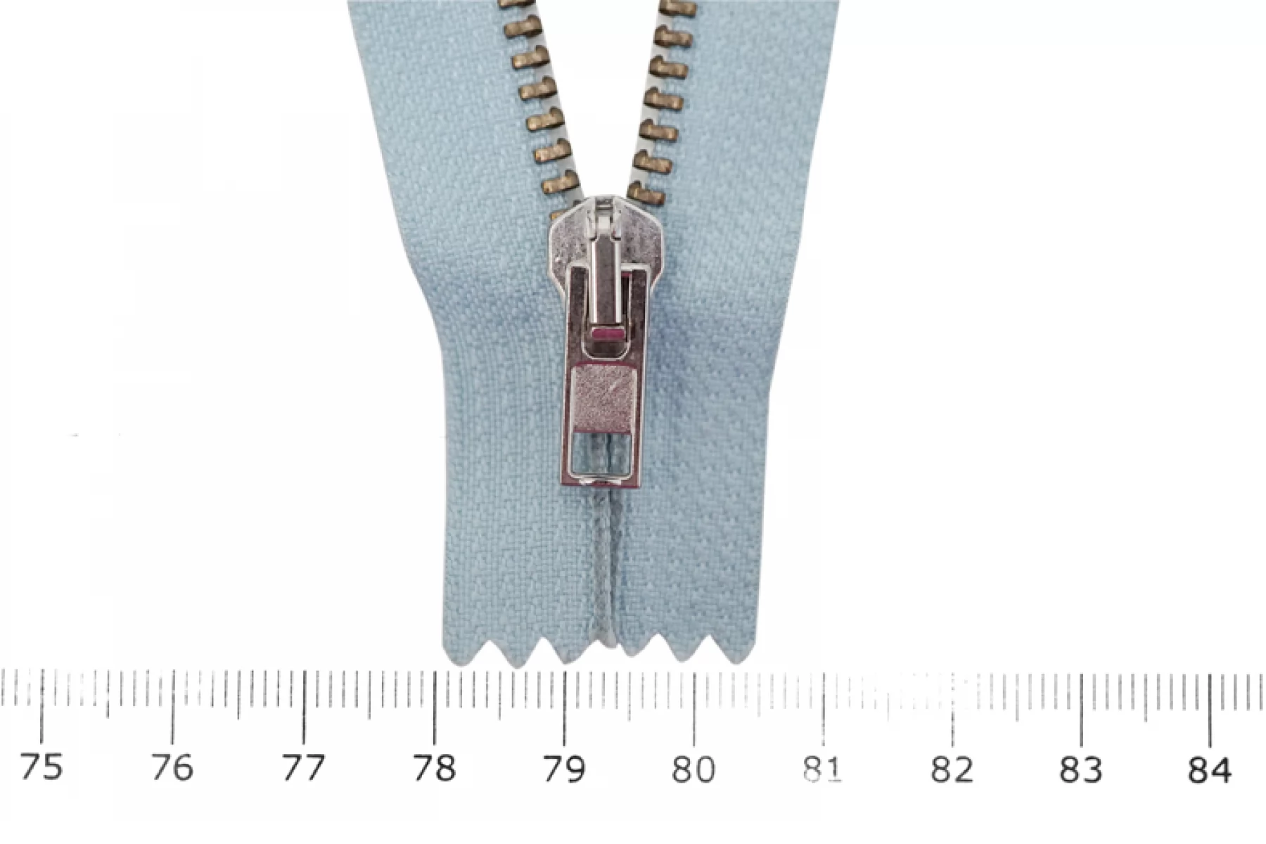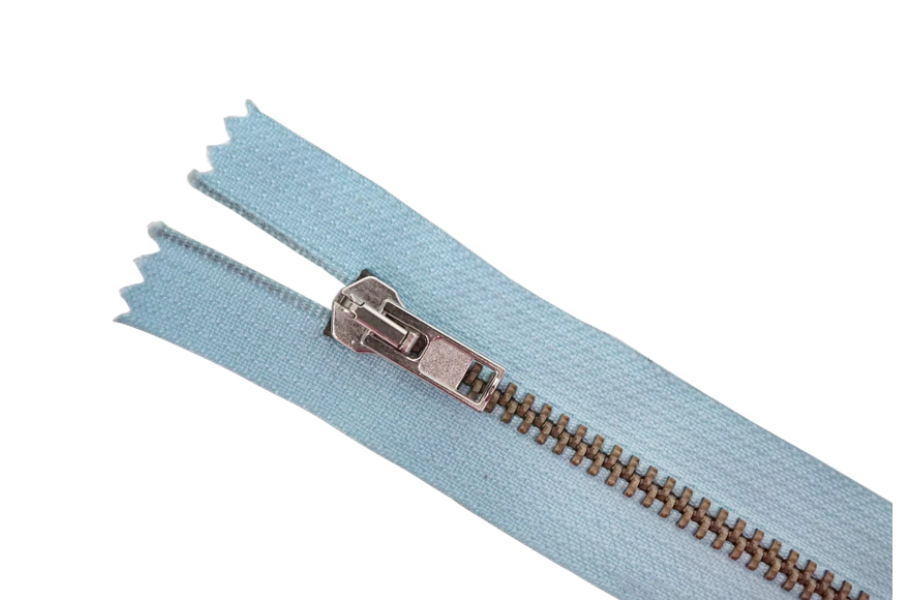 Молния "Rizip" неразъемная, однозамковая, голубого цвета, цвет зубцов латунь, цвет пуллера и слайдера серебряные. Длина 11,7 см. Ширина молнии 2,7 см, ширина зубцов 5 мм.