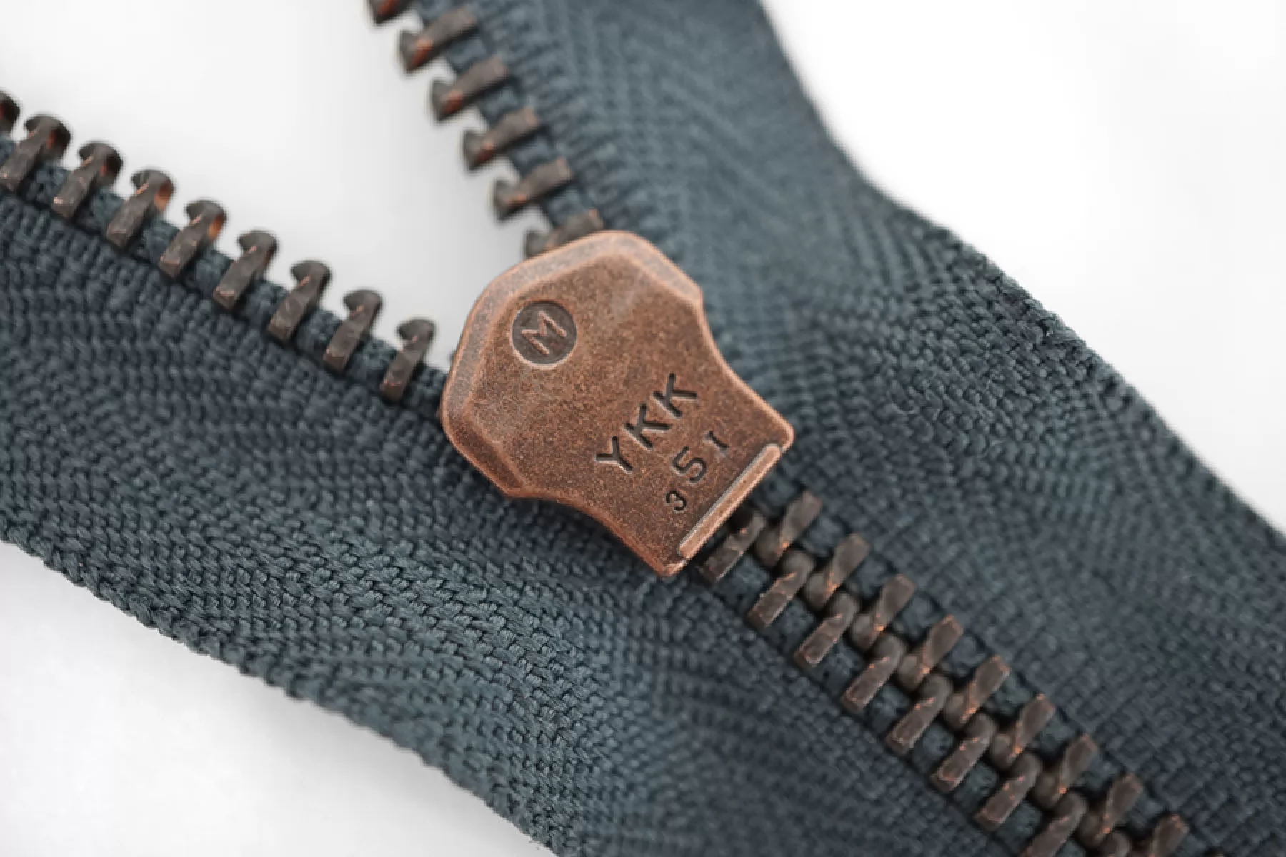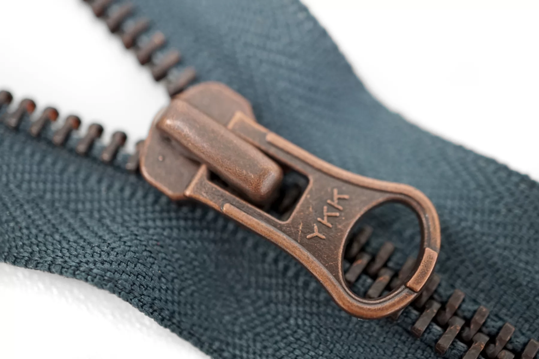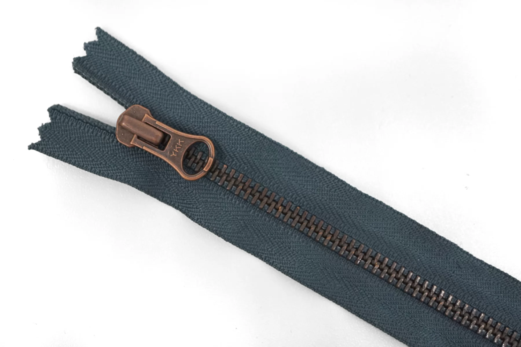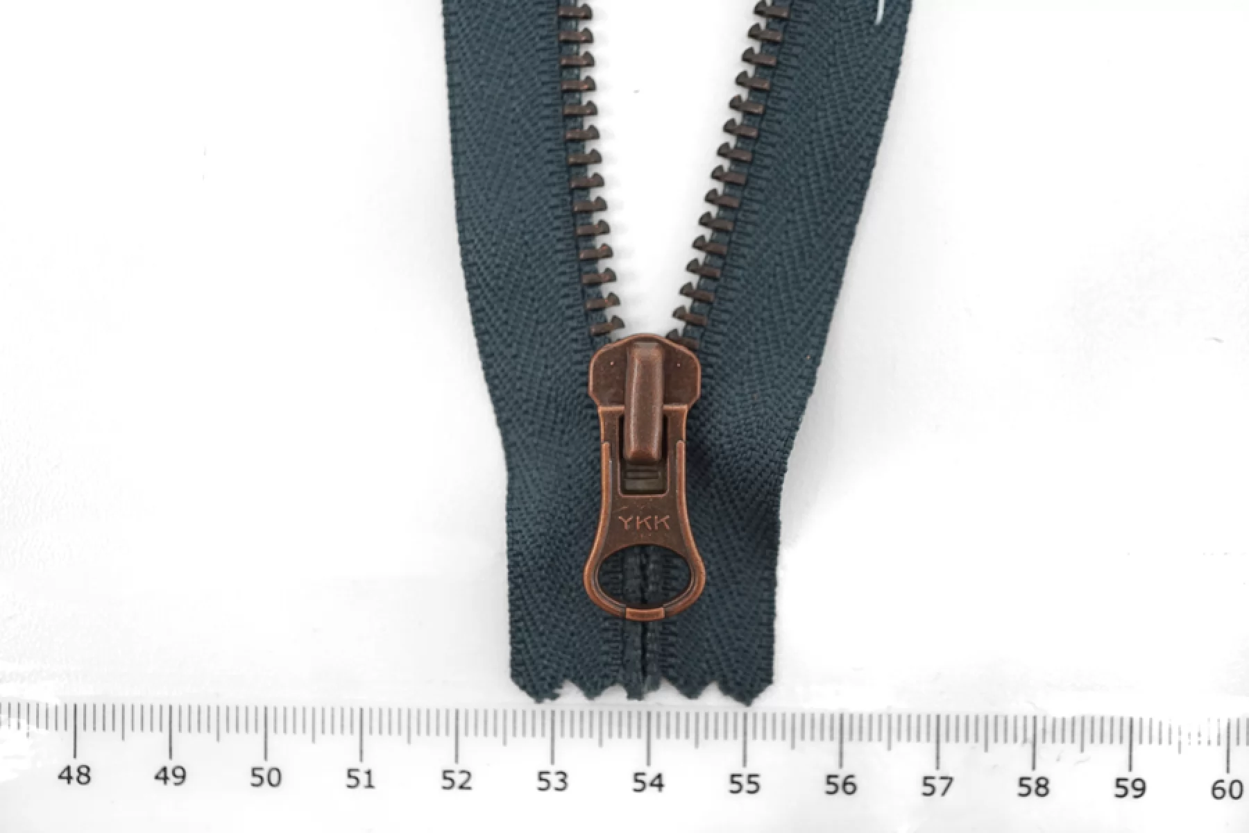Итальянская молния неразъёмная YKK, однозамковая, серо-синего оттенка. Материал зубцов, слайдера и пулера - металл, оттенки - красная бронза. Длина 11,5 см. Ширина молнии 3 см. Ширина зубцов 6 мм.