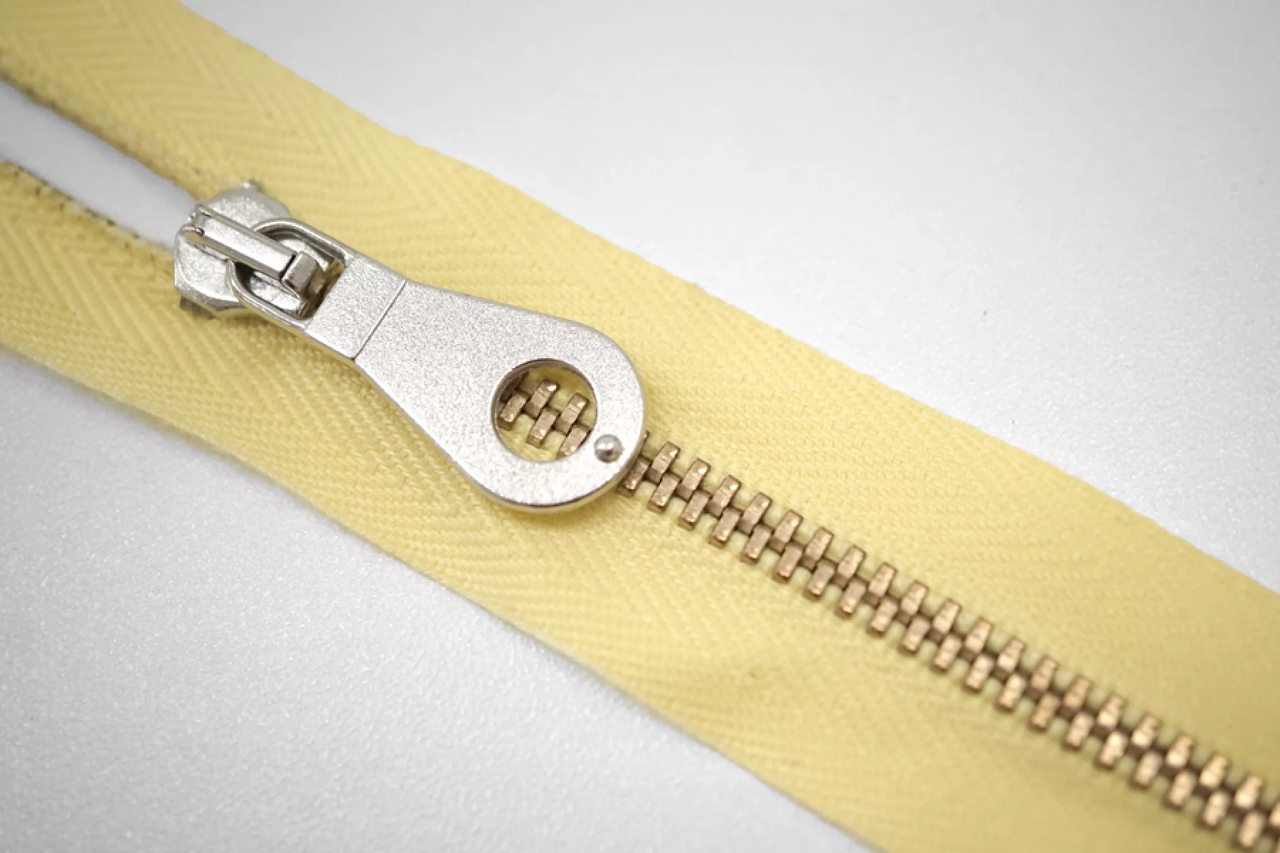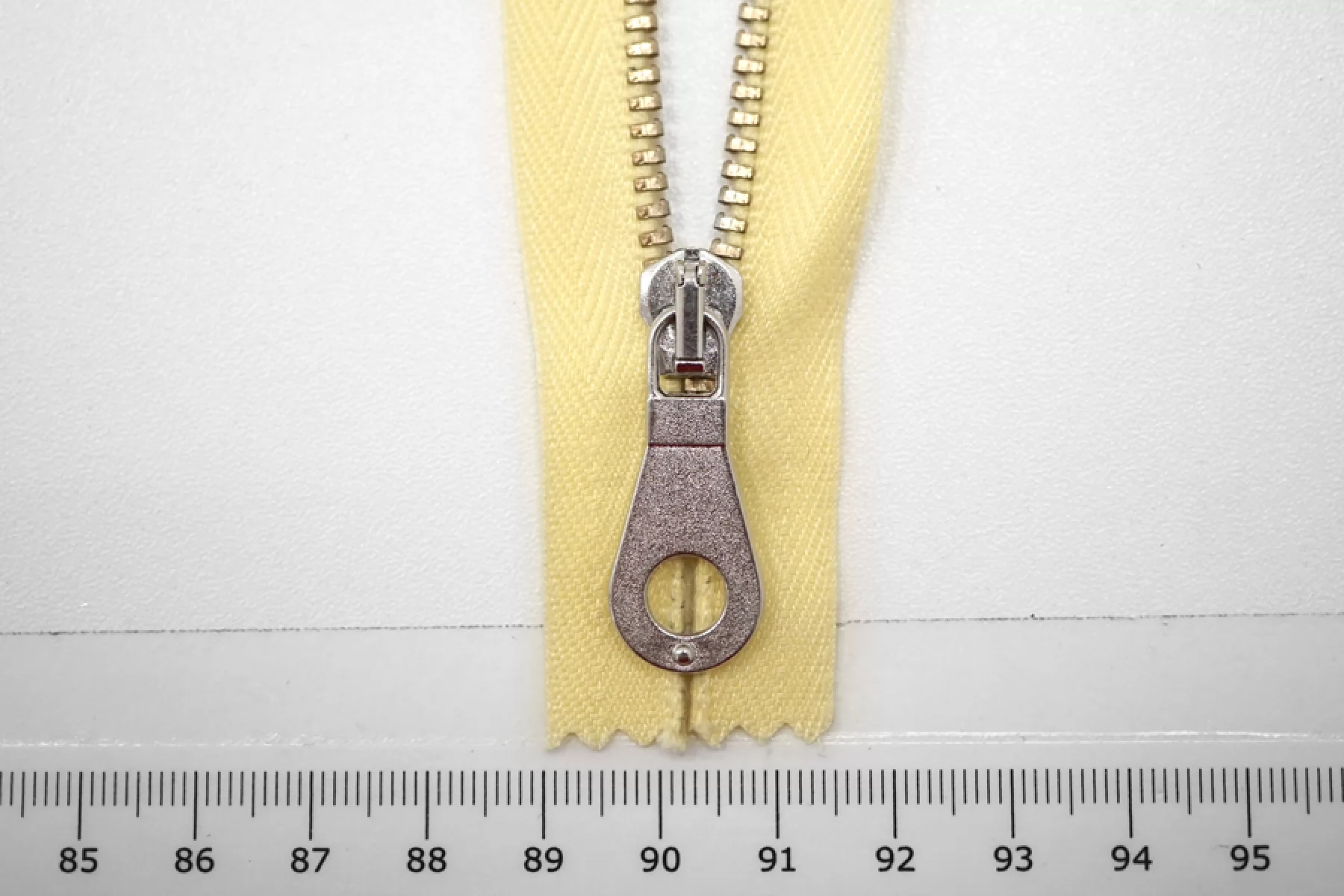 Молния металлическая от "Lampo" неразъёмная, светло-желтая, цвет зубцов - золотистый, слайдера и пулера - серебристый. Длина 70 см.