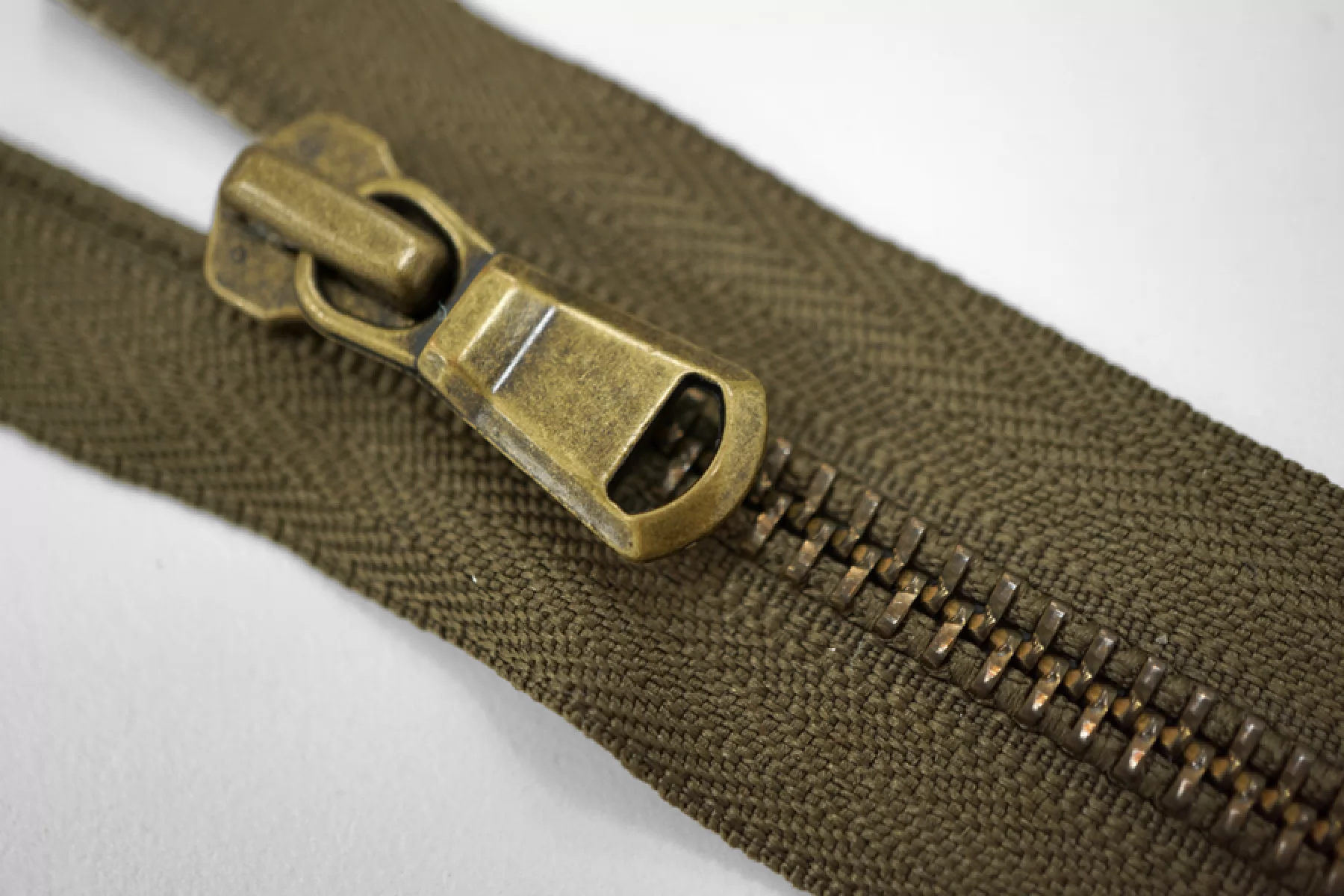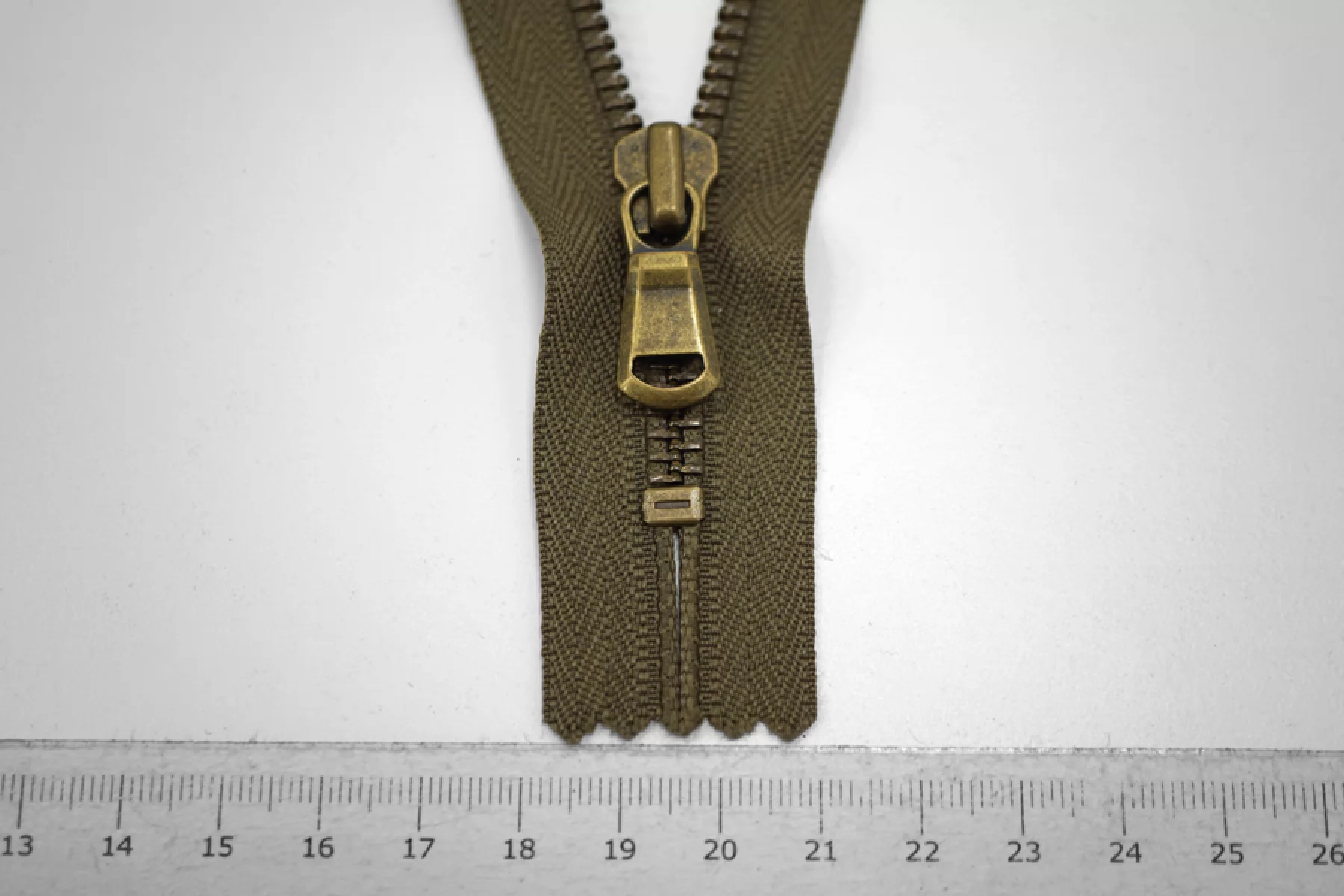 Молния металлическая от "YKK" неразъёмная, однозамковая, цвета хаки, цвет зубцов бронза. Длина 12 см.