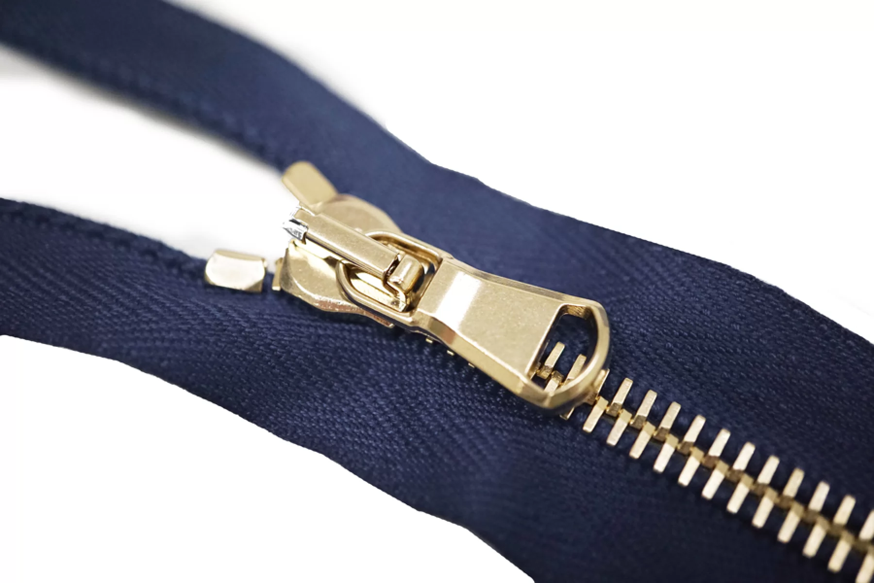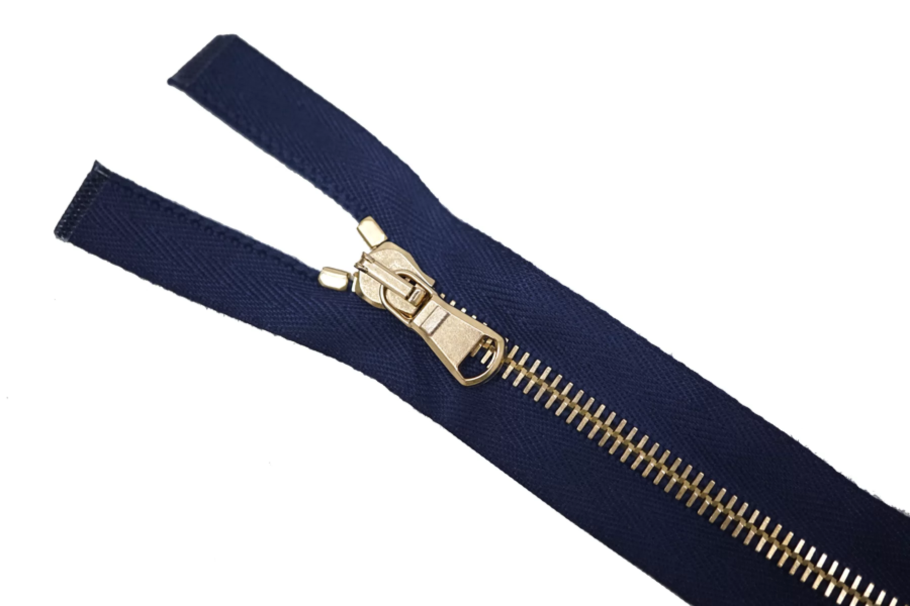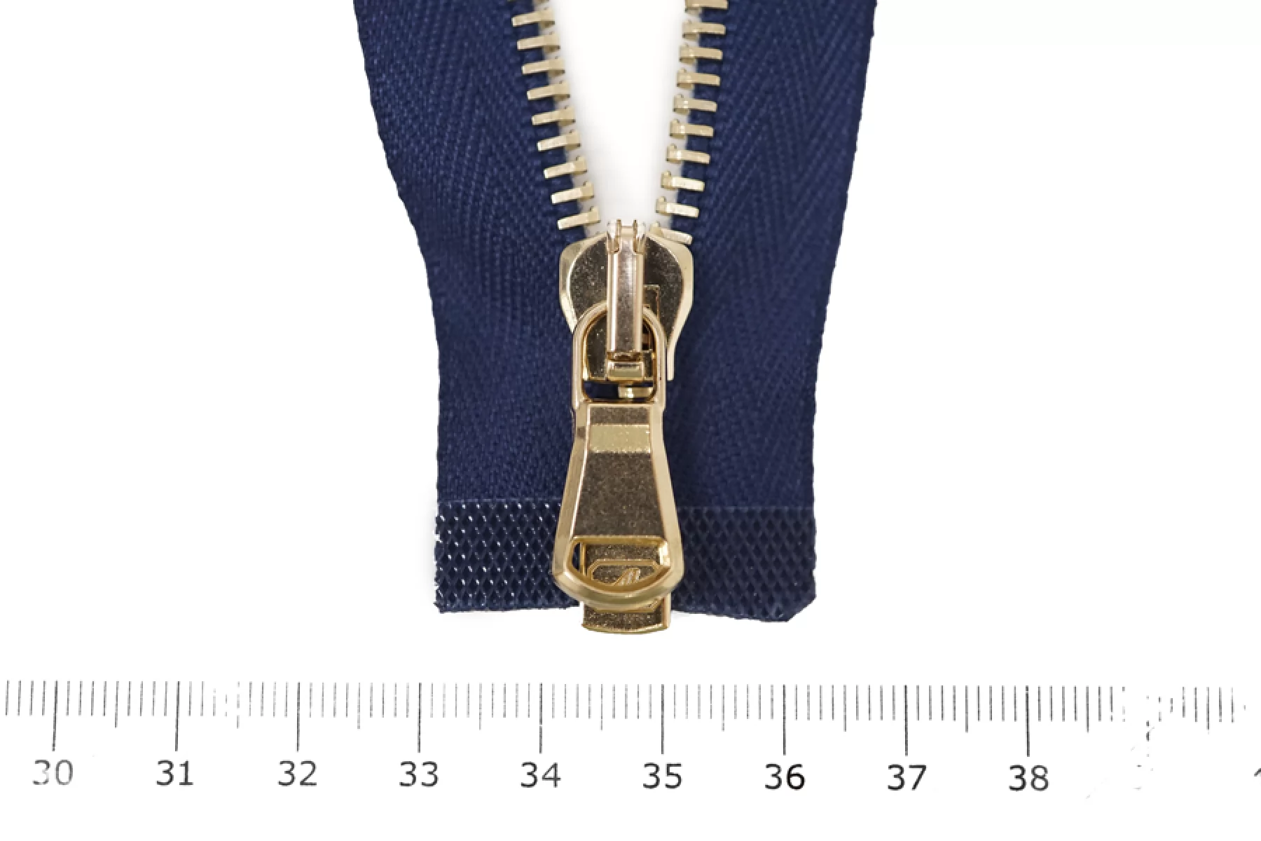 Молния металлическая однозамковая от "Lampo" разъемная. Цвет молнии - синий. Материал основы - киперная лента, цвет зубцов - золотой. Слайдер и пулер также золотистого цвета. Ширина молнии - 3.4 см, ширина зубцов 0,6 см. Длина молнии 38 см.