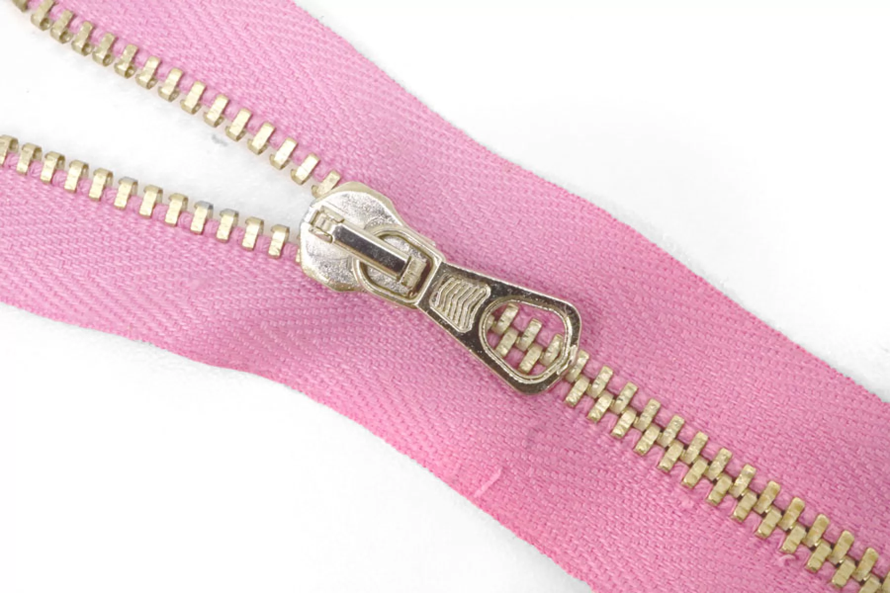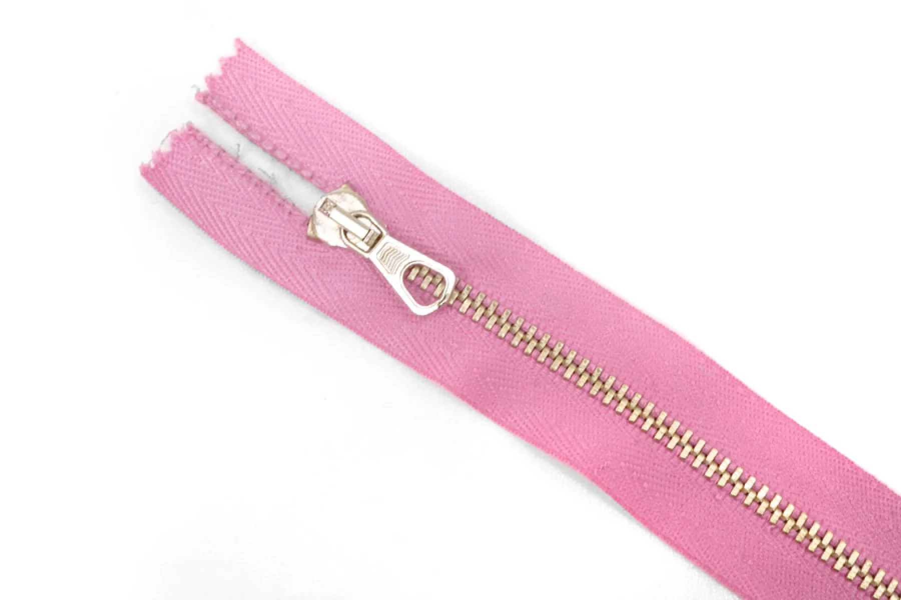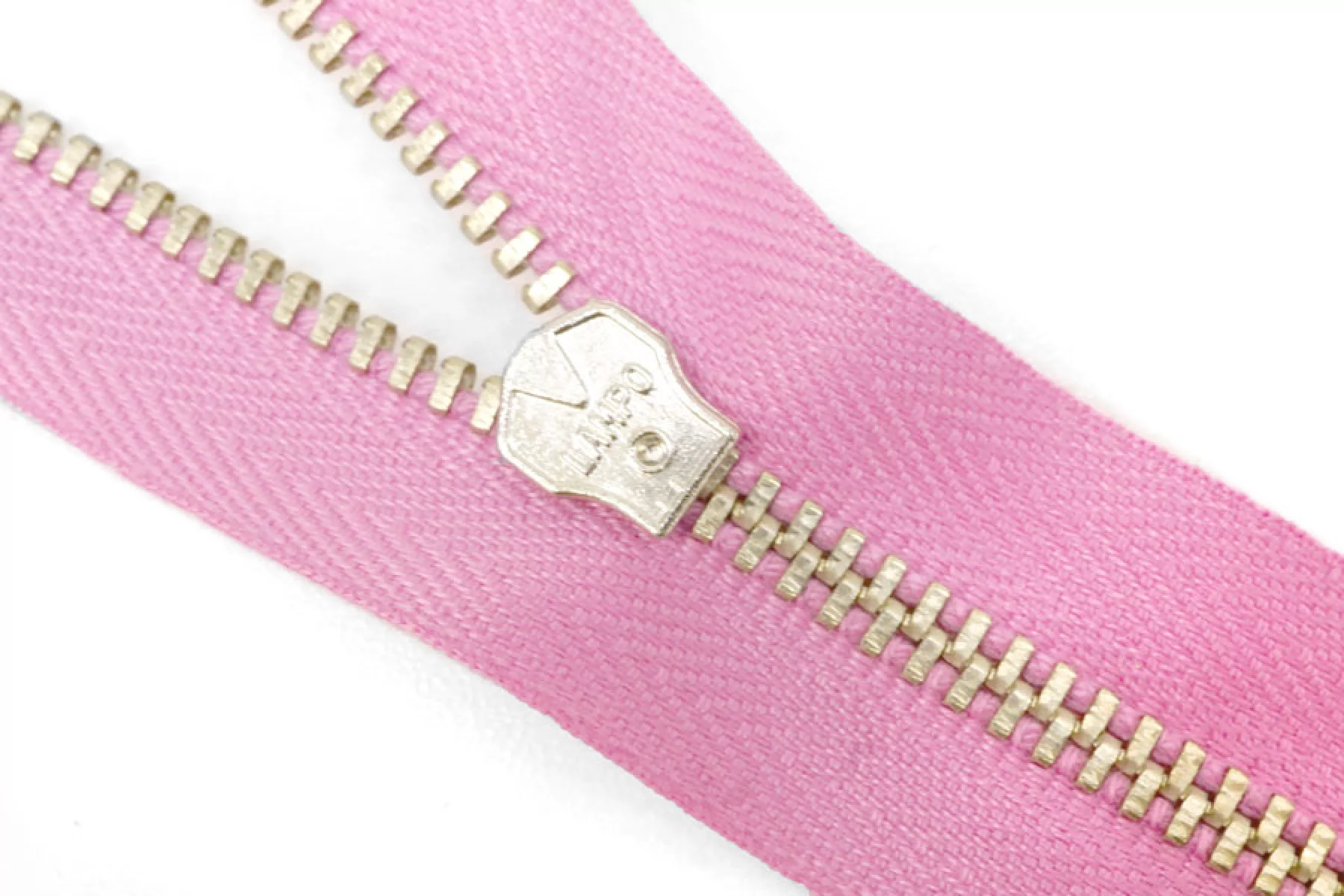Итальянская неразъемная однозамковая металлическая молния, холодного розового оттенка; зубцы, пуллер и слайдер - металлические, оттенок - светло-золотистый. Длина 14 см. Ширина 2,6 см. Ширина зубцов 4 мм.