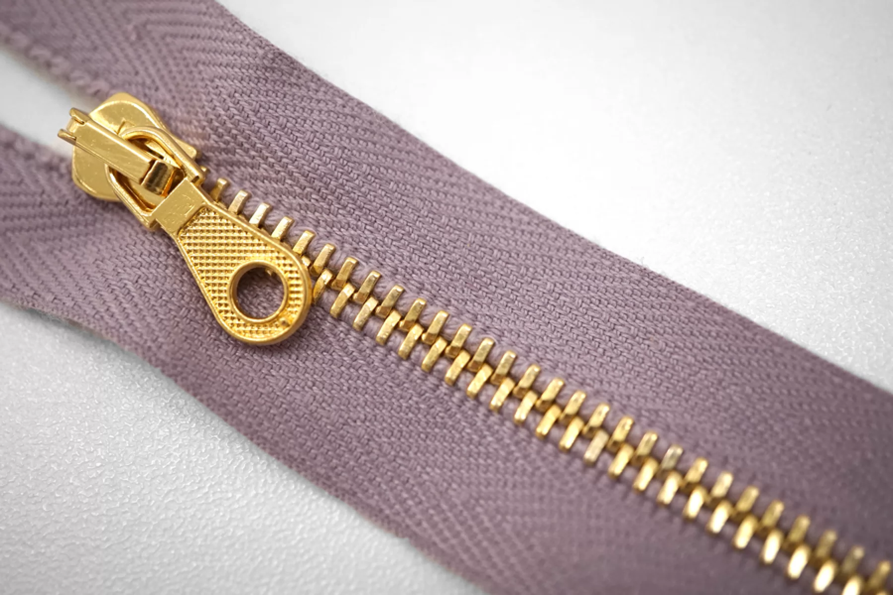 Молния металлическая однозамковая от "Lampo" неразъёмная, светло-лиловая, цвет зубцов желтое золото. Длина 16 см.