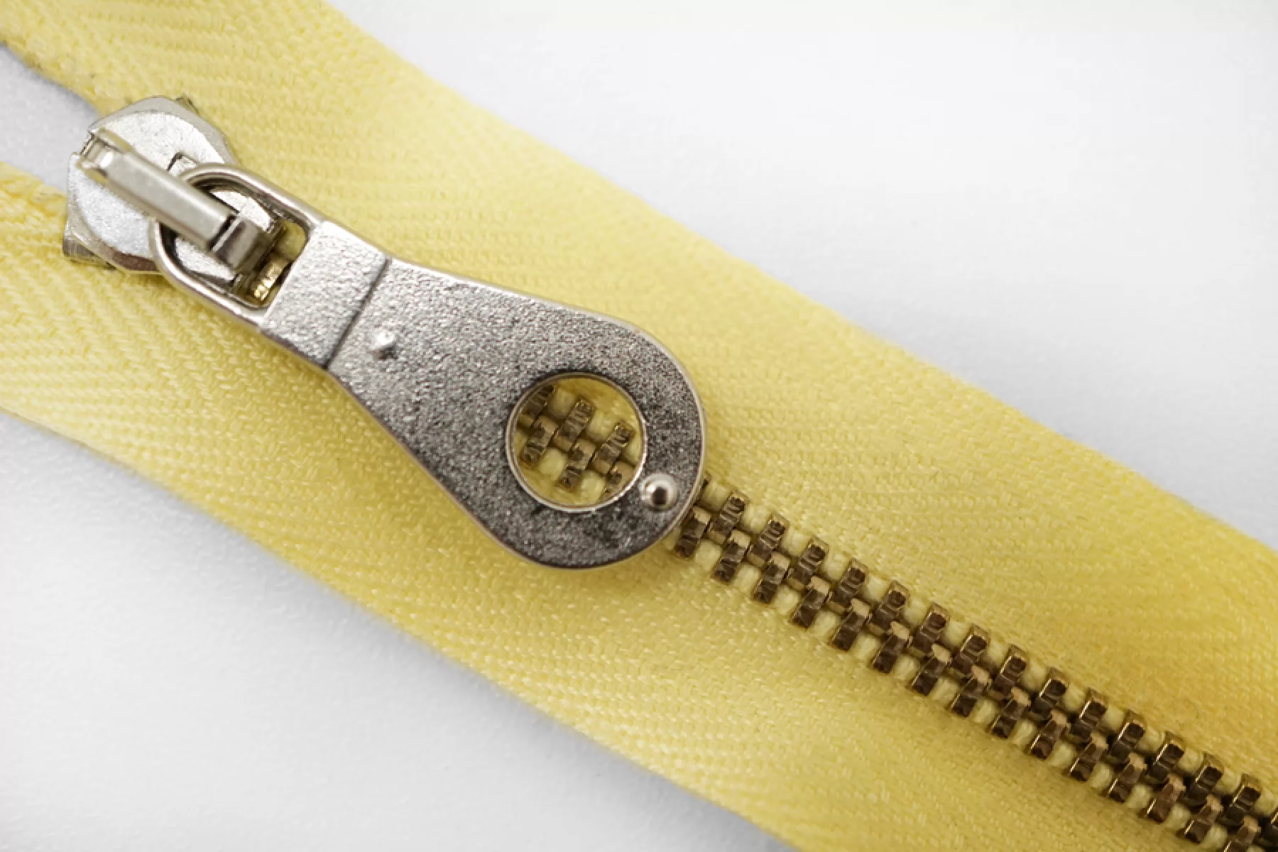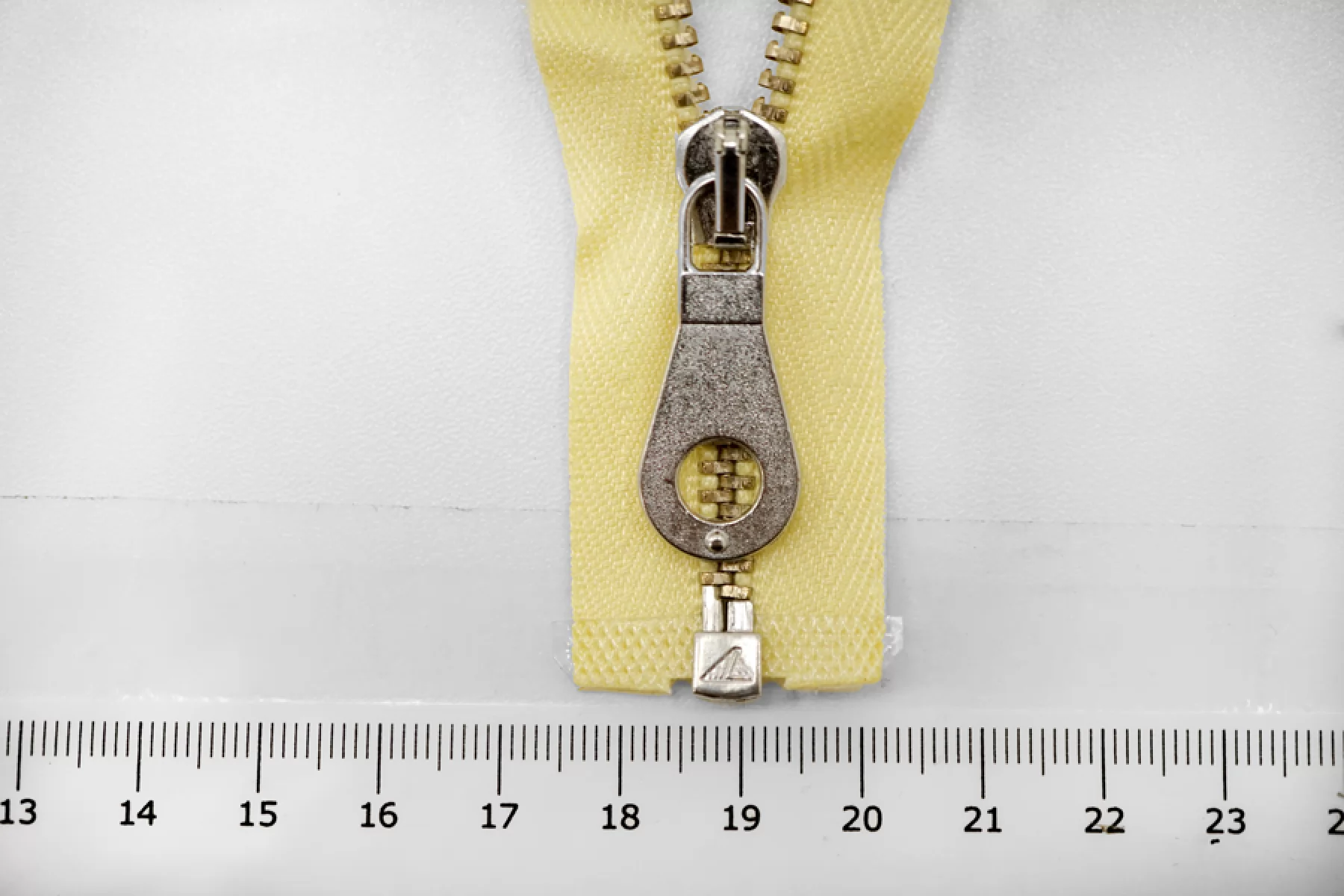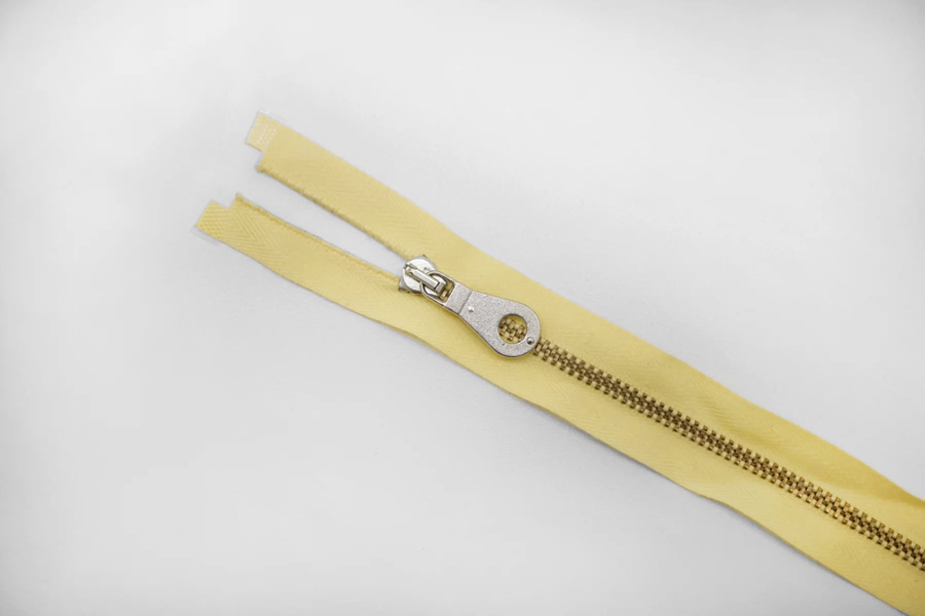 Молния металлическая однозамковая от "Lampo" разъёмная, желтого цвета, пуллер и слайдер серебристые. Длина 60 см.