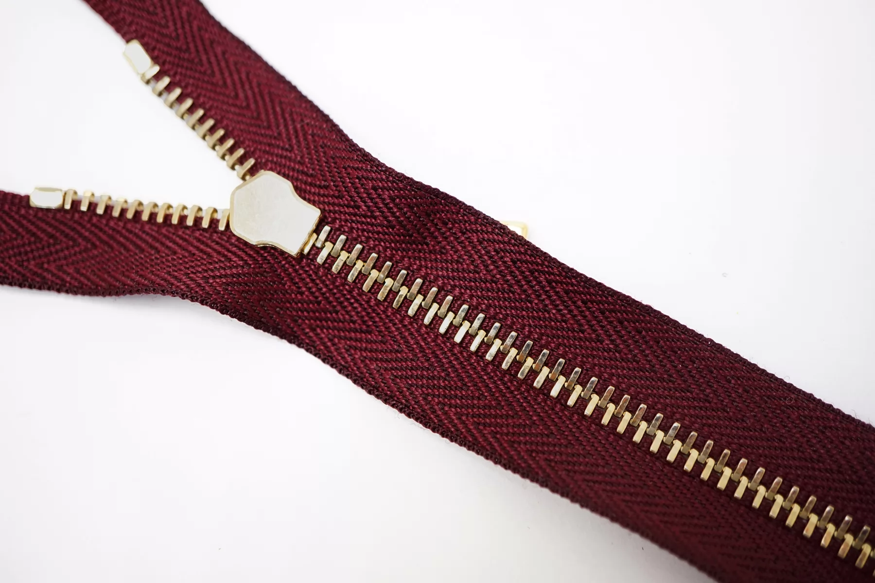 Молния металлическая YKK однозамковая, неразъёмная, тёмно-винная, цвет зубцов и пуллеров-золотистый. Длина 55 см.