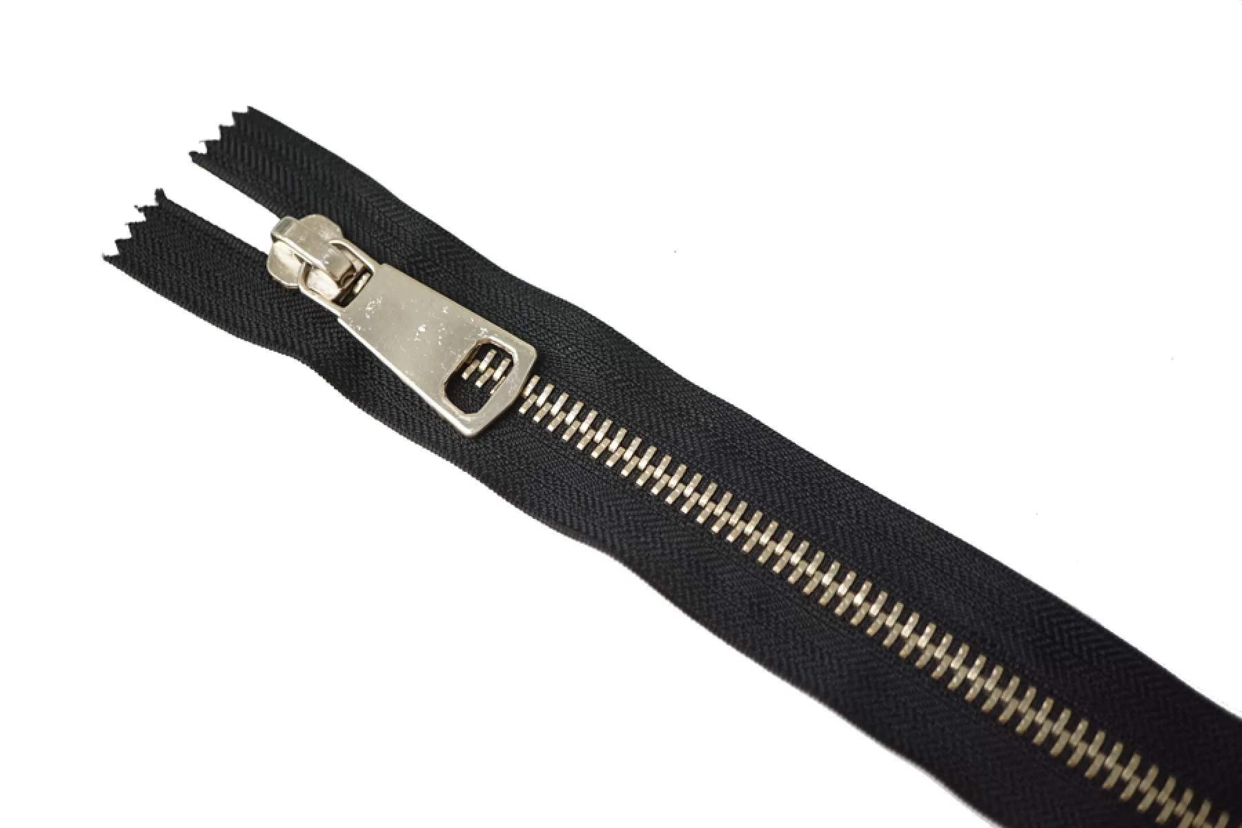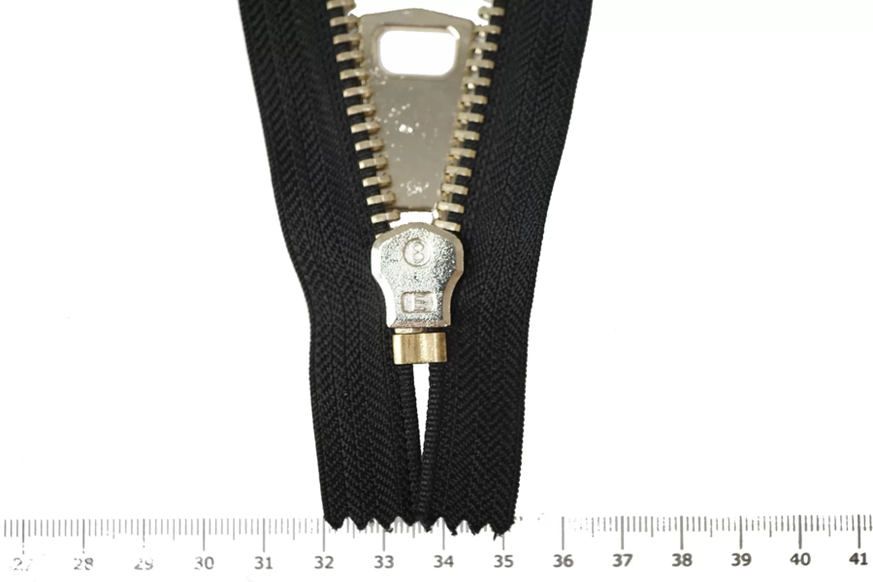 Молния металлическая, разъемная, один замок. Цвет молнии черный, цвет зубцов, пуллера и слайдера золото. Длина 45см. Ширина молнии 3,5см, ширина зубцов 6мм.