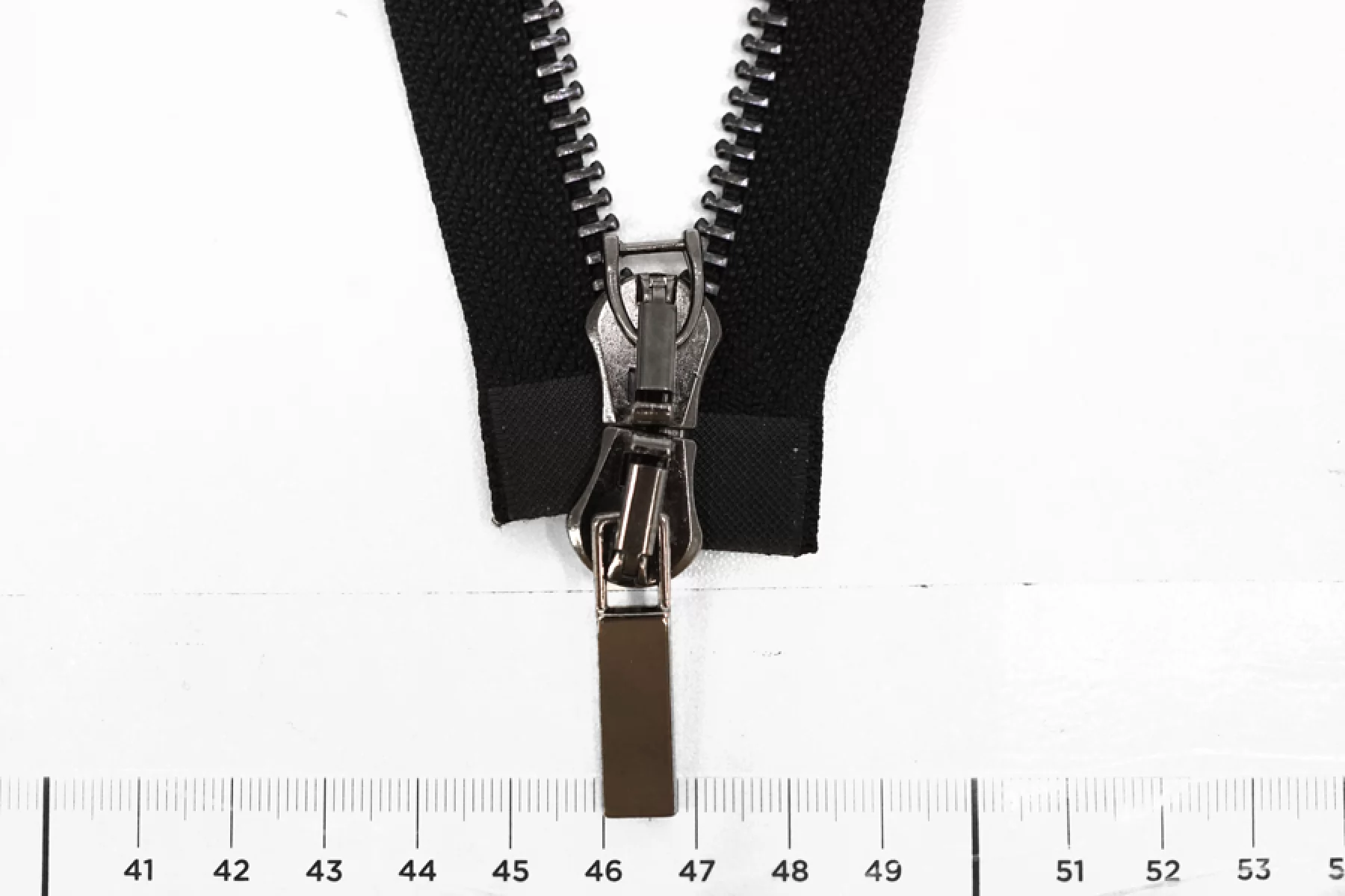 Молния металлическая разъемная двухзамковая. Цвет молнии черный, цвет зубцов, пуллера и слайдера темный никель. Длина 100 см. Ширина молнии 3см, ширина зубцов 6мм.