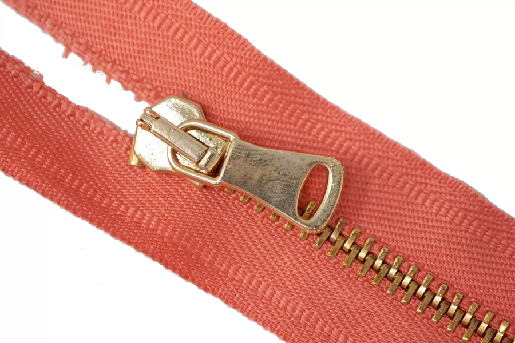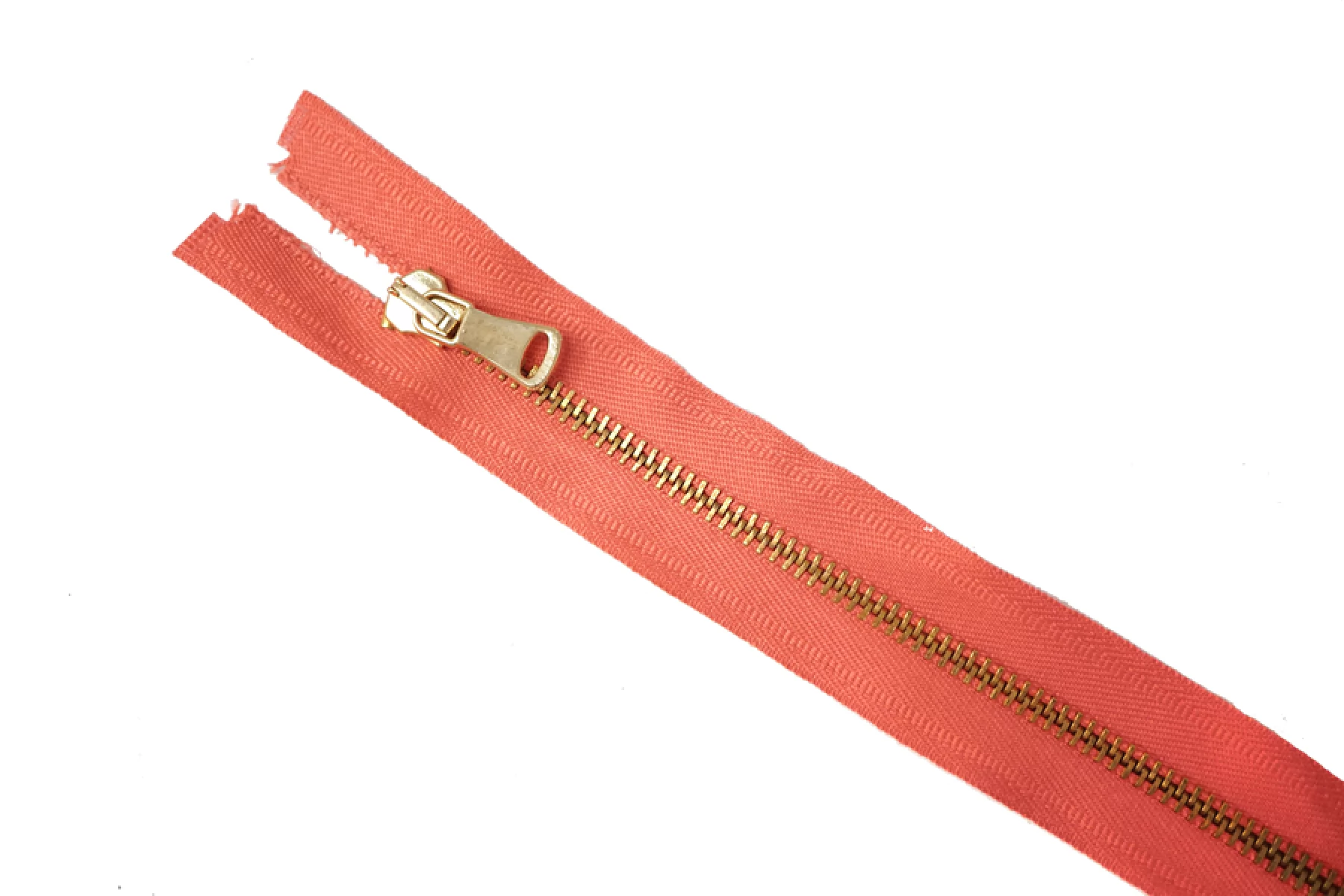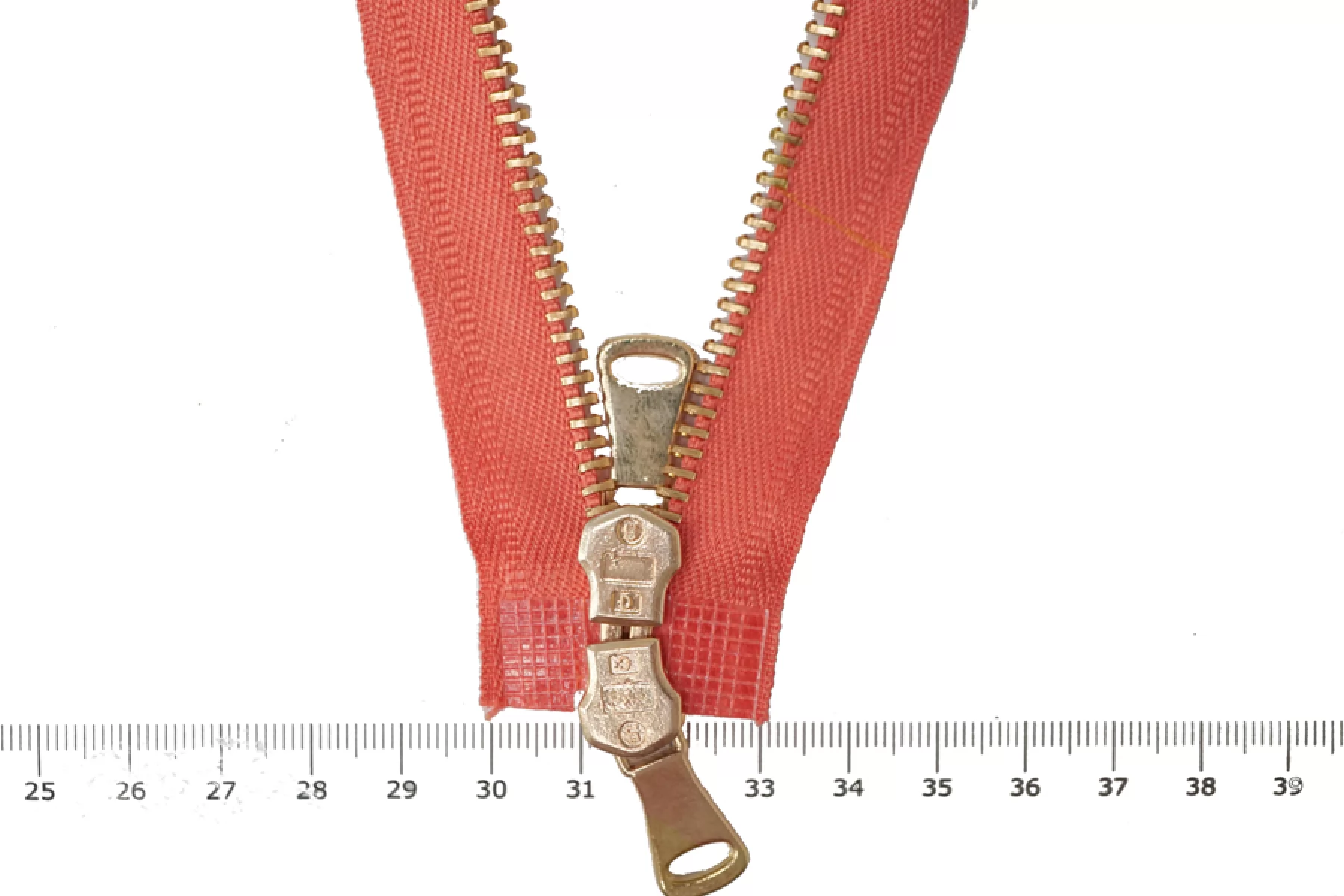 Молния металлическая разъемная, двузамочная, кораллового оттенка, цвет зубцов, пуллера и слайдера золото. Длина 78см. Ширина молнии 3,2 см, ширина зубцов 5 мм.