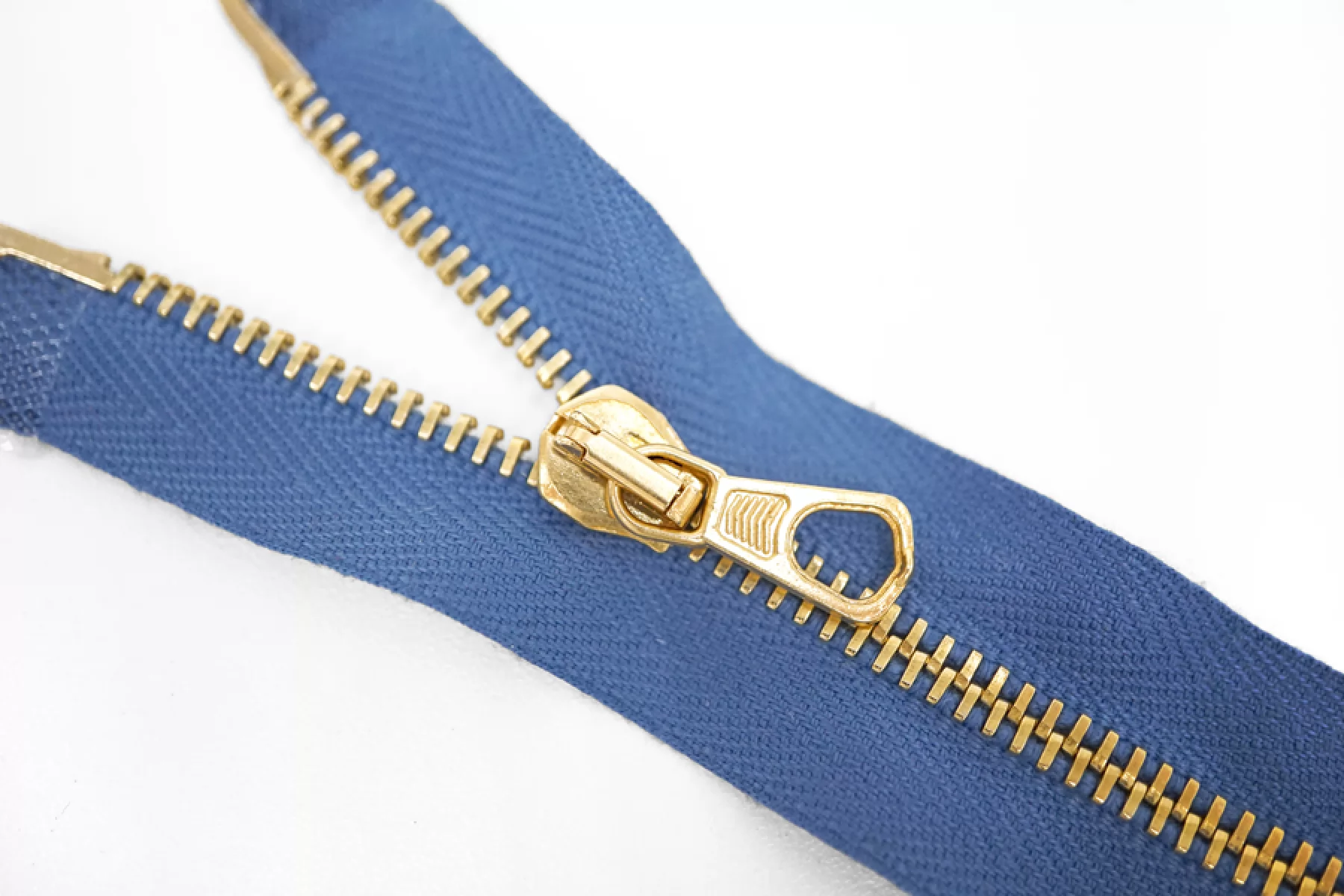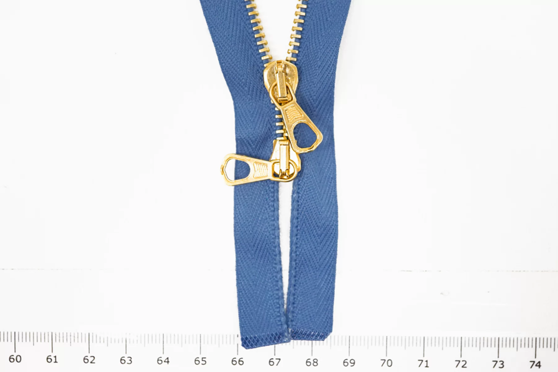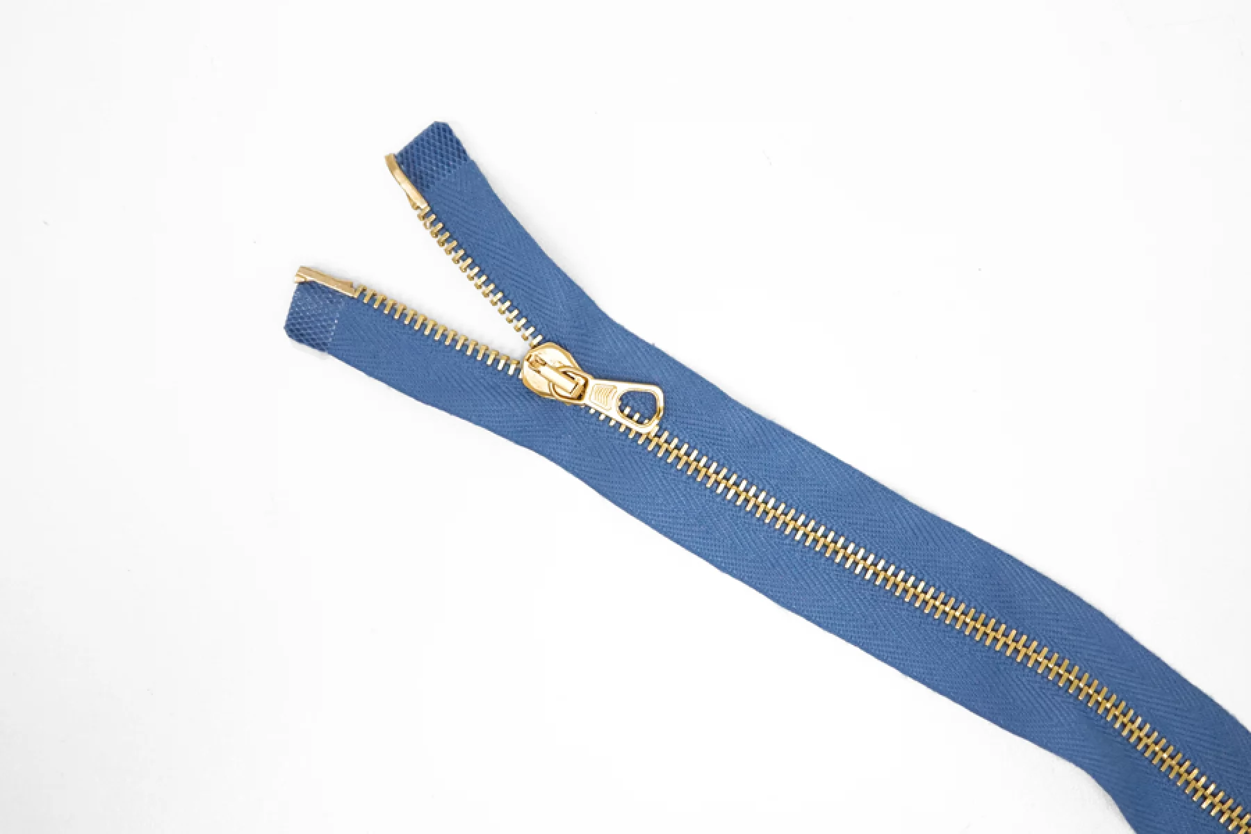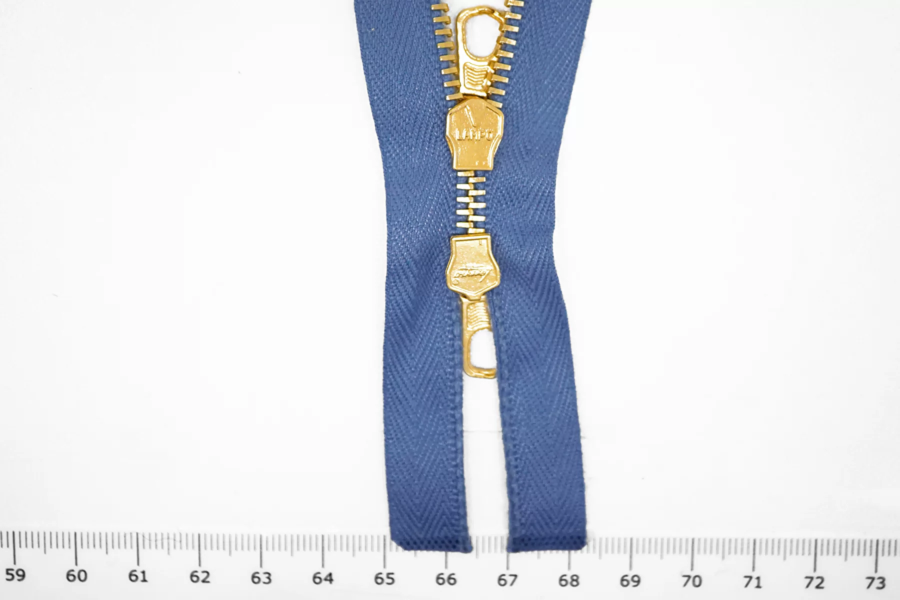 Металлическая молния "Lampo" разъёмная, двухзамочная, голубого оттенка. Цвет зубцов, слайдер и пулер металлического золотистого цвета. Длина 40 см. Ширина молнии 2,7 см. Ширина зубцов 5 мм.