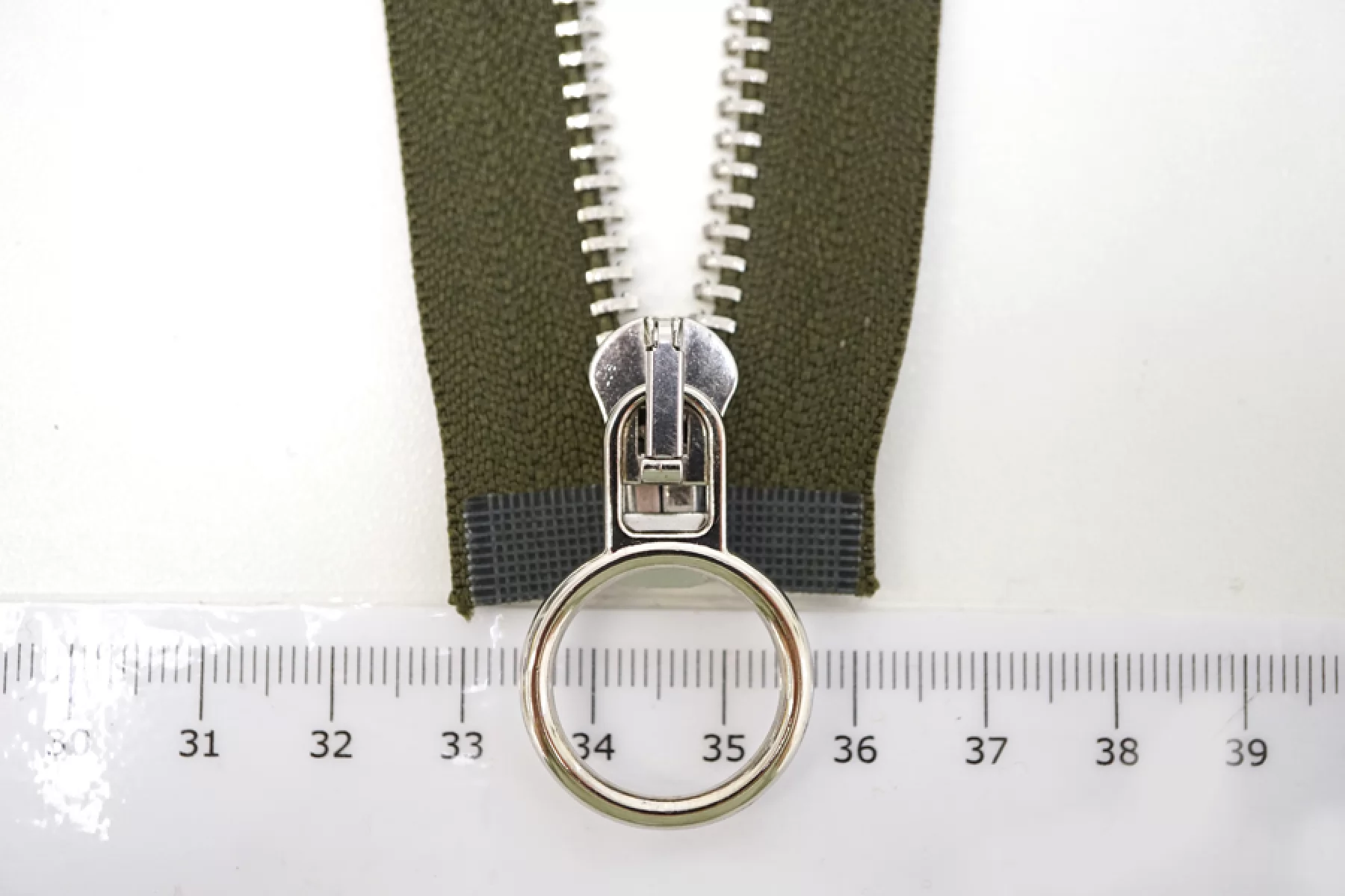 Молния разъемная, однозамковая, цвета хаки, цвет зубцов серебро, цвет пуллера и слайдера также серебряного цвета . Длина 44,5 см. Ширина молнии 3,1 см, ширина зубцов 6 мм.