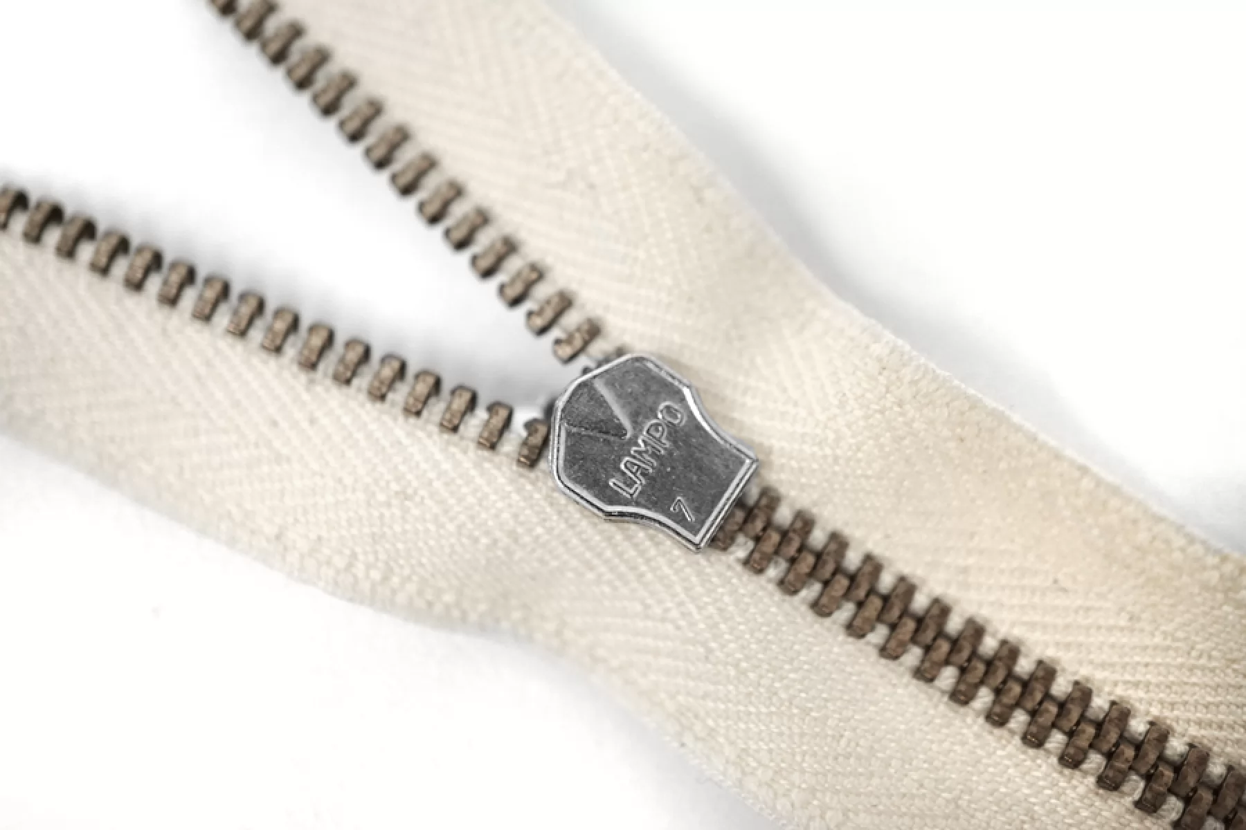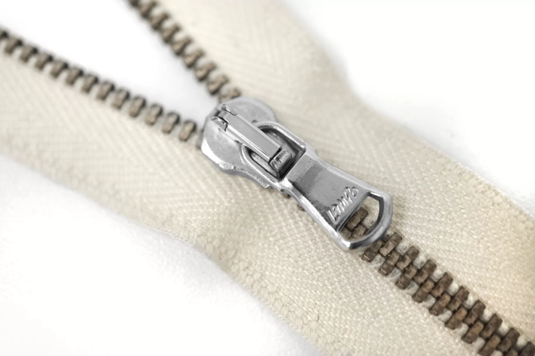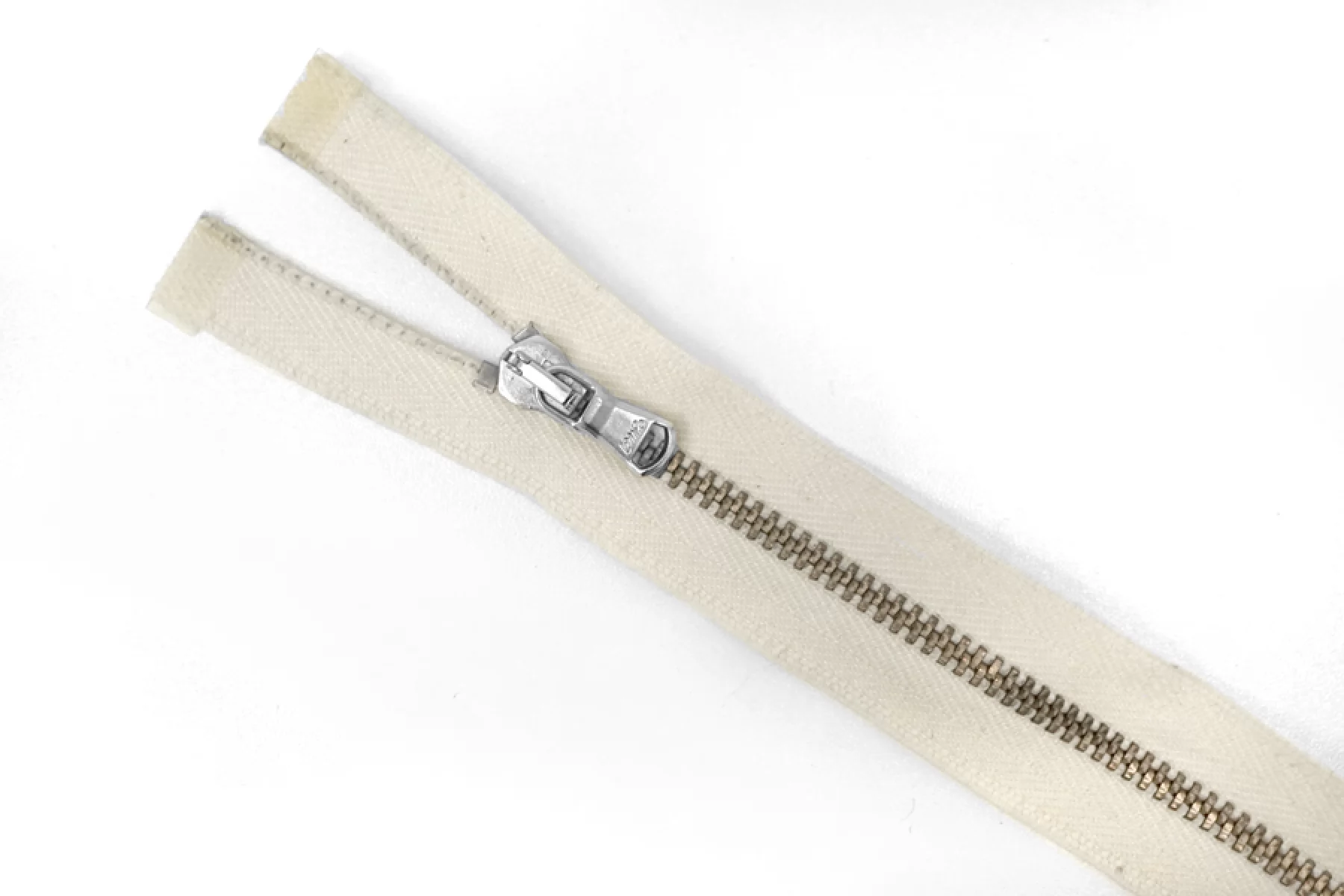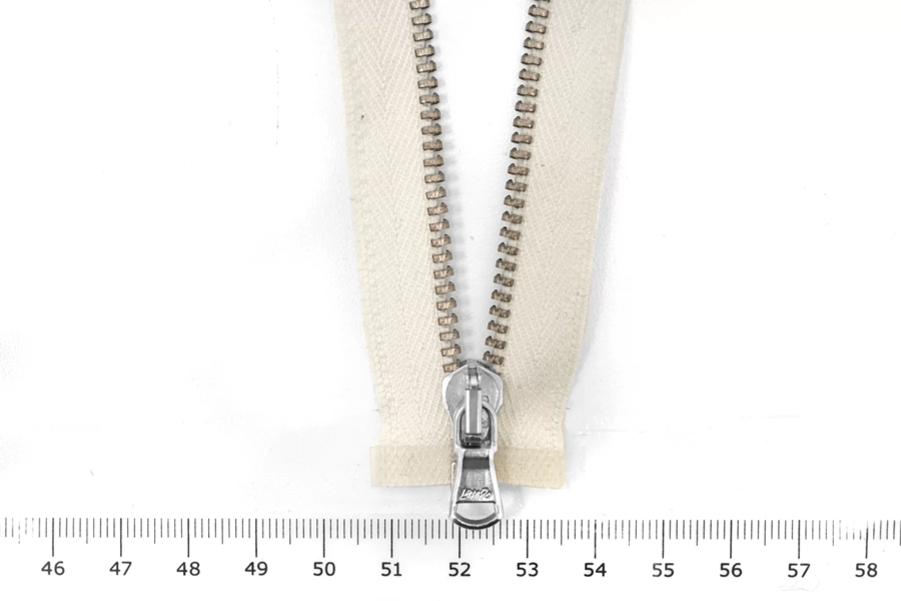 Итальянская молния металлическая, разъемная, однозамковая, цвет - молочно-бежевый с сероватым подтоном, материал зубцов, пуллера и слайдера - металл, оттенок - латунь и серебро. Длина 54 см. Ширина молнии 2,6 см, ширина зубцов 5 мм.