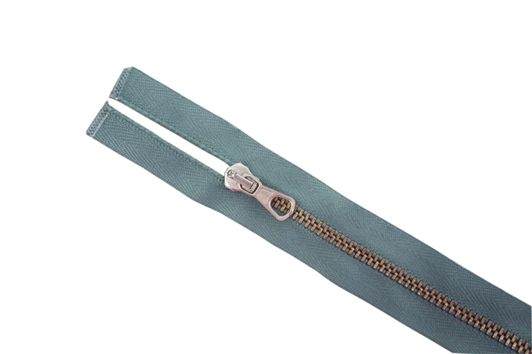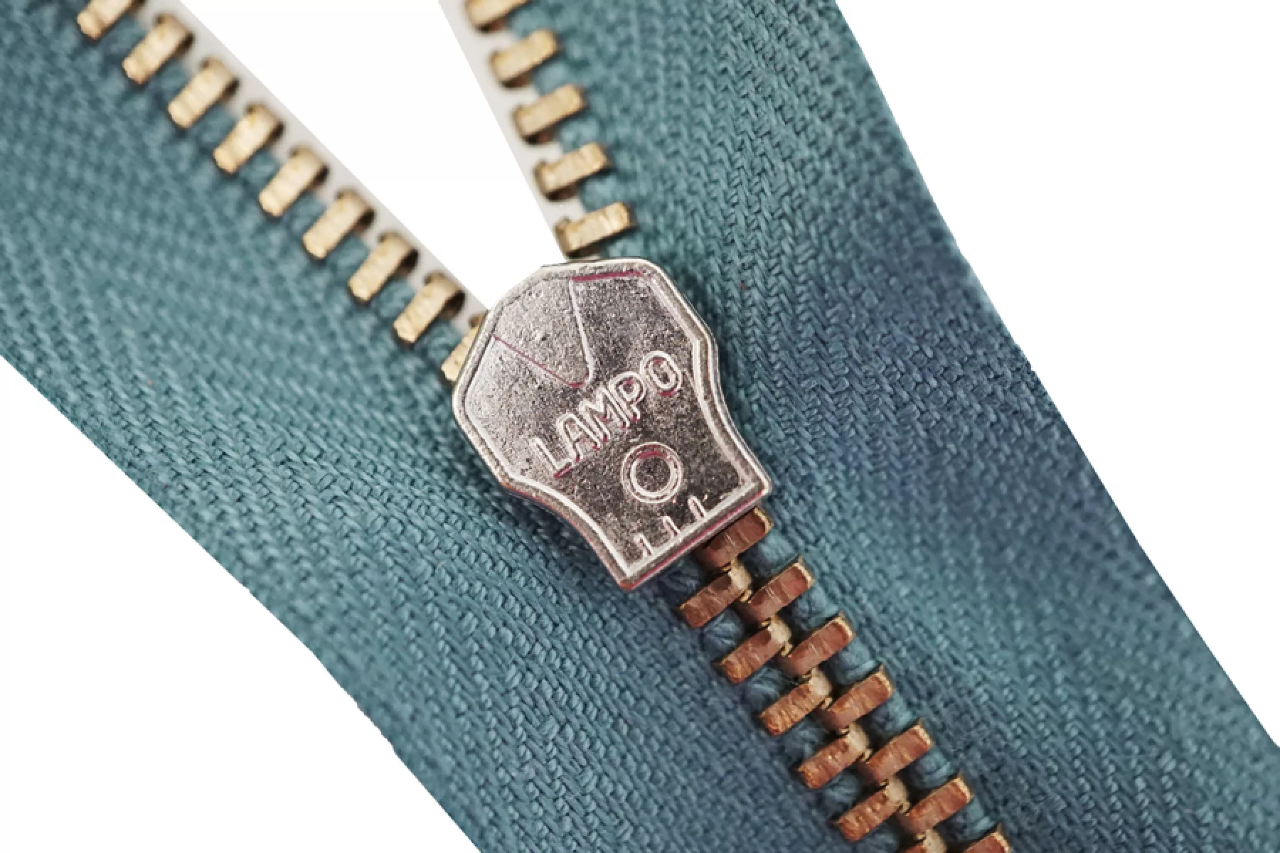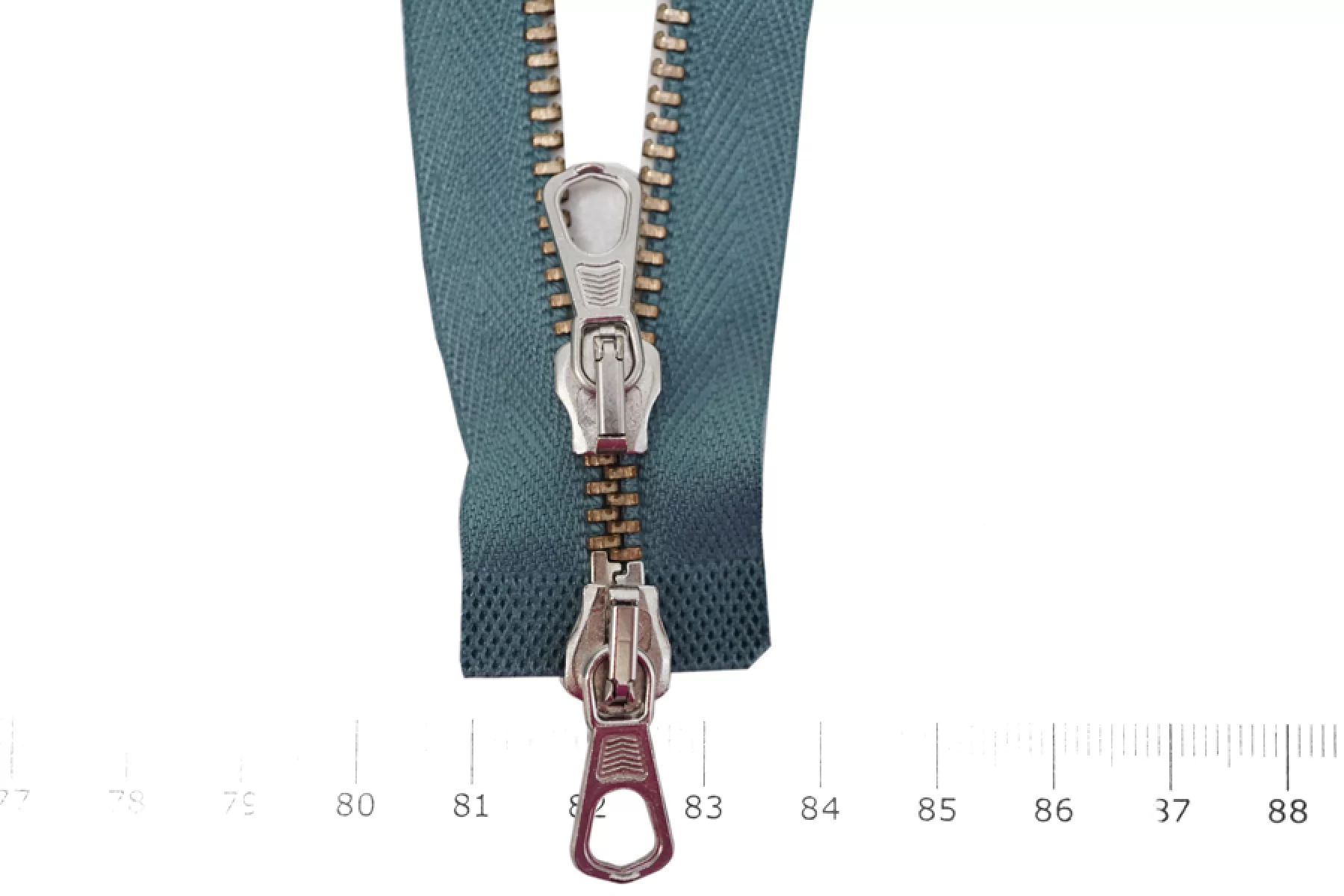 Молния от Итальянского производителя "Lampo" разъемная, двухзамковая, серо-голубая, цвет зубцов бронза, цвет пуллера и слайдера серебряные. Длина 42,5 см. Ширина молнии 2,6 см, ширина зубцов 5 мм.