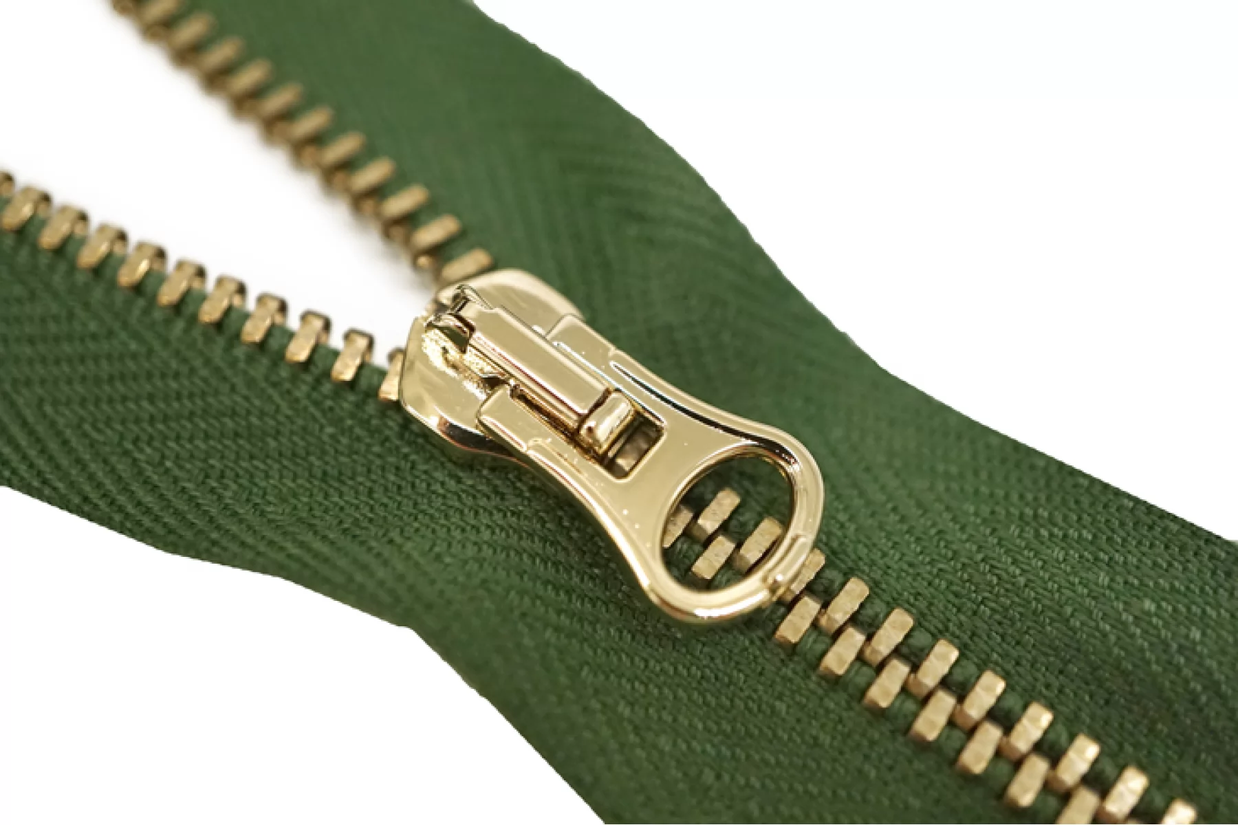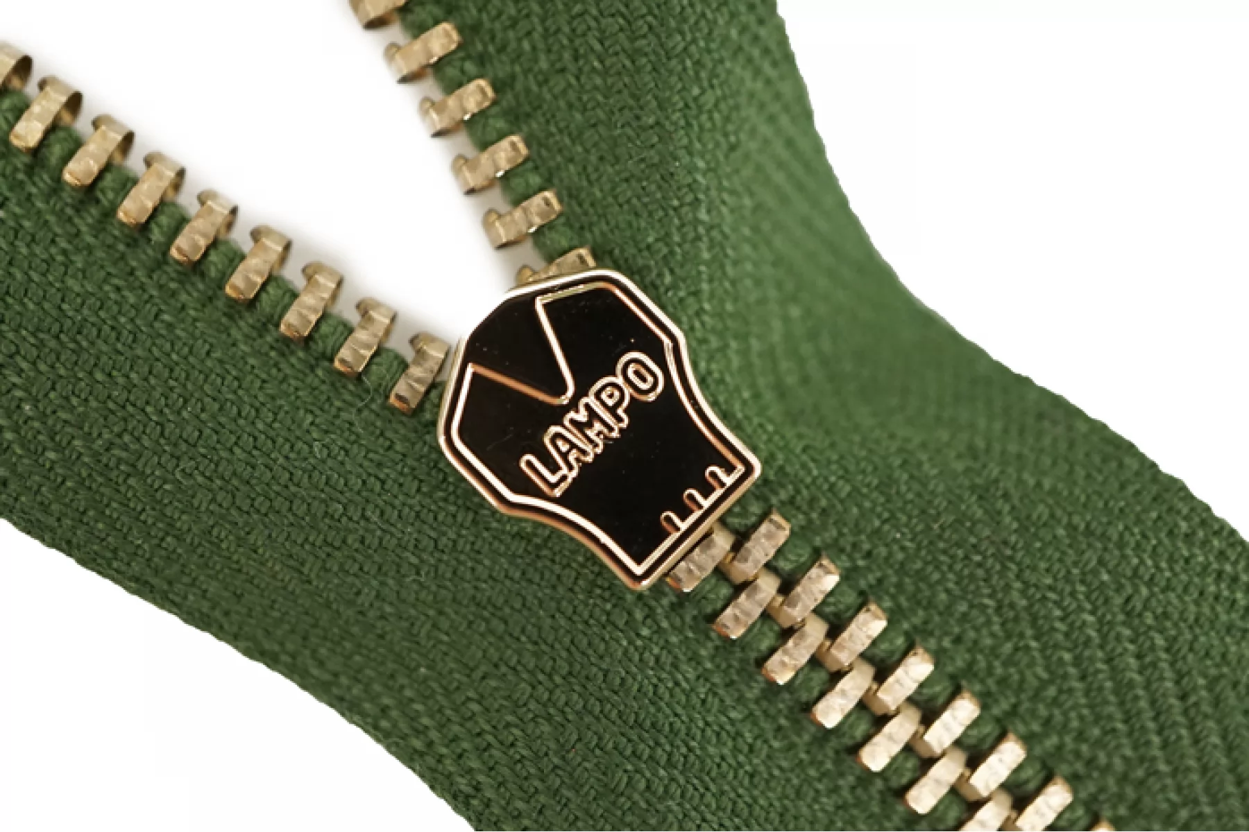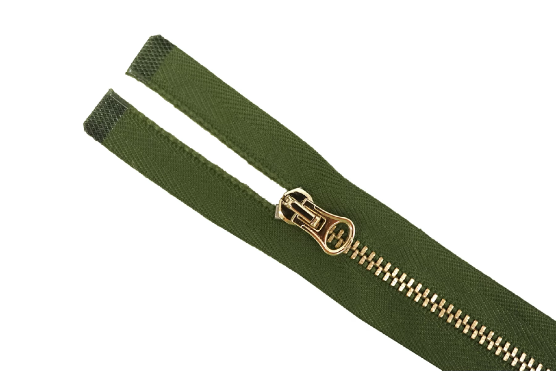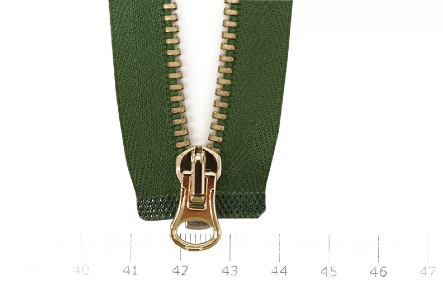 Молния от Итальянского производителя "Lampo" разъемная, однозамковая, зеленого цвета, цвет зубцов - латунь, пуллер и слайдер - золотого цвета. Ширина молнии - 2,7 см, ширина зубцов 5 мм. Длина молнии - 35 см.