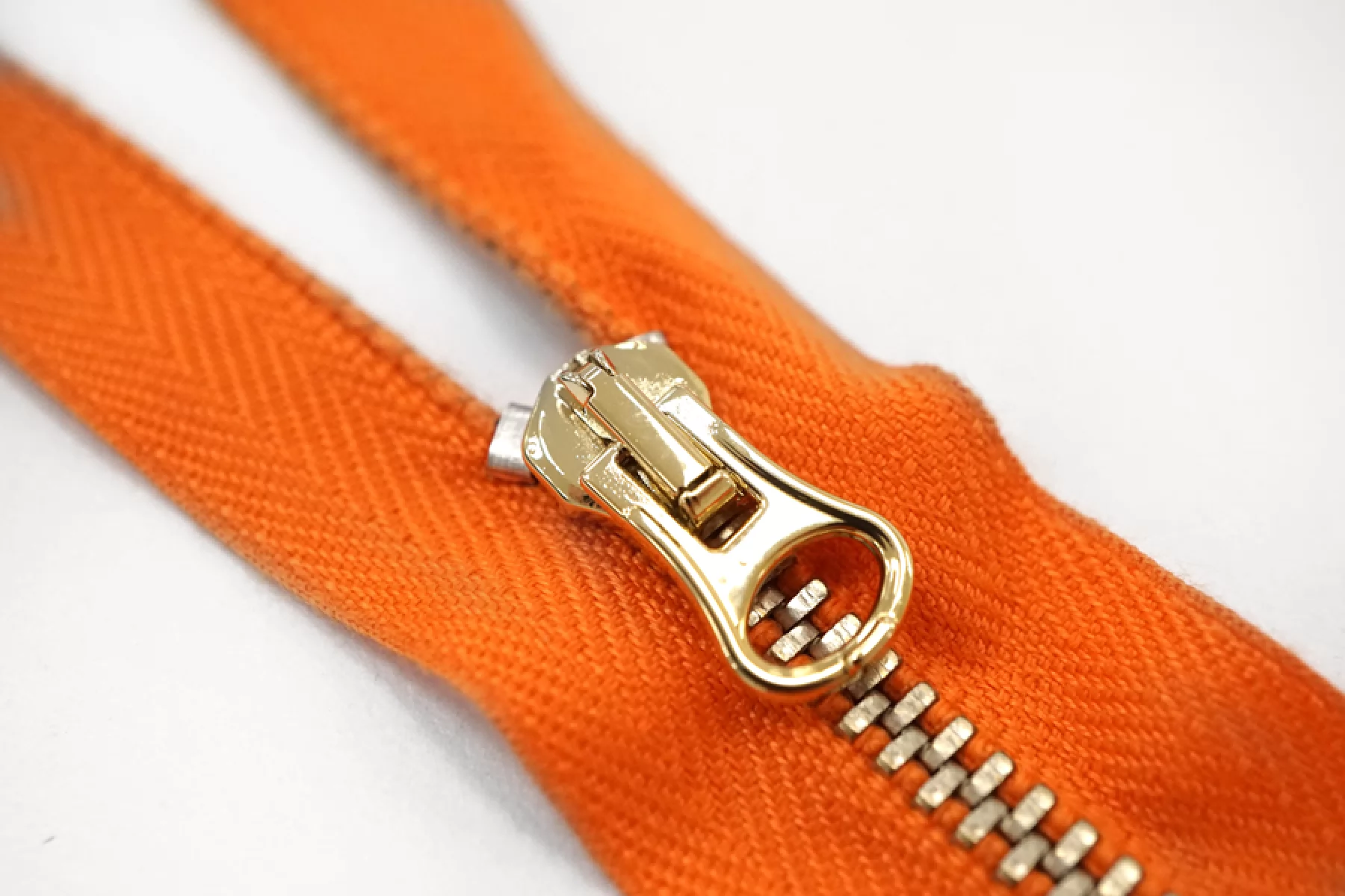 Молния от "Lampo" разъемная, оранжевого цвета, цвет зубцов - серебристый, цвет пуллера и слайдера - золотистый. Длина 37 см.