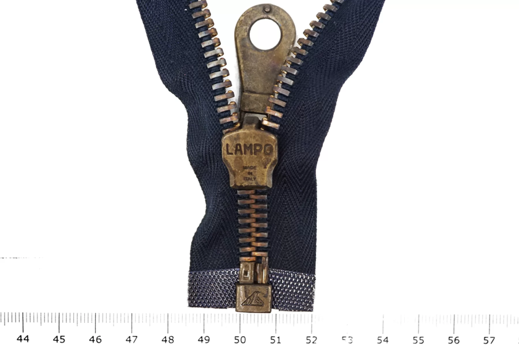 Молния от "Lampo" разъемная, однозамковая, темно-синего цвета, цвет зубцов бронза. Длина 59см. Ширина молнии 3,4см. Ширина зубцов 8мм.