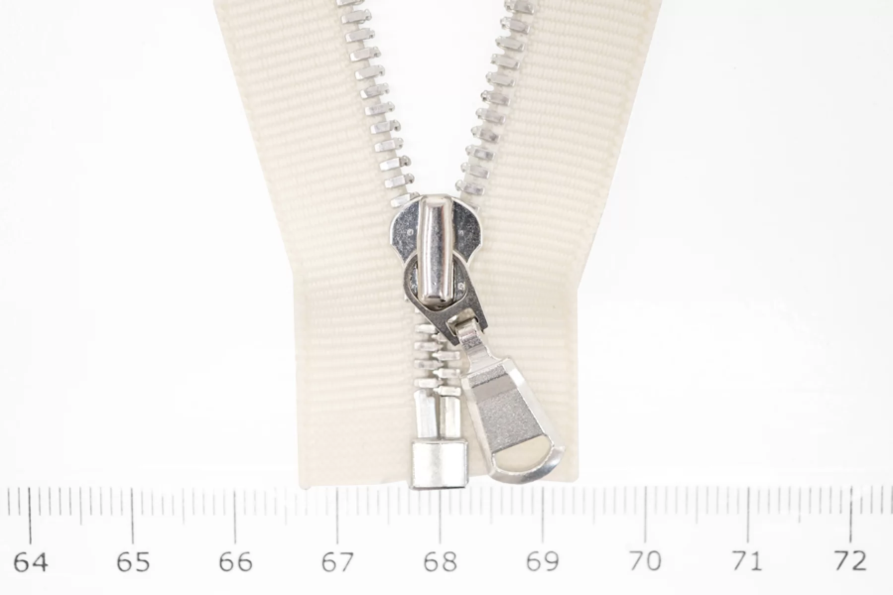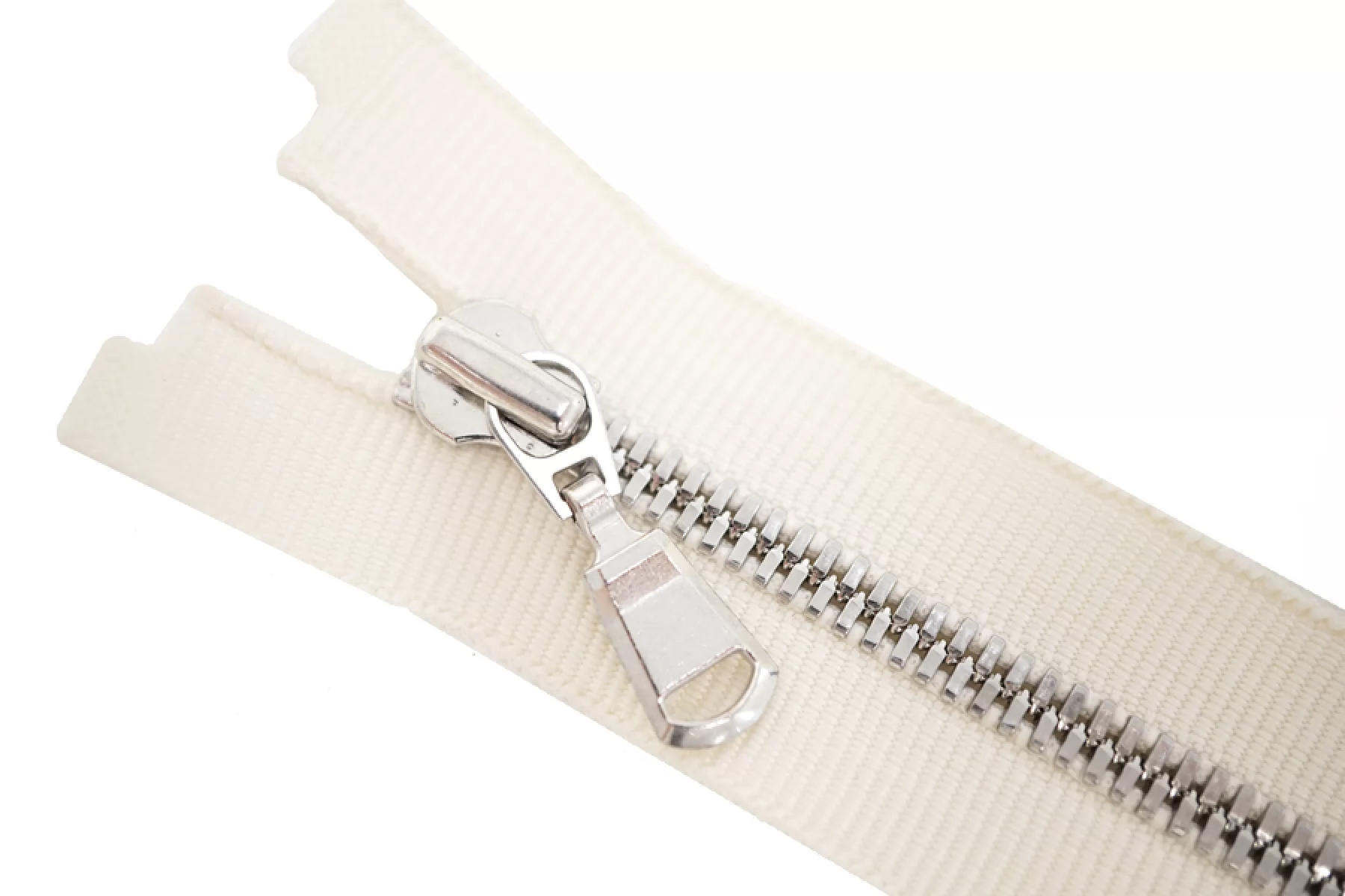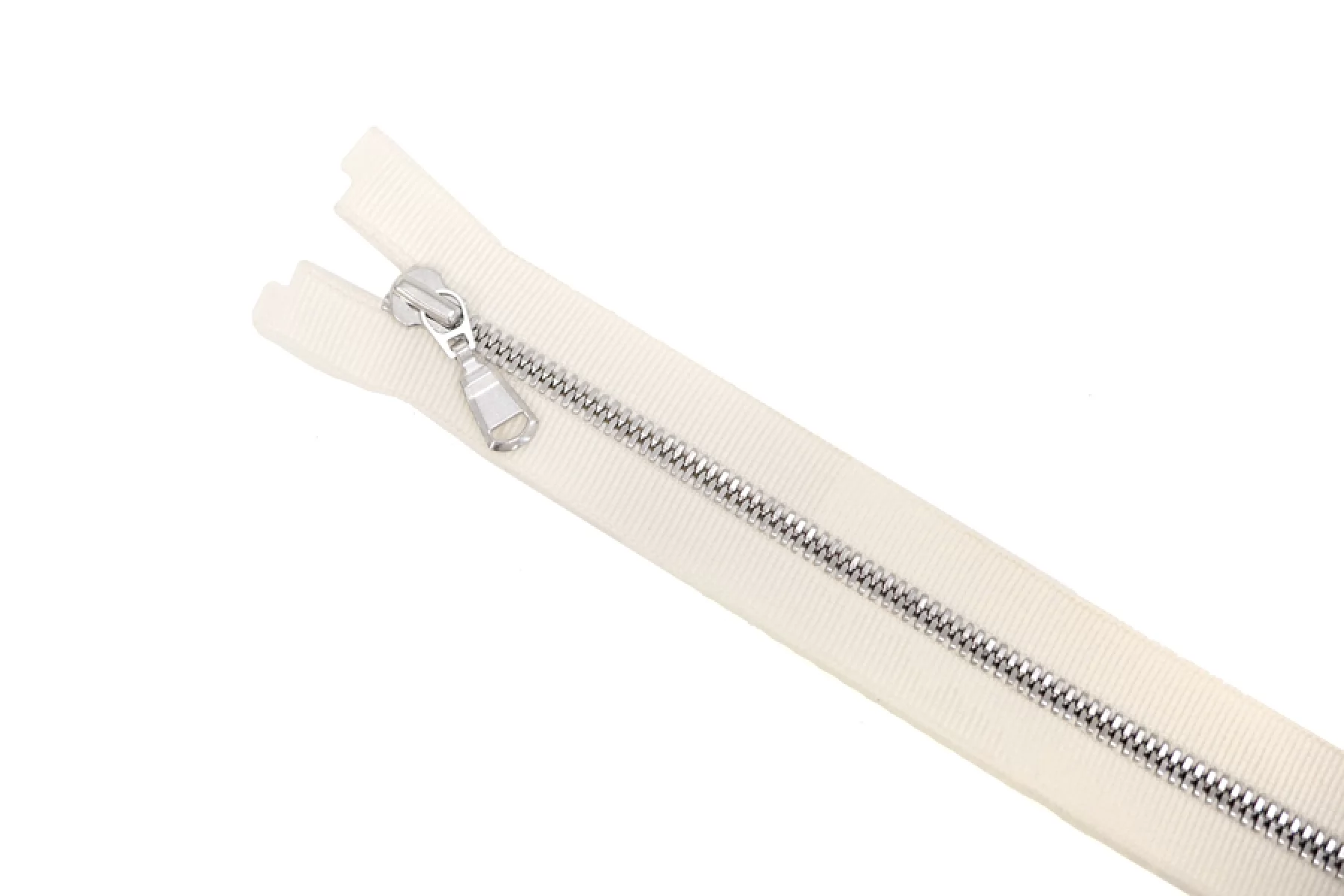 Металлическая молния "Ykk" на репсовой ленте, разъёмная, один замок. Цвет молочный. Цвет зубцов металлический под серебро, слайдер и пулер металлические серебристого цвета. Длина 43 см. Ширина молнии 2,7 см. Ширина зубцов 5 мм.